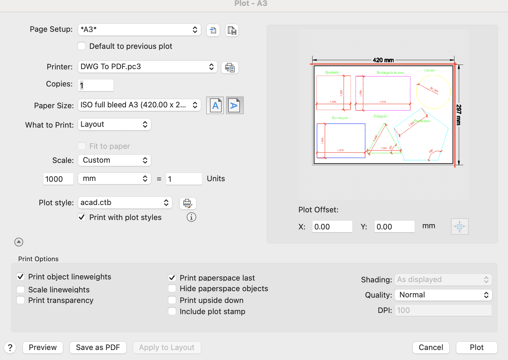 -Configuração do PLOT para garantir a impressão na escala correta e definir as espessuras de linha adequadas.