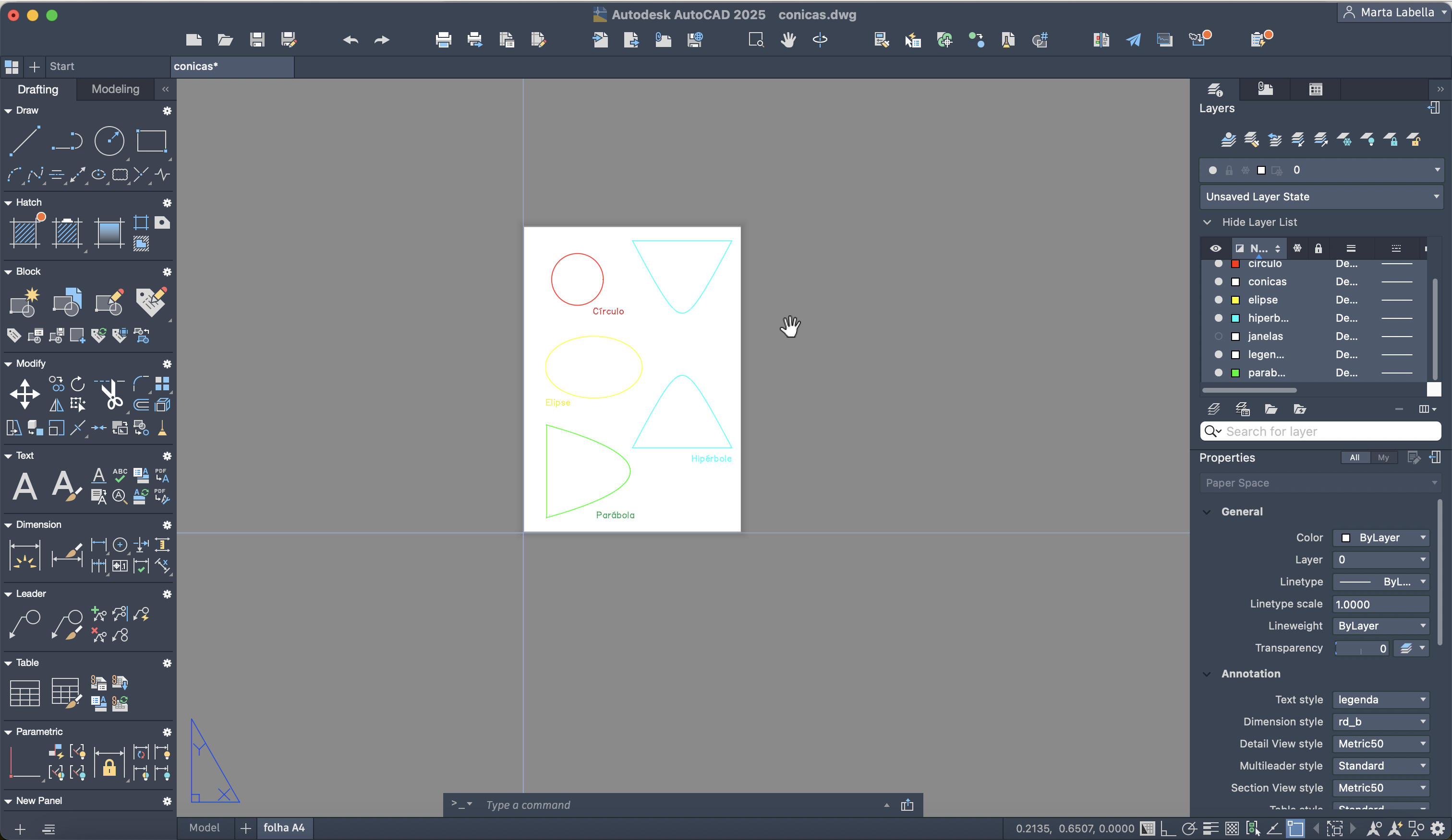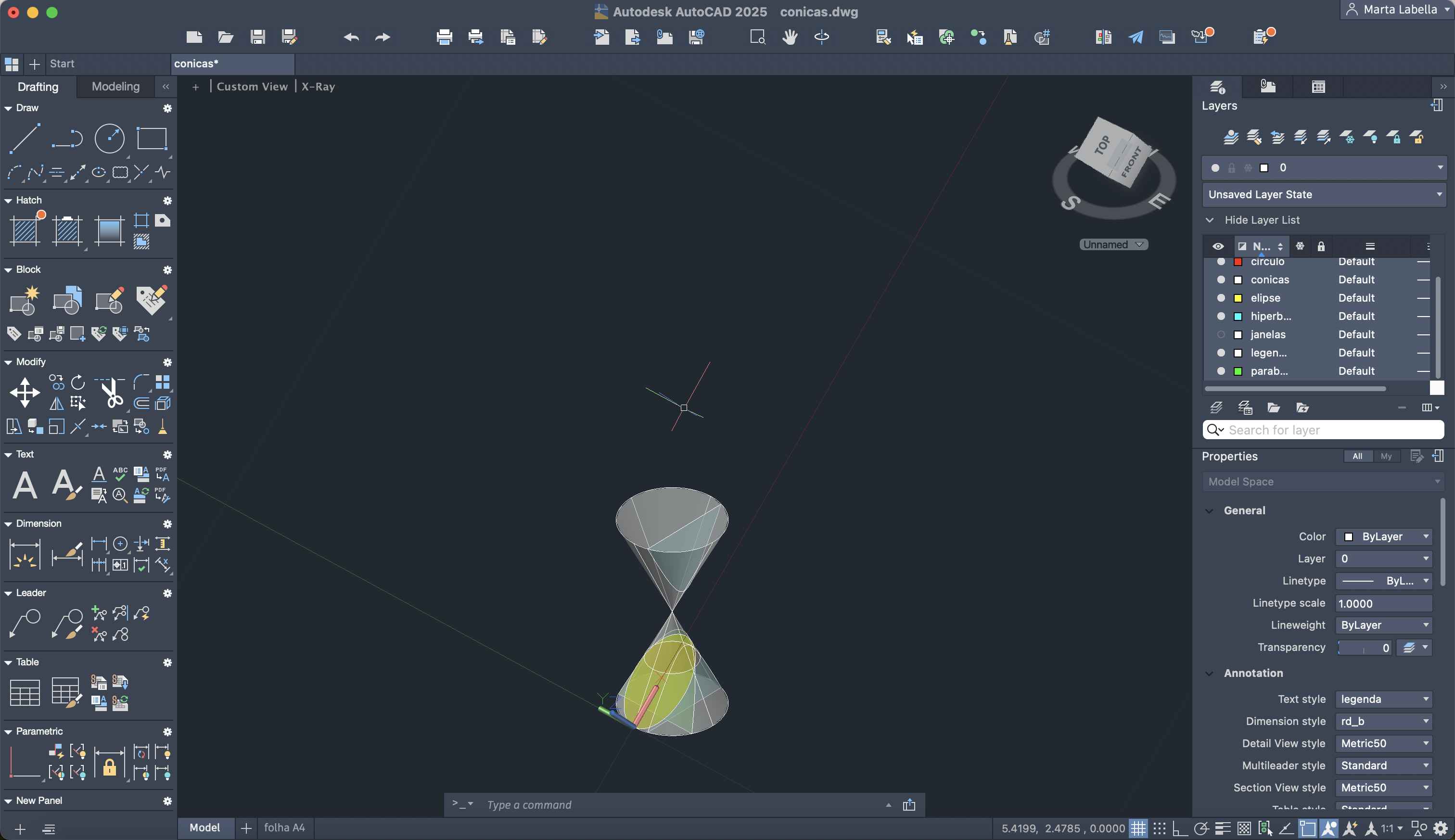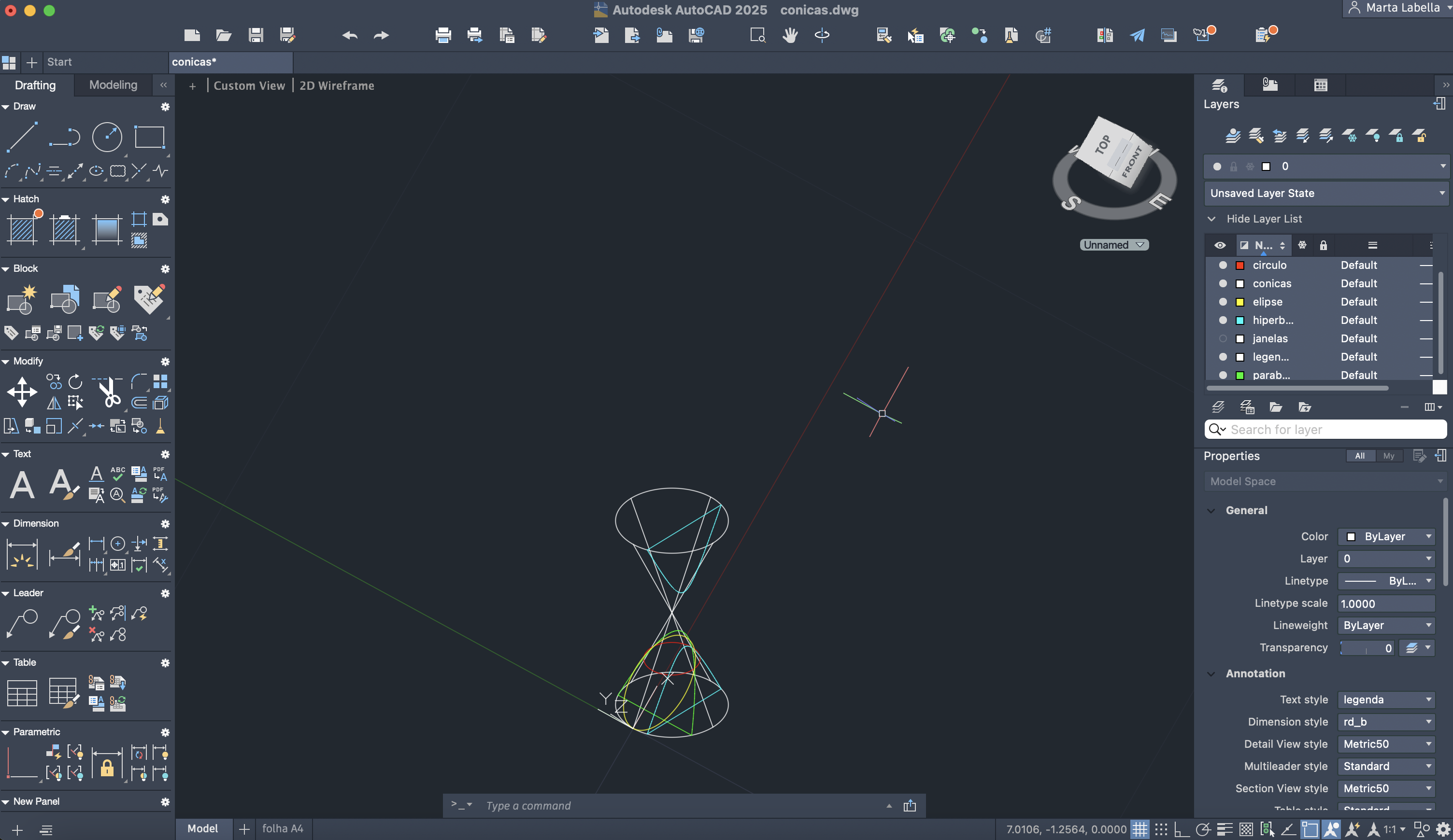 Início de um novo exercício de representação de secções em cones num novo ficheiro Autocad intitulado de Cónicas.
