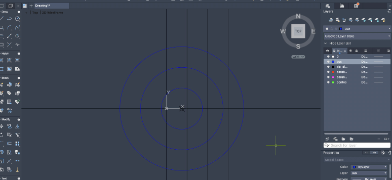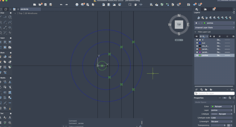 Início de um novo exercício de representação de uma parábola num novo ficheiro Autocad.