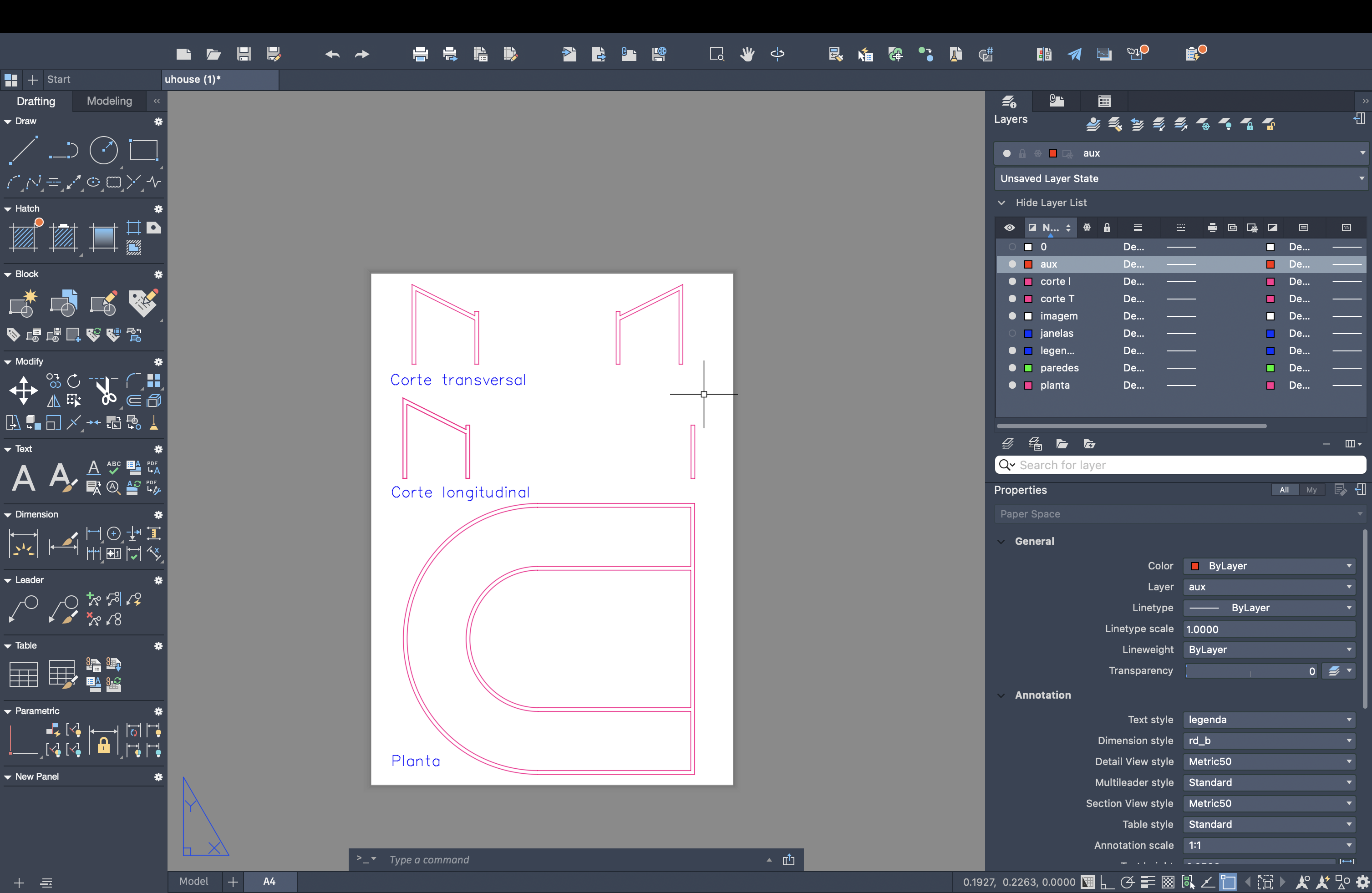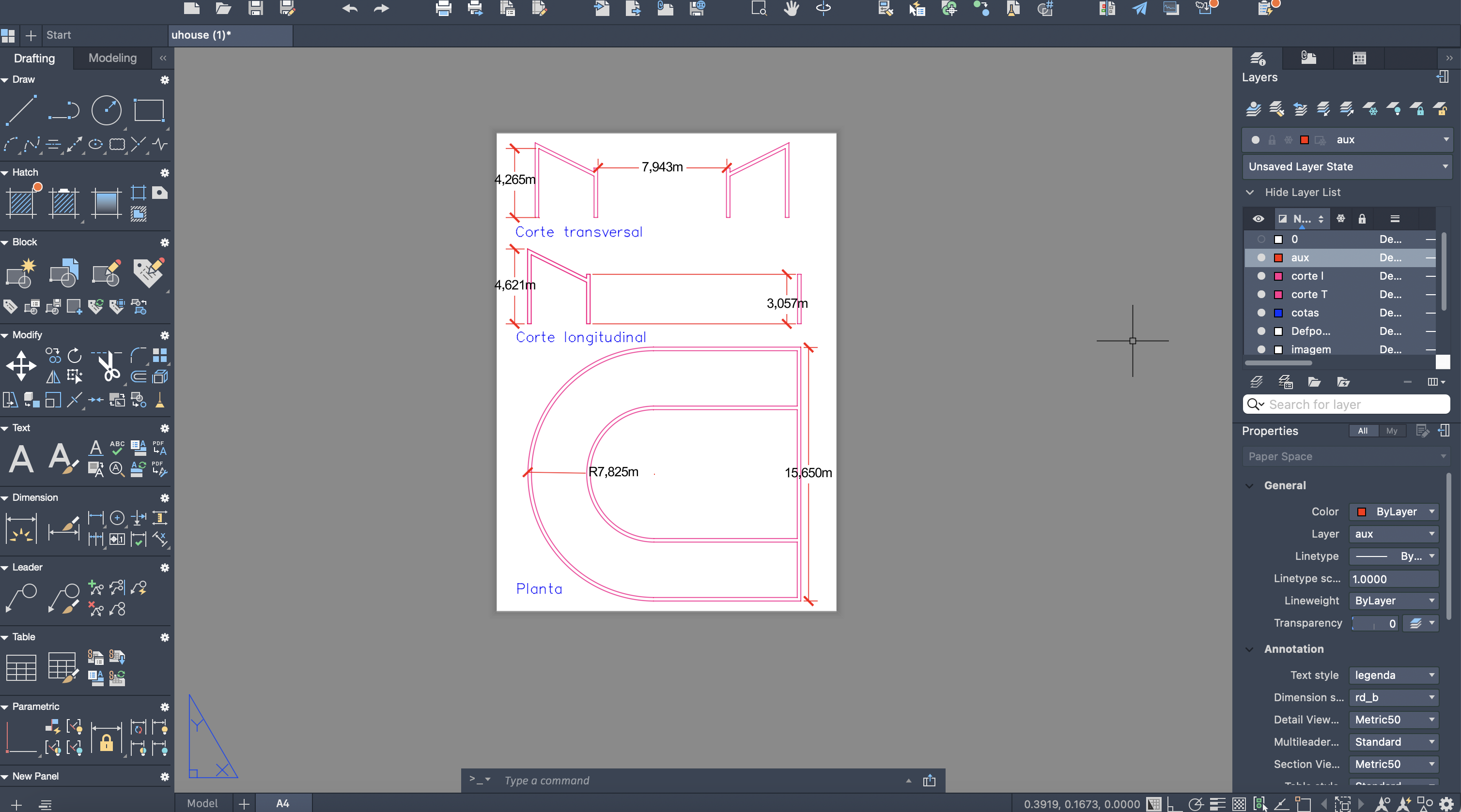 Criação de um layout numa folha A4 com a planta e dois cortes da casa, um longitudinal e outro vertical, com o uso dos comandos MVIEW, ZOOM e UCS.