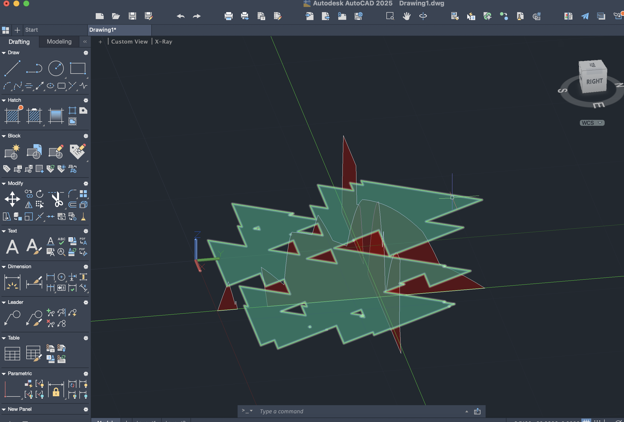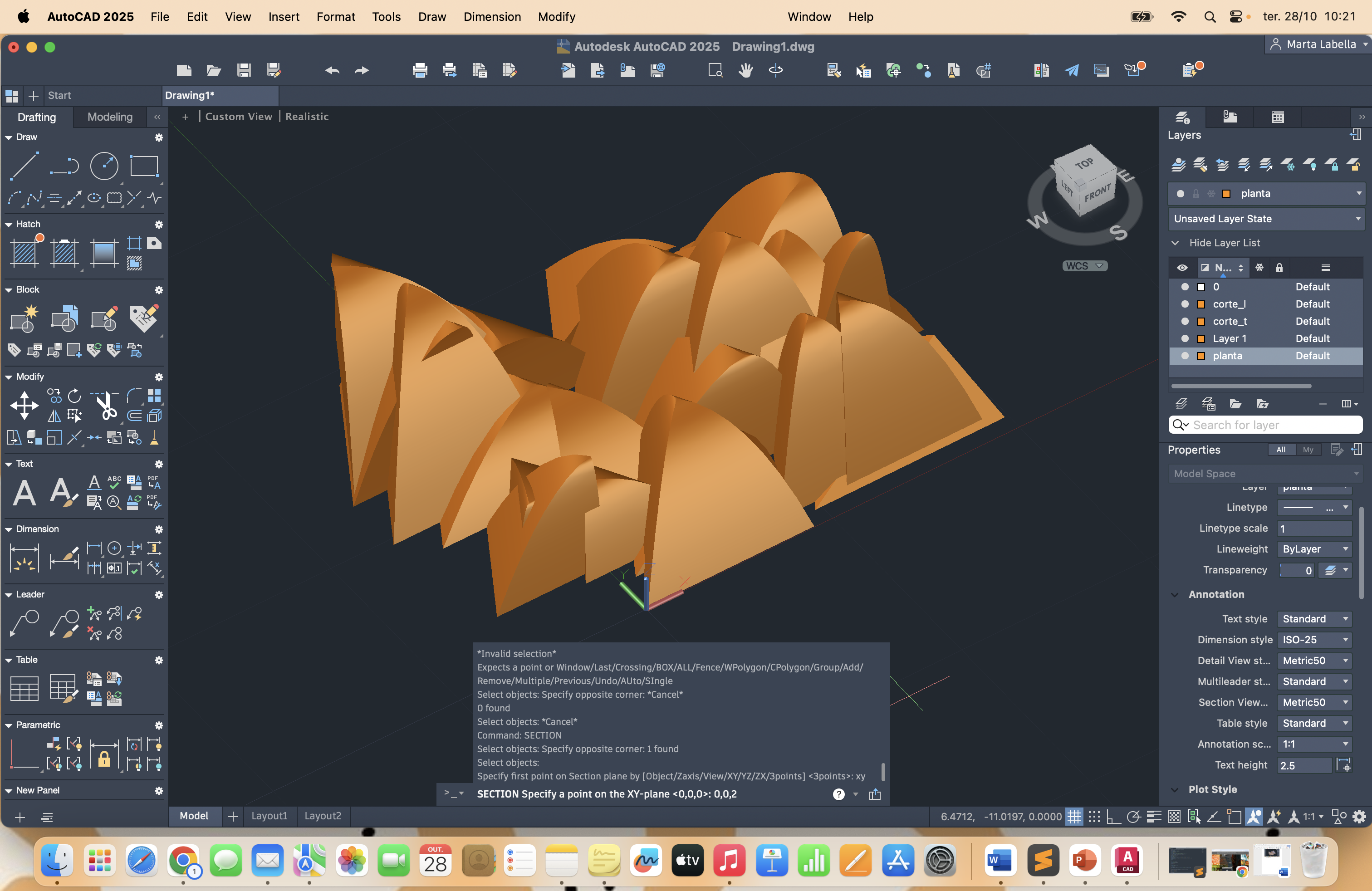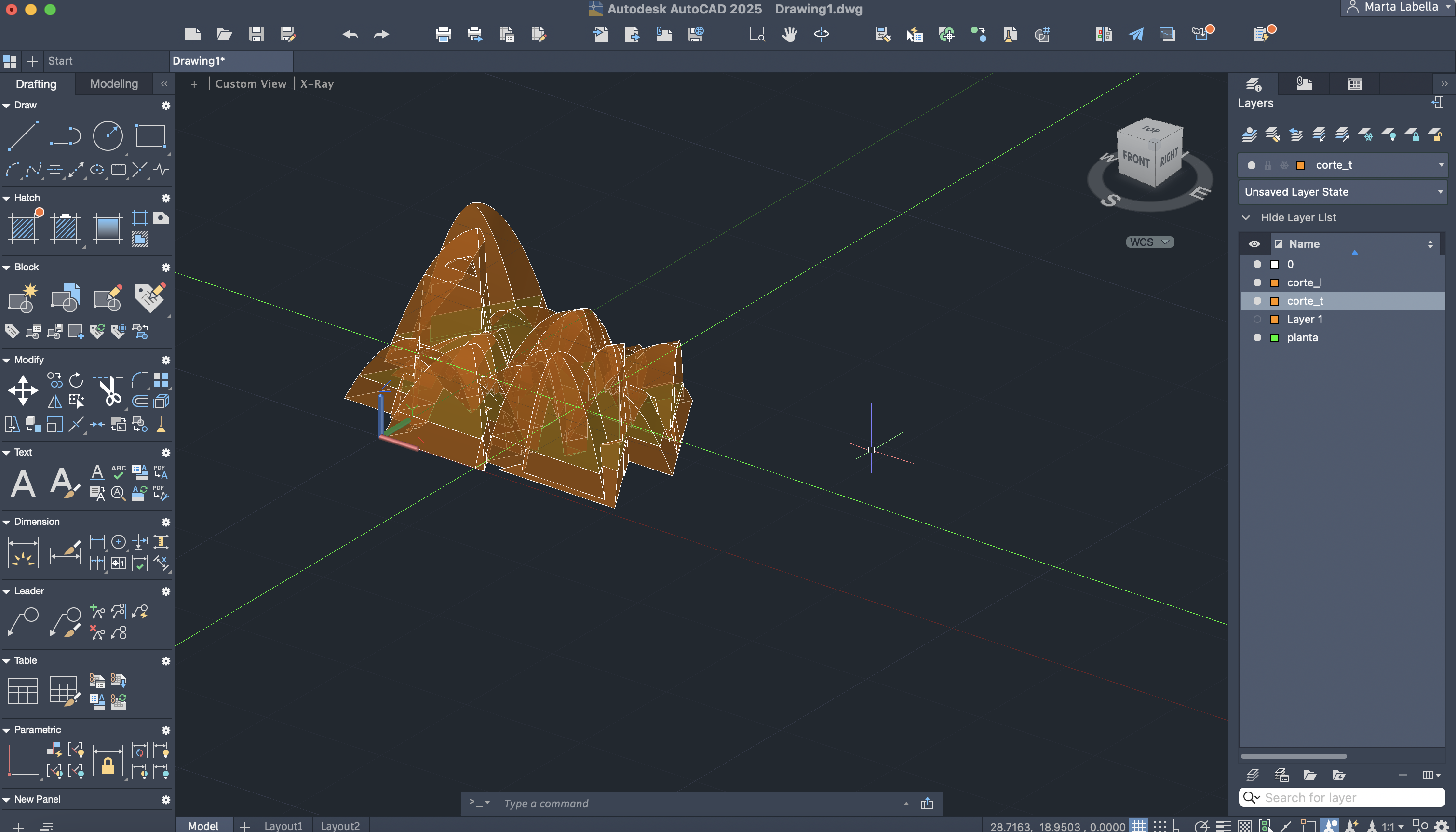 Criação de três cortes (um horizontal e dois verticais), através dos comandos SECTION e LINE.