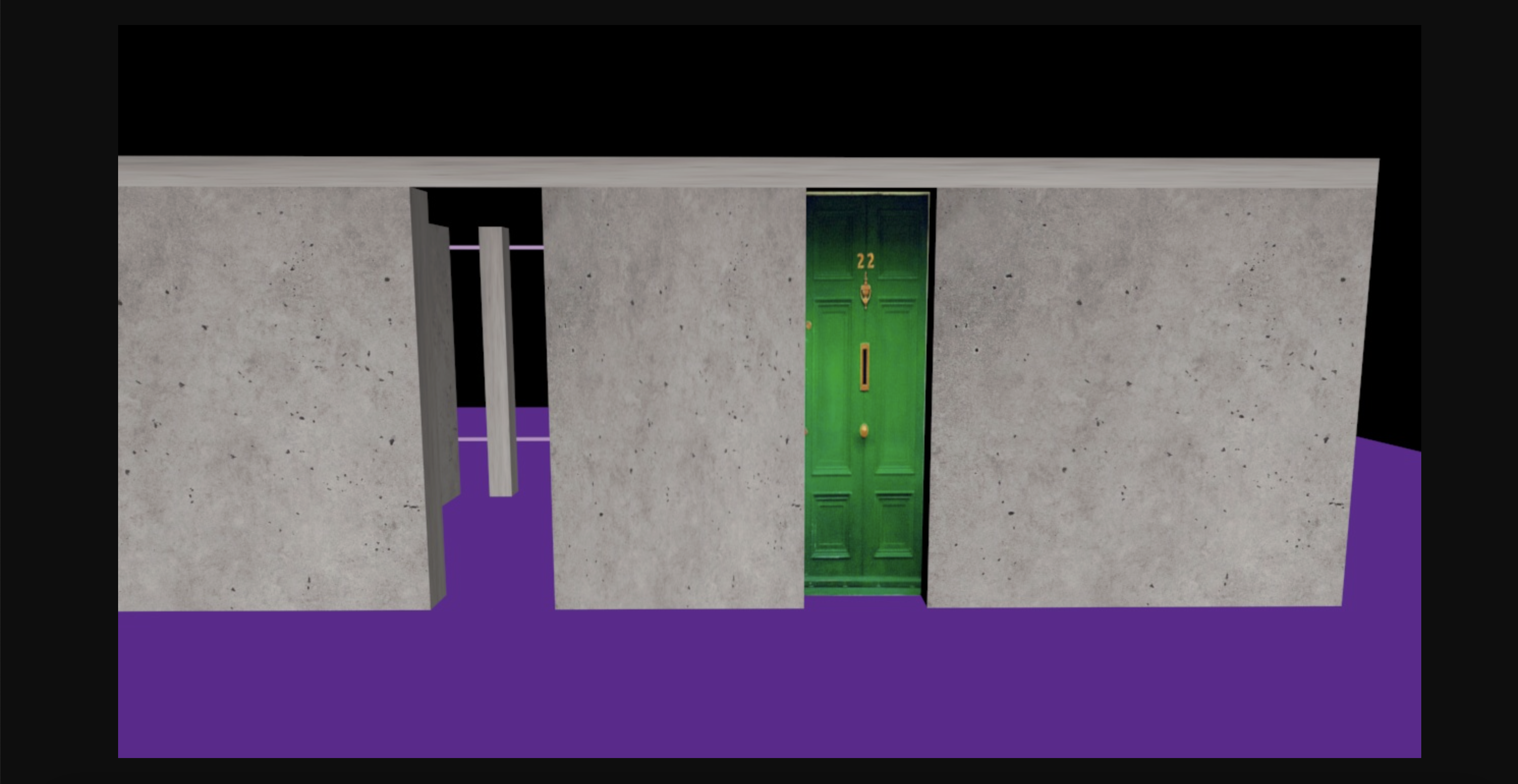 Repetição dos passos anteriores, mosaico e porta, desta vez com a escolha de betão para as paredes e lajes e também de relva para a plataforma onde assenta o T0.