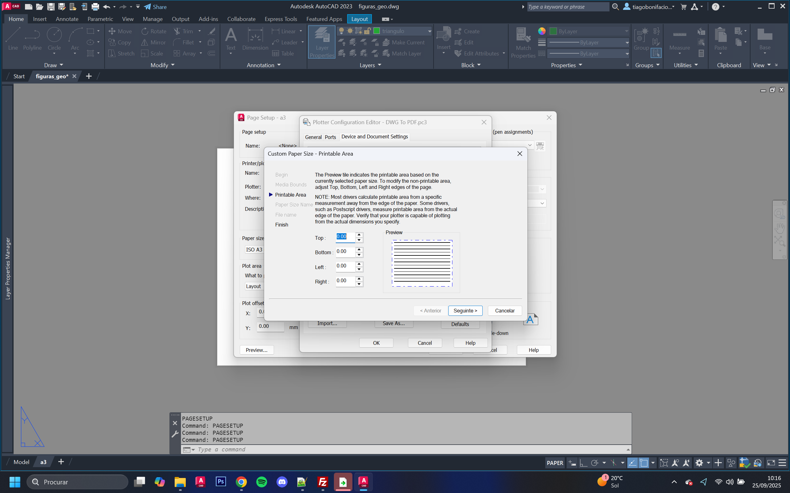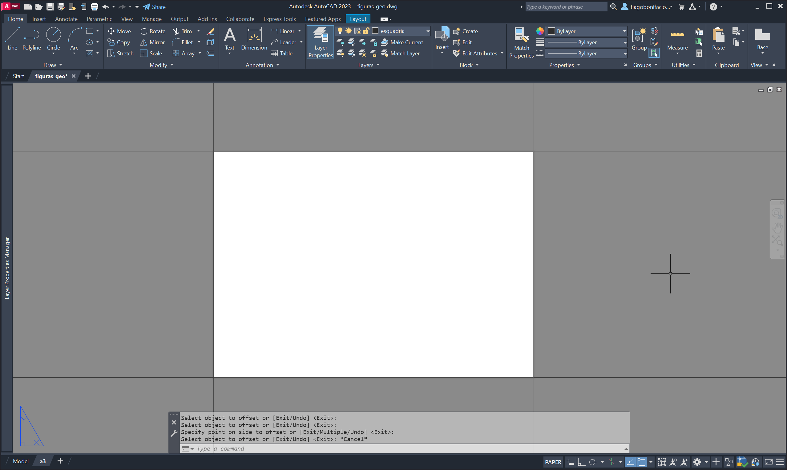 A segunda parte focou-se no trabalho em Model Space e no dimensionamento correto da folha através do Page Setup, configurando margens e definindo o formato A3, aplicando ao longo da aula comandos como XL, FILLET, JOIN, TRIM e OFFSET com a criação de layers específicos para organizar estes comandos.