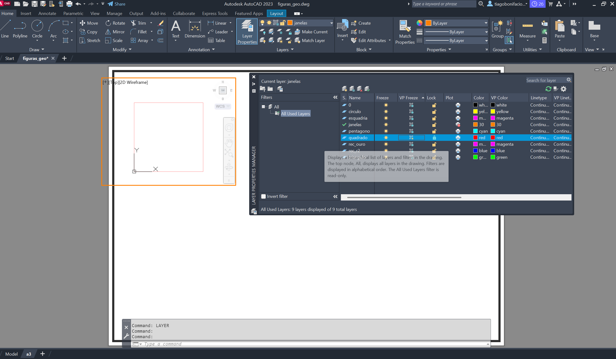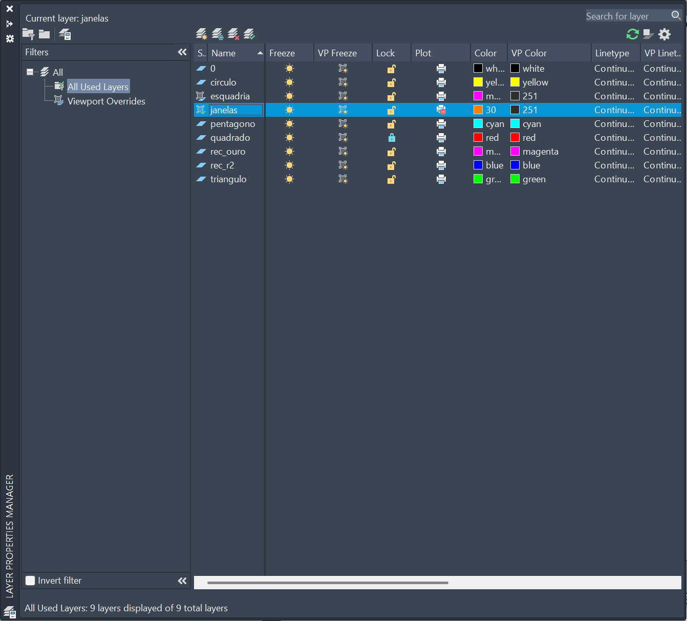 Gestão de layers: criação, bloqueio e freeze para controlar visibilidade e edição de elementos.