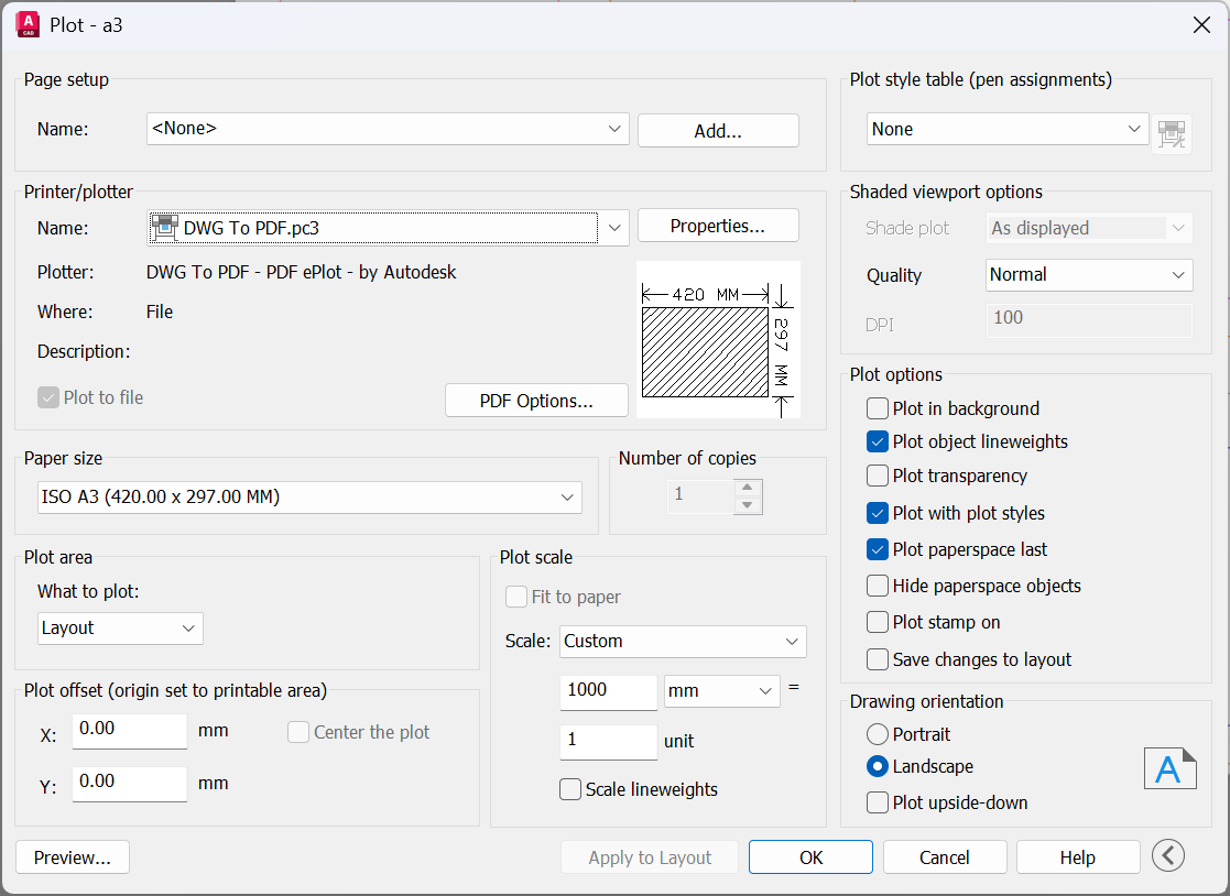 Configuração de plot para impressão em escala correta e definição de espessuras de linha.