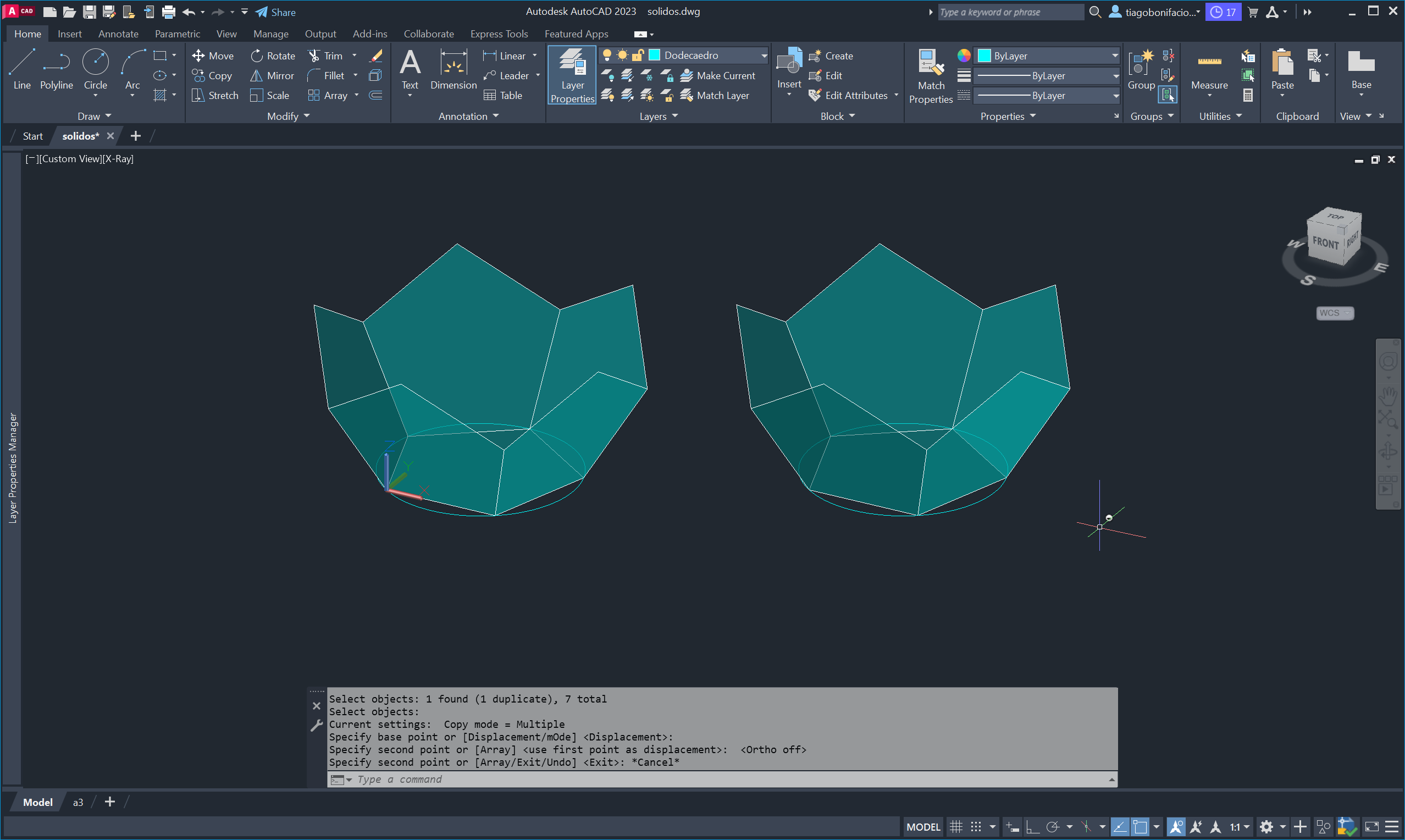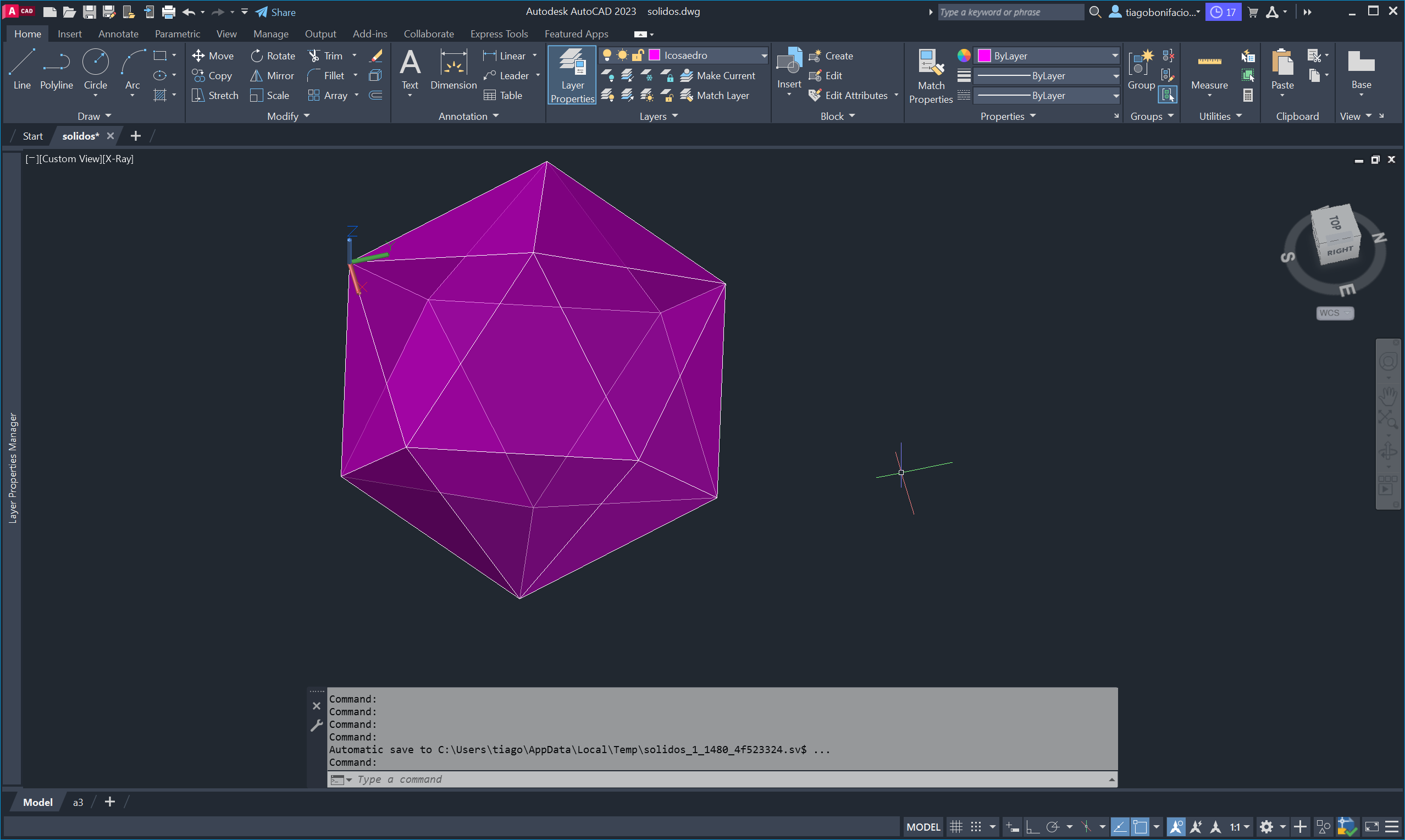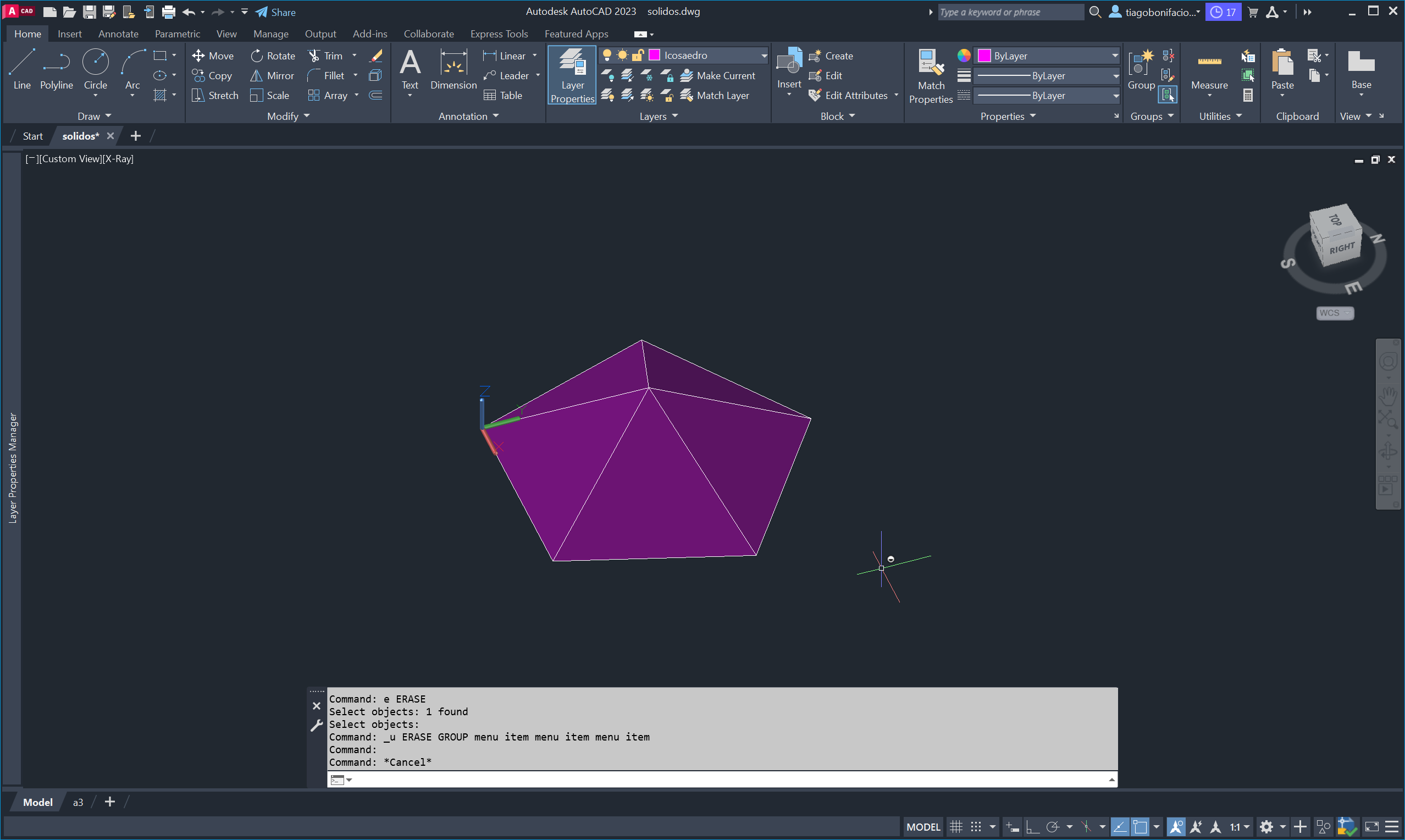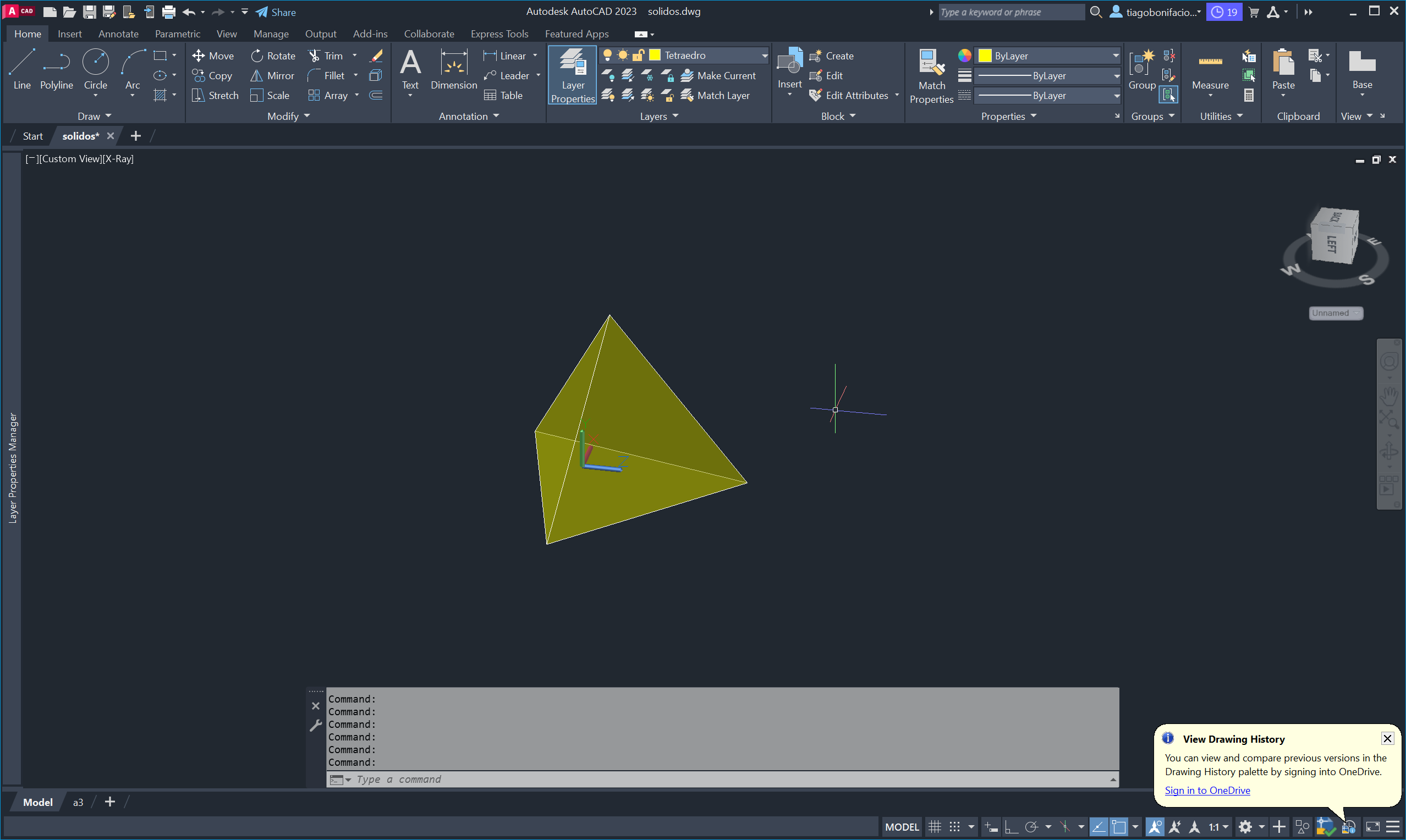 A aula iniciou com a limpeza do ambiente de trabalho através do comando LAYDEL para deletar layers desnecessários do layout. Posteriormente, focámo-nos na construção de sólidos platónicos, começando pela criação de um cubo, seguido de um tetraedro e finalmente um octaedro.