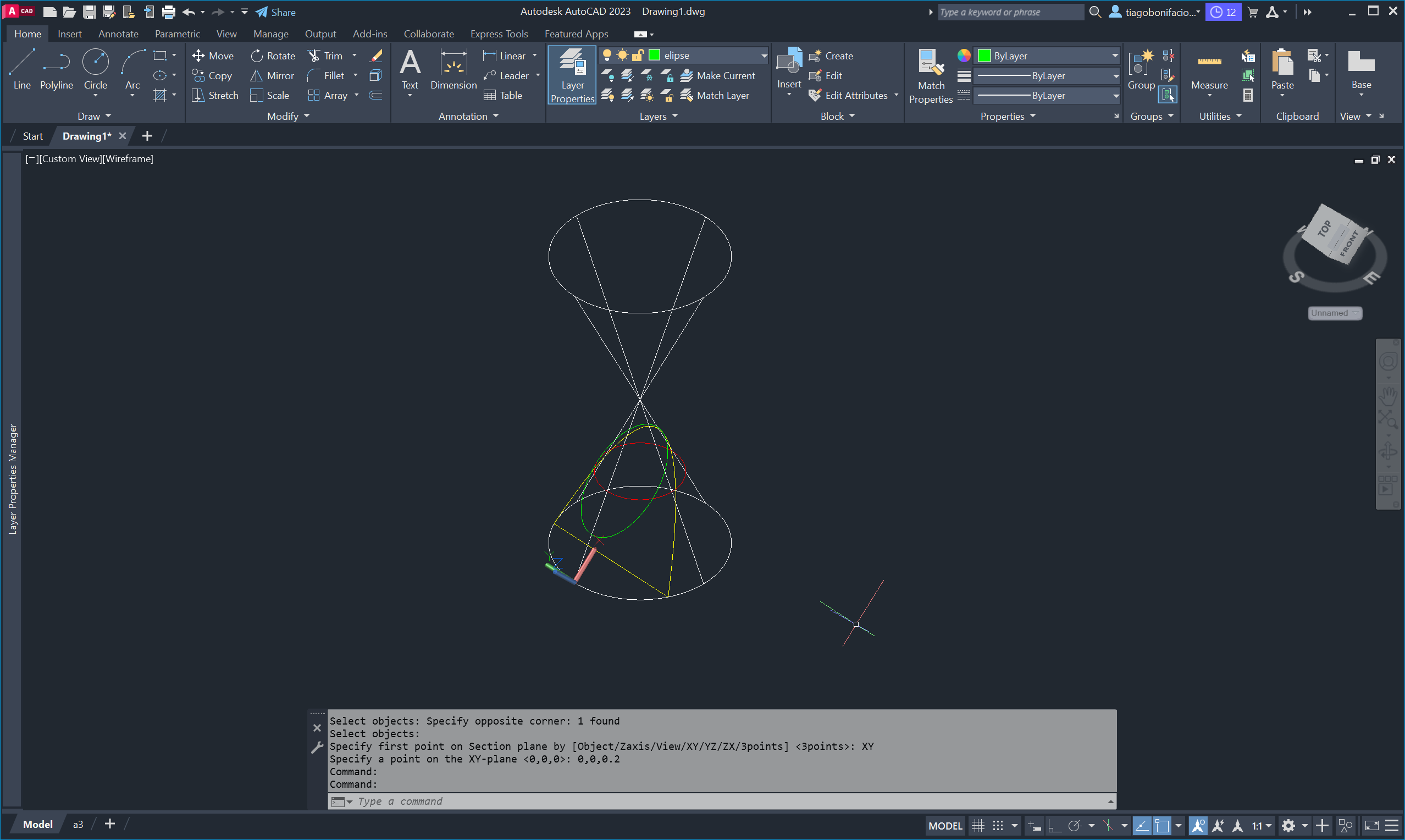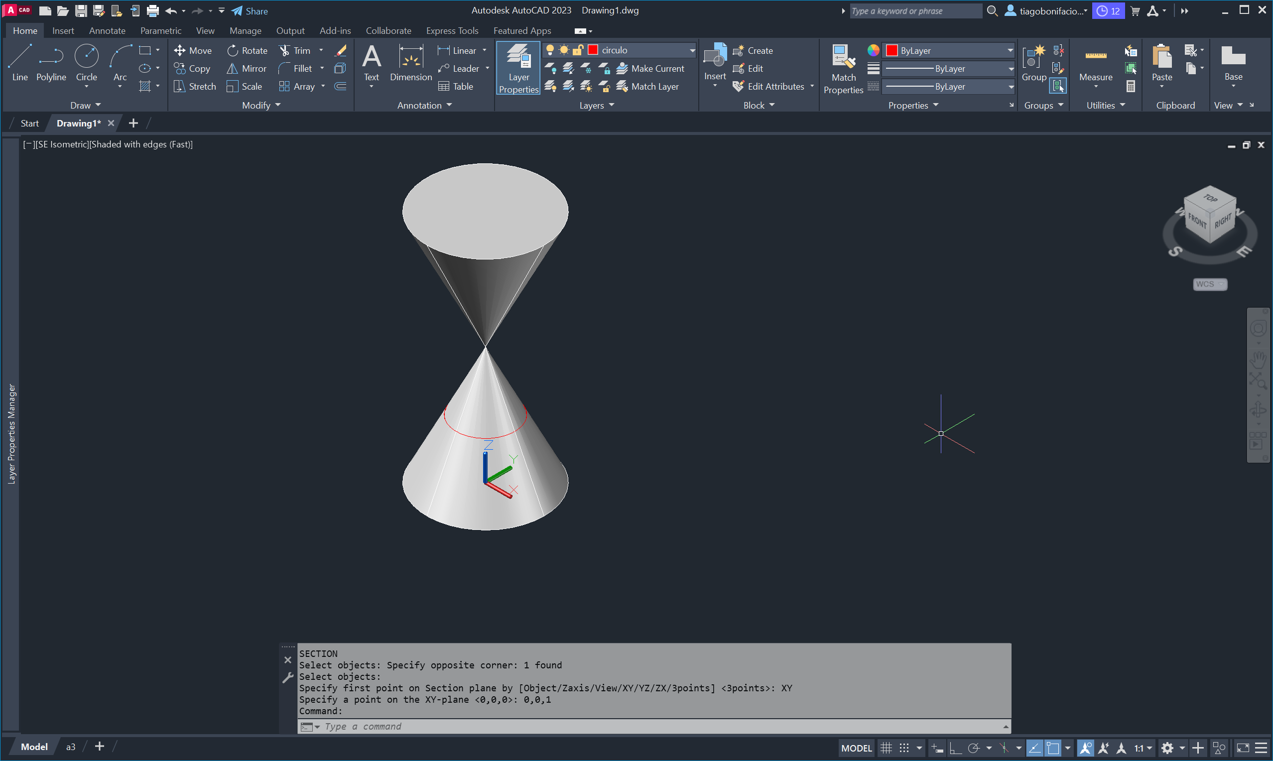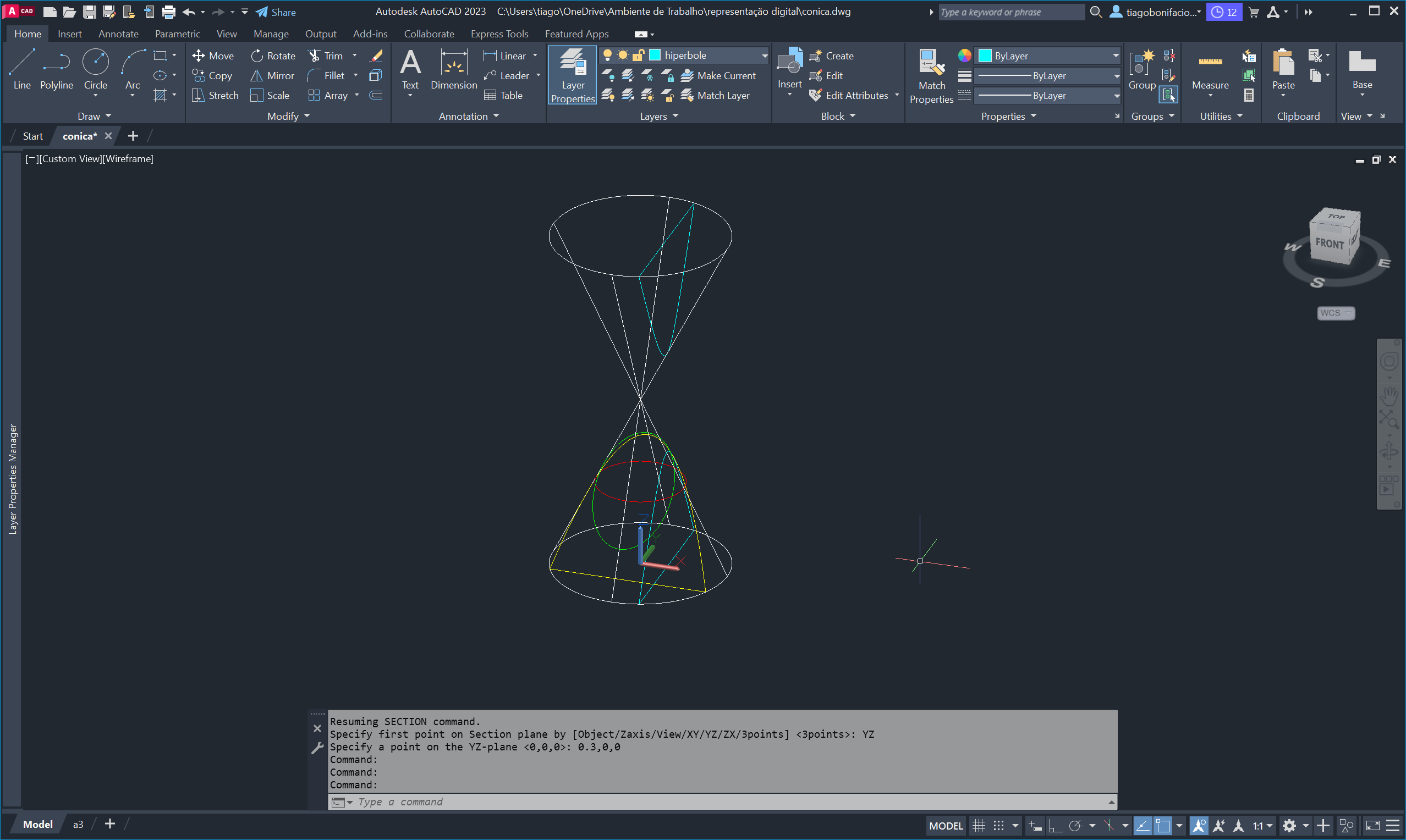 para ajustar os eixos de trabalho e o comando SECTION para seccionar o cone em