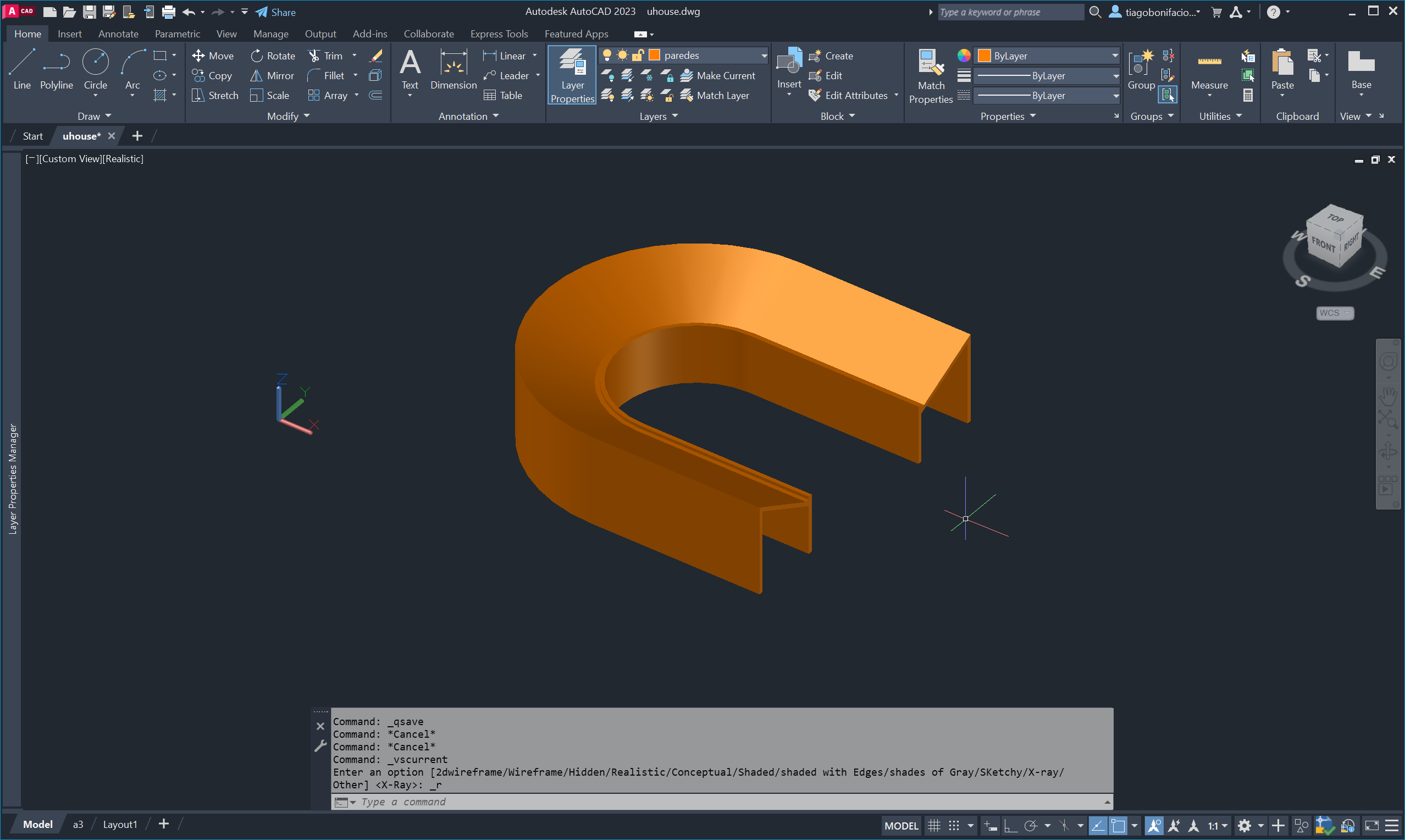 Iniciámos depois o projeto da U-House, utilizando XLines e o comando Scale para dimensionar corretamente a planta importada, usando como referência a bancada de cozinha (60cm) para ajustar à escala real, e concluímos fazendo offset de uma XLine para representar a espessura de uma parede de betão de 20cm.