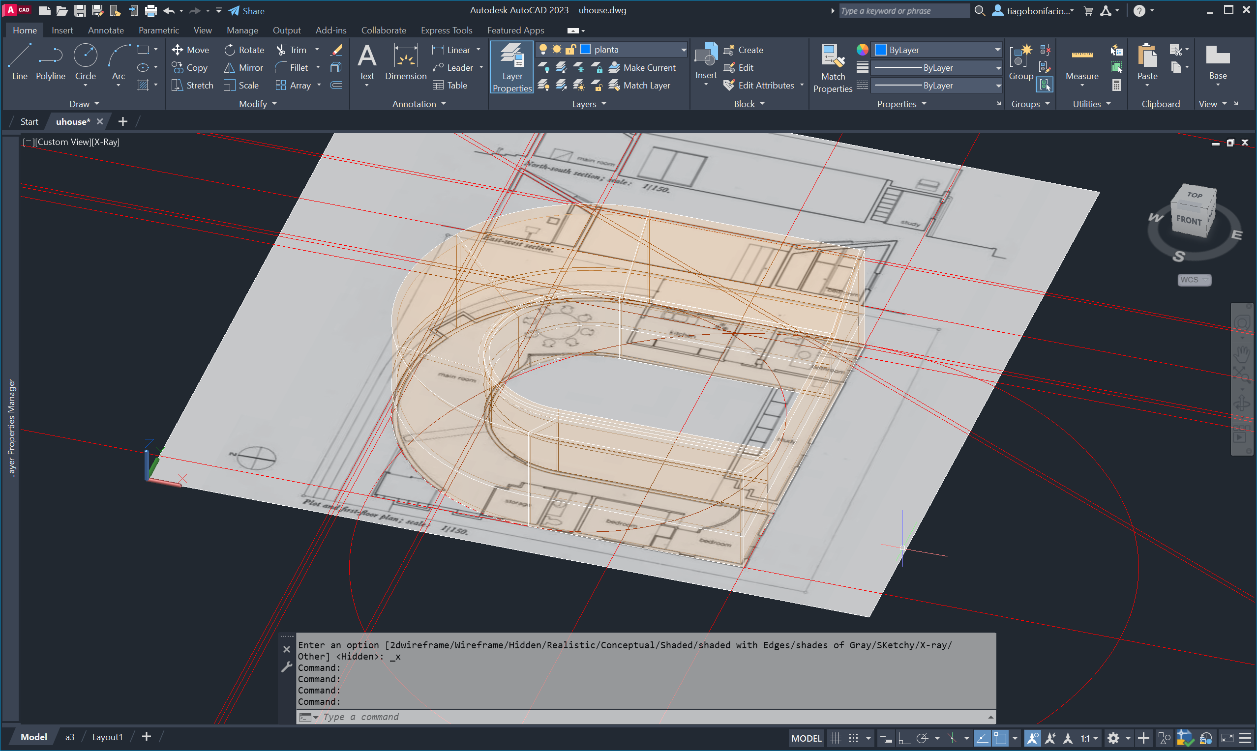 Finalizámos alterando novamente o UCS e utilizando o comando SECTION para gerar cortes seccionais do edifício.