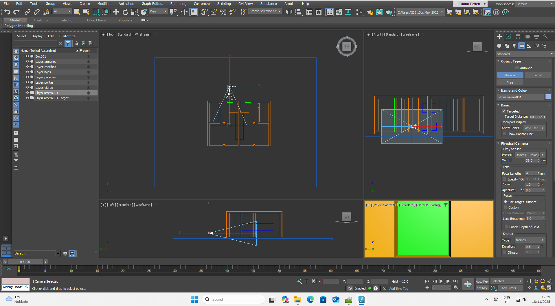 - Utilizamos focos de luz em photometric - target light e experimentamos ângulos de luz diferentes: com uma luz selecionada, Modify - Spotlight Parameters.