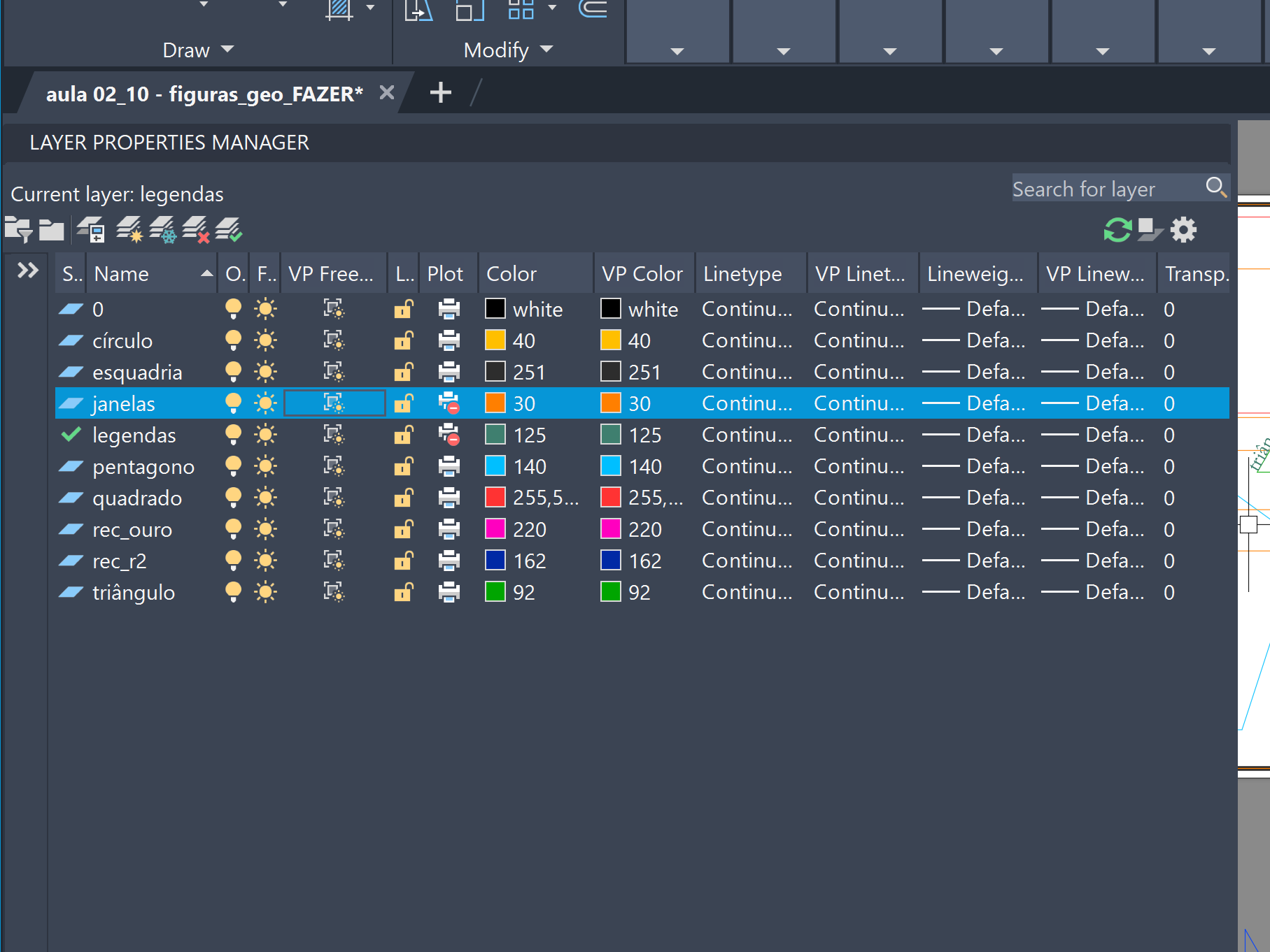 FREEZE, com o objetivo de controlar a visibilidade e a edição dos diferentes elementos do desenho.