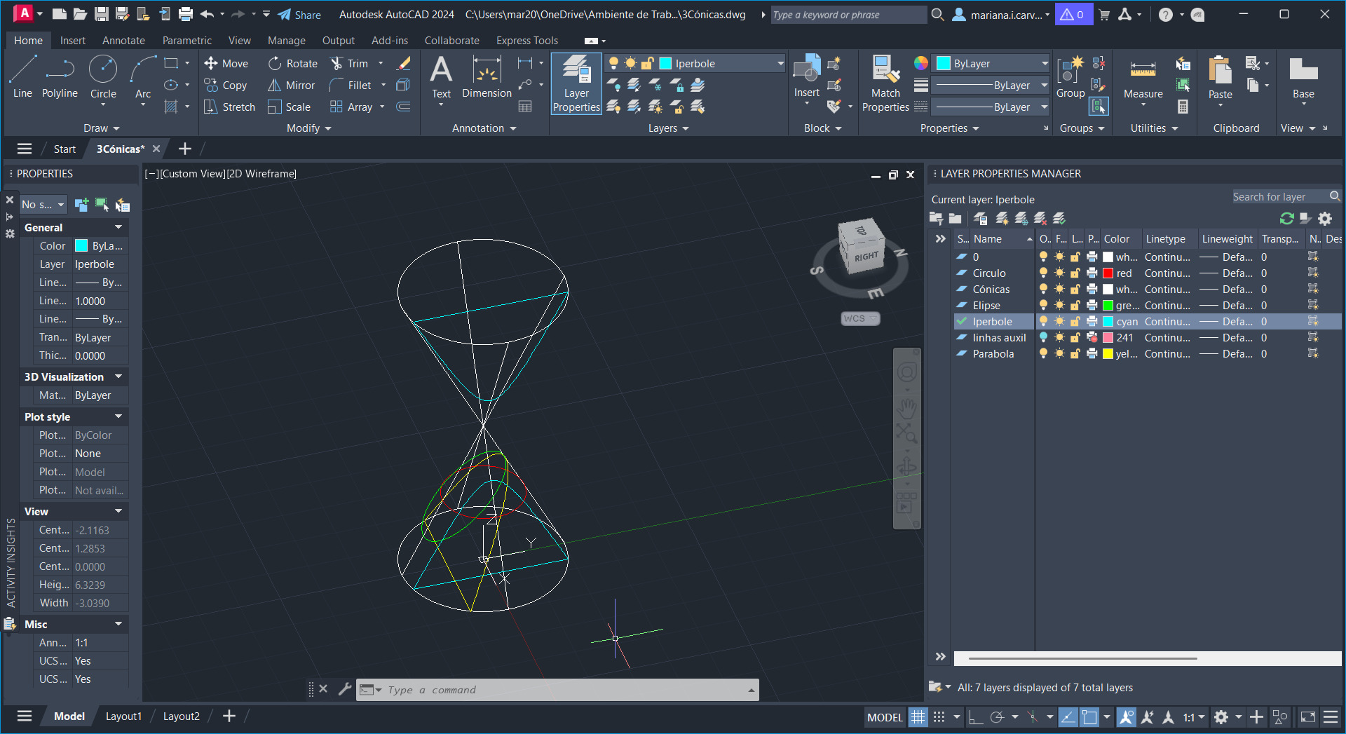 Execução de dois cones através do comando Cone de forma que os mesmos formem simetria (utilização coordenadas positivas e negaticas). Concretização de elementos tais como cículo, elipse, parabolé e iperbole, utilizando comandos Ucs para mudar o eixo. Xline de forma a auxiliar e Section, de modo a efetuar um cortar pelo sólido e originar a secção pretendida. Trabalho de coordenadas e sua importâcia de localização (X,Y,Z).