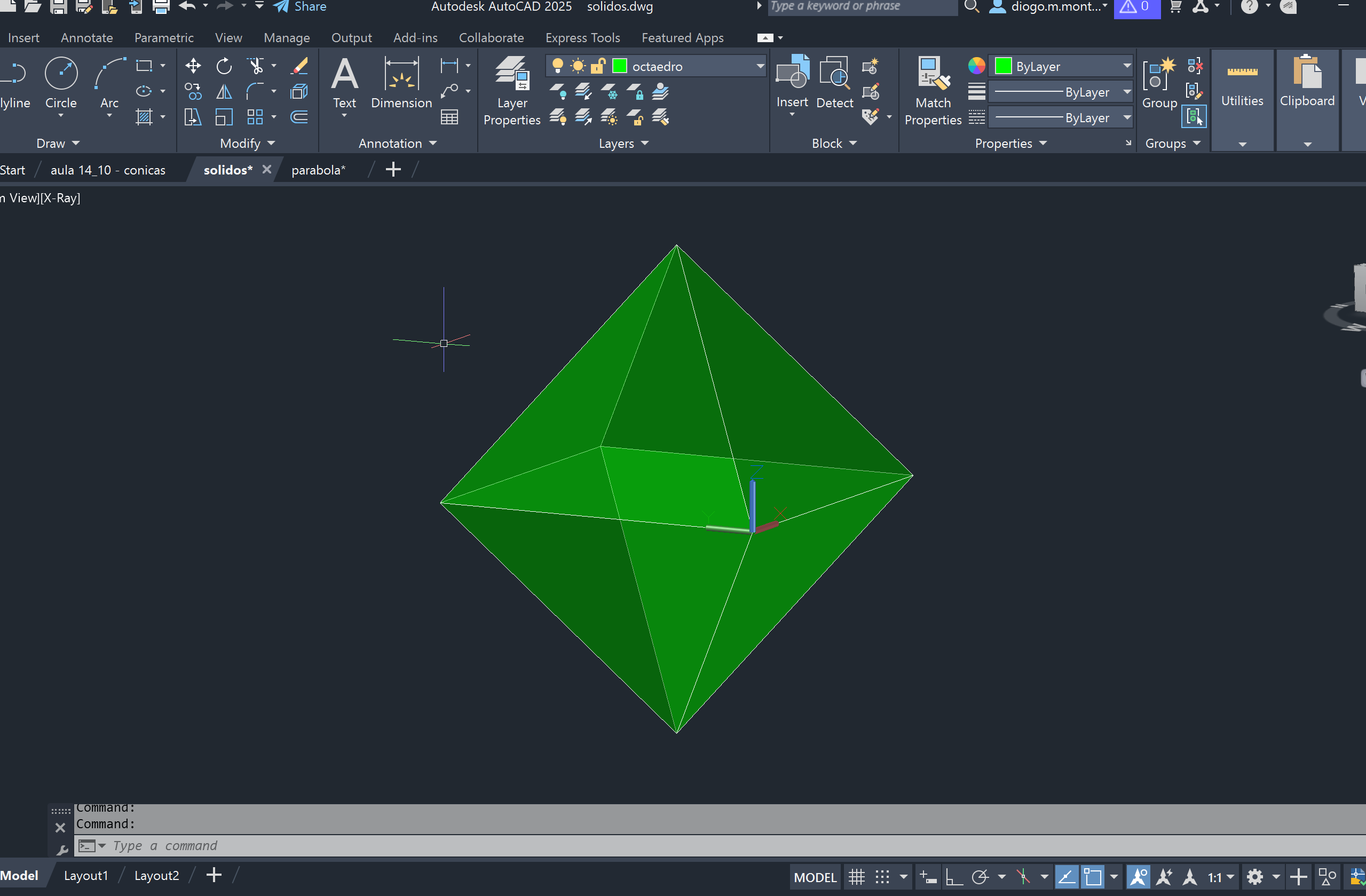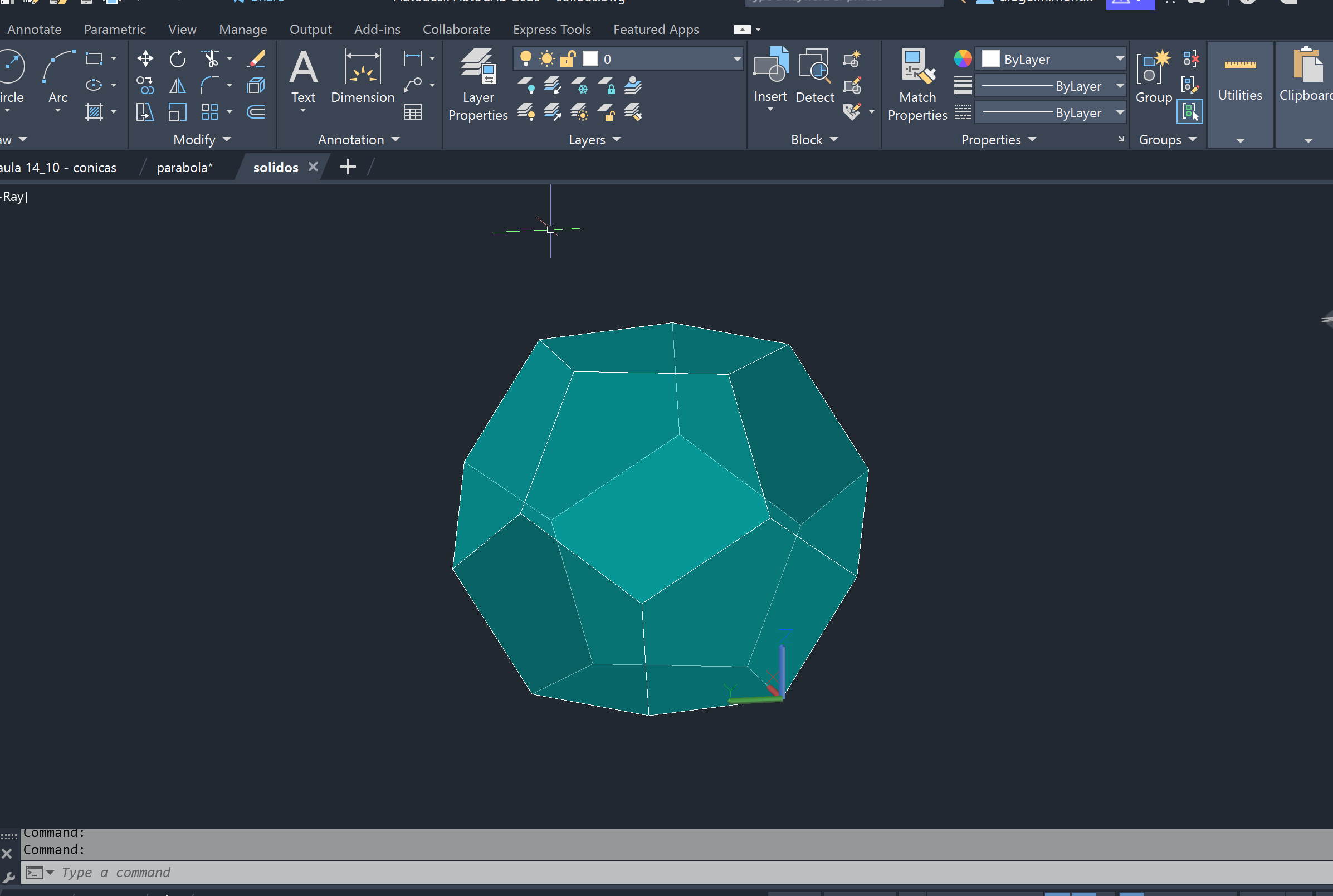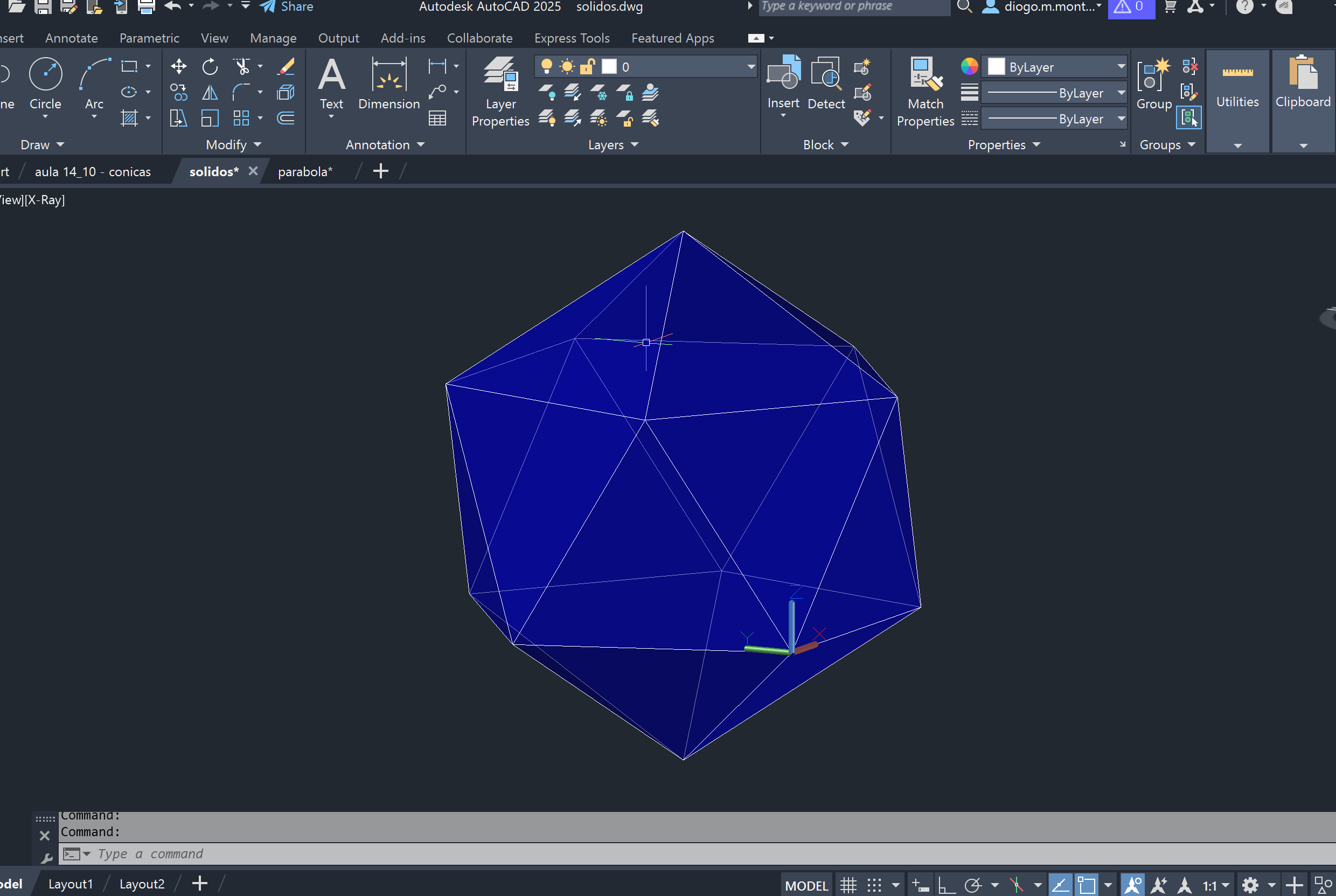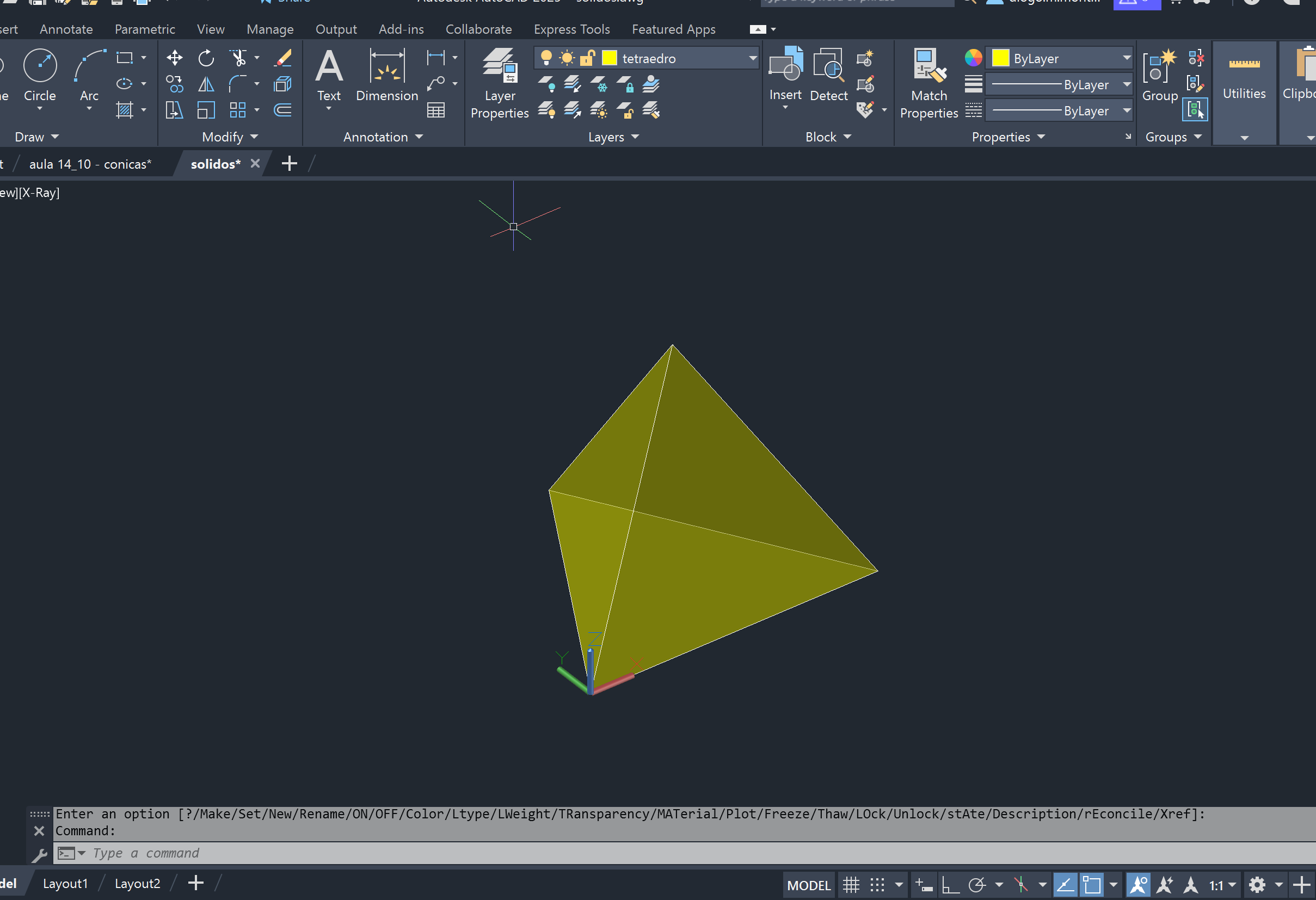 A aula iniciou com a limpeza do ambiente de trabalho através do comando LAYDEL para deletar layers desnecessários do layout. Posteriormente, focámo-nos na construção de sólidos platónicos, começando pela criação de um cubo, seguido de um tetraedro e finalmente um octaedro.