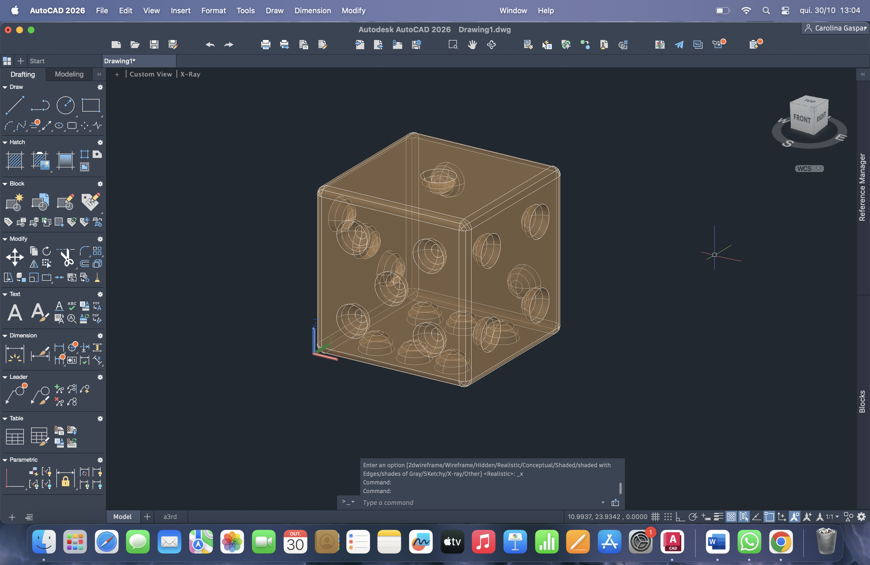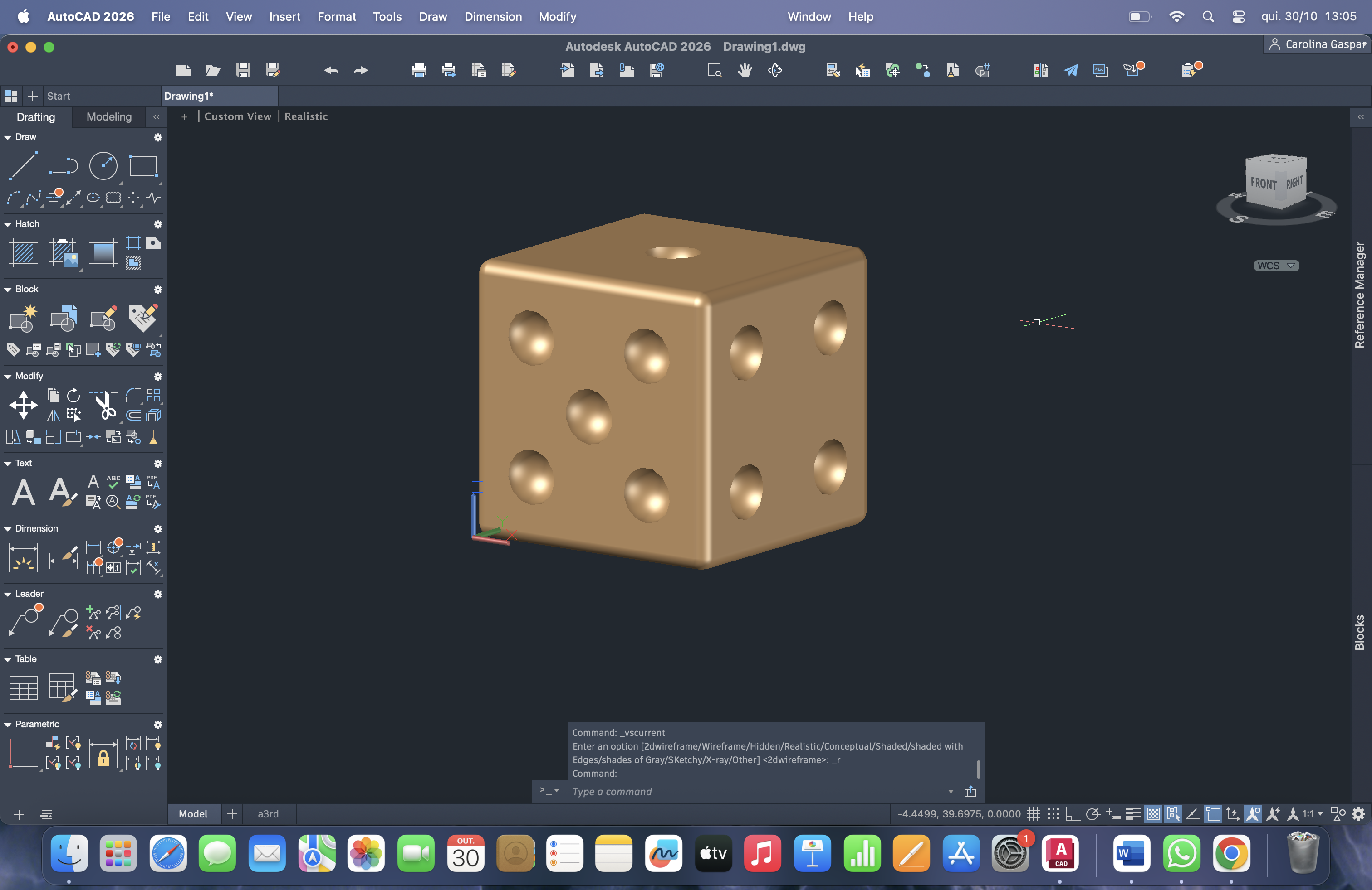 Construção de um dado através da realização de um cubo e seis esferas. Utilização de novos comandos no Autocad (subtract).