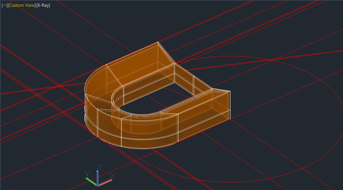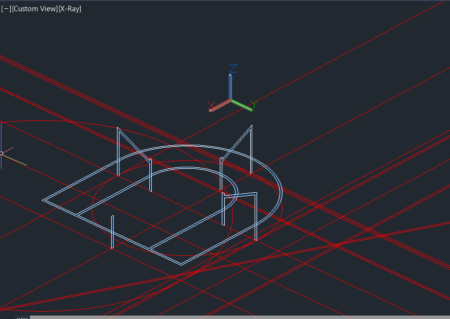 Criação de linhas auxiliares para fazer o contorno das paredes tanto na planta como no corte dados, para passar ao plano tridimensional e criar a forma da casa com auxílio de comandos como: ROTATE, EXTRUDE, PLINE. Posteriormente, fez-se uma nova planta a uma cota específica e cortes num plano escolhido - SECTION).