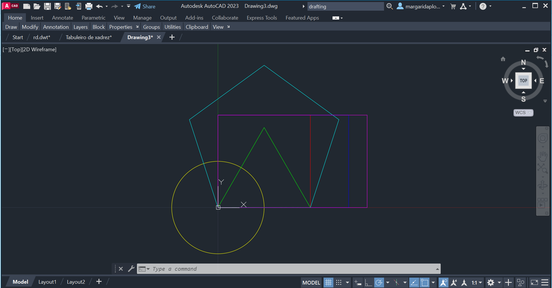 Elaboração de vários polígonos em AutoCAD: Quadrado, retângulo, círculo, pentágono e triângulo.