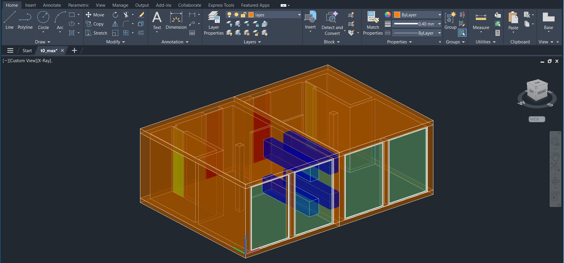 Realização de um novo exercício a partir de um modelo em AutoCad de nome T0. Colocação dos elementos pré-existentes nas respetivas layers e criação de um novo modelo, através dos comandos MIRROR e UNION, entre outros.