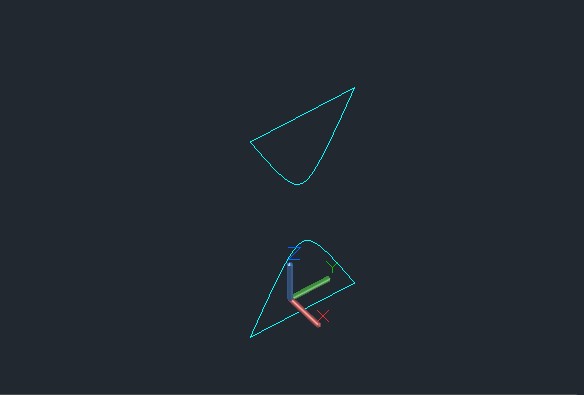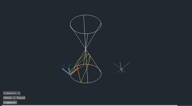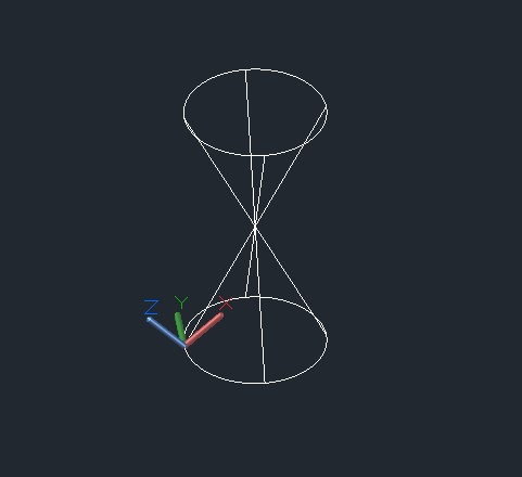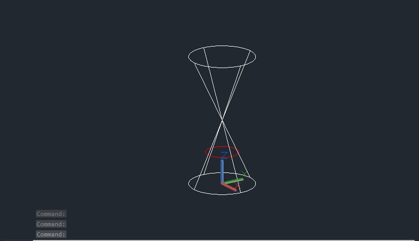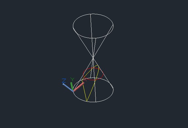 Para fazer a parabola fizemos passar uma reta horizontal tangente a base de um dos cones utilizando o comando xline e alteramos o ucs utilizando o comando nea para escolher um ponto da reta.