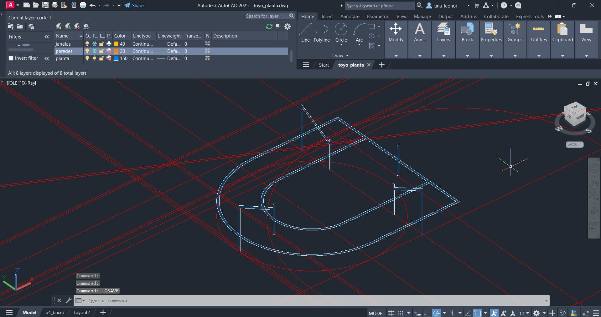 Inicio do estudo da planta, no plano tridimensional. Introdução de diversas linhas, através do comando X-LINE.