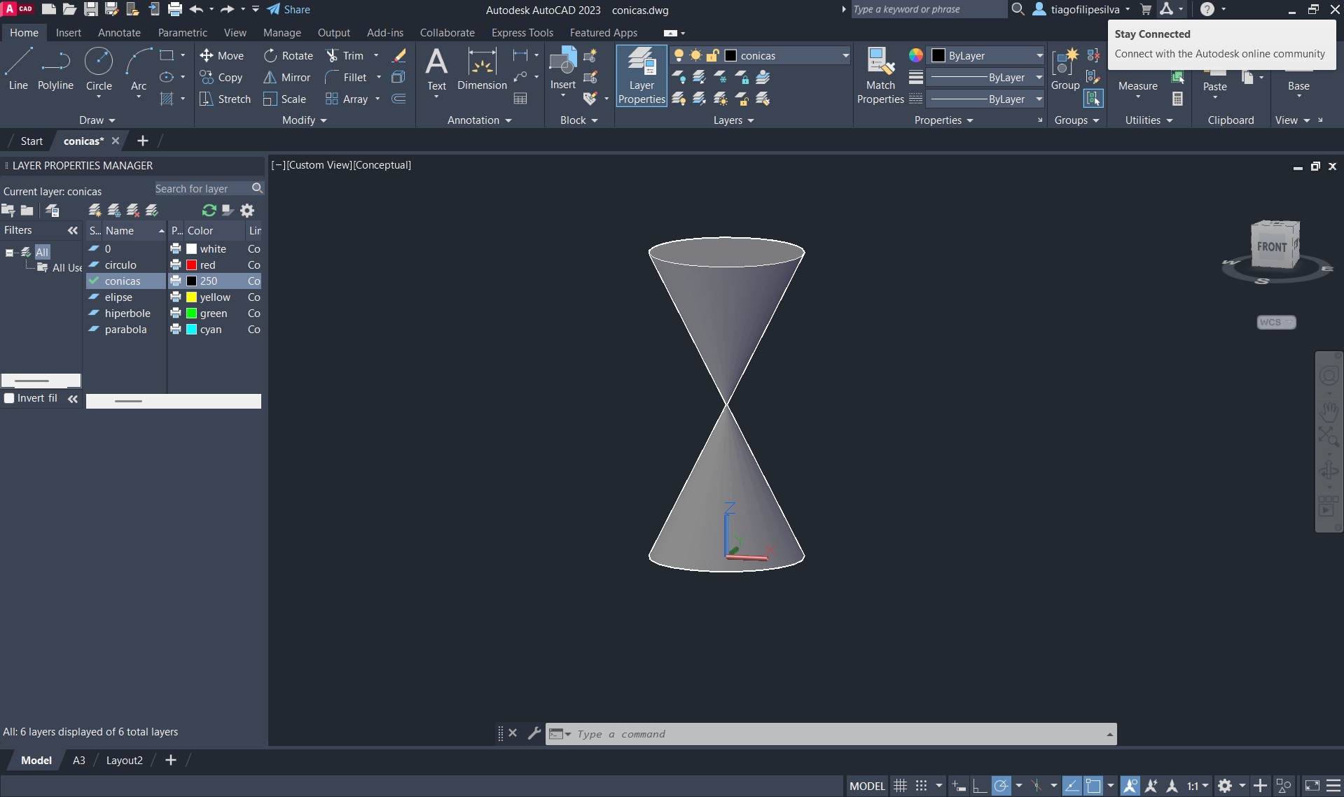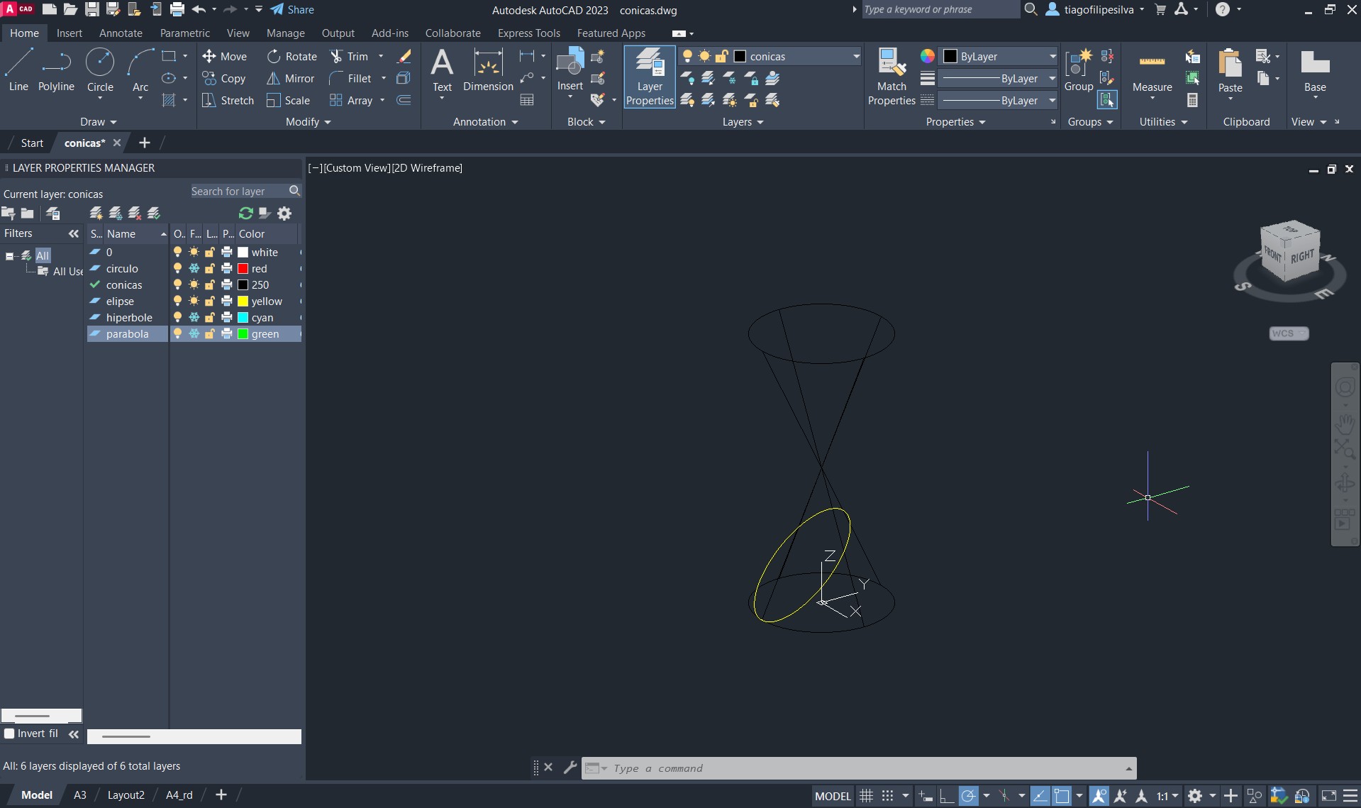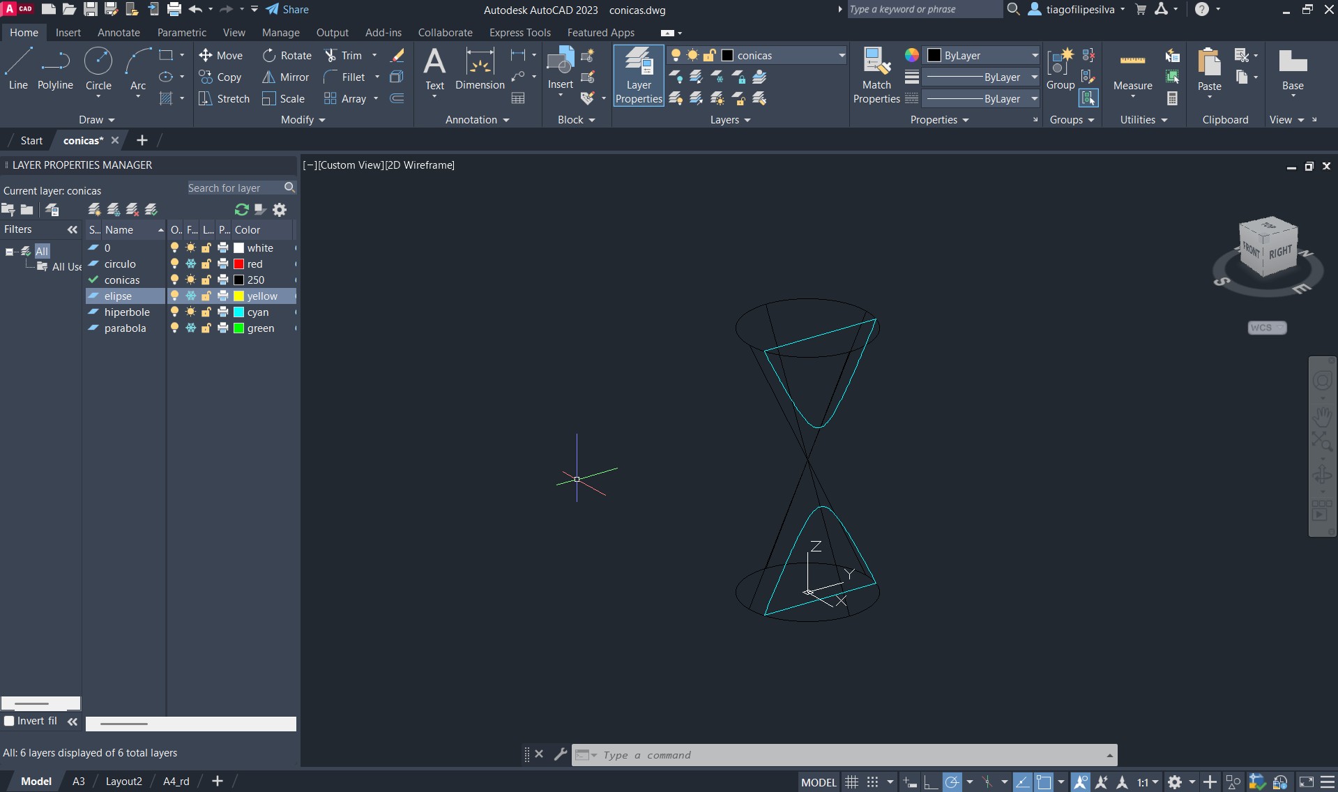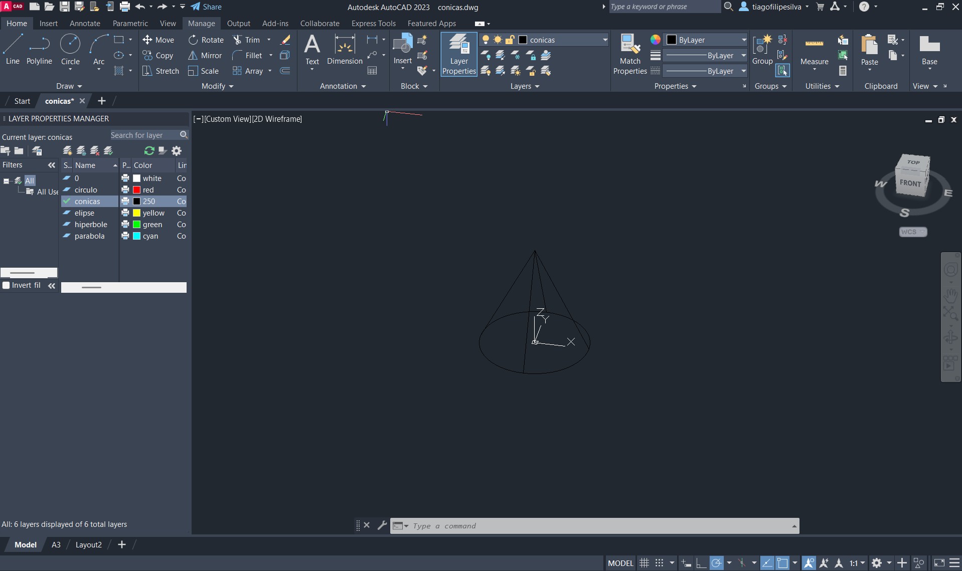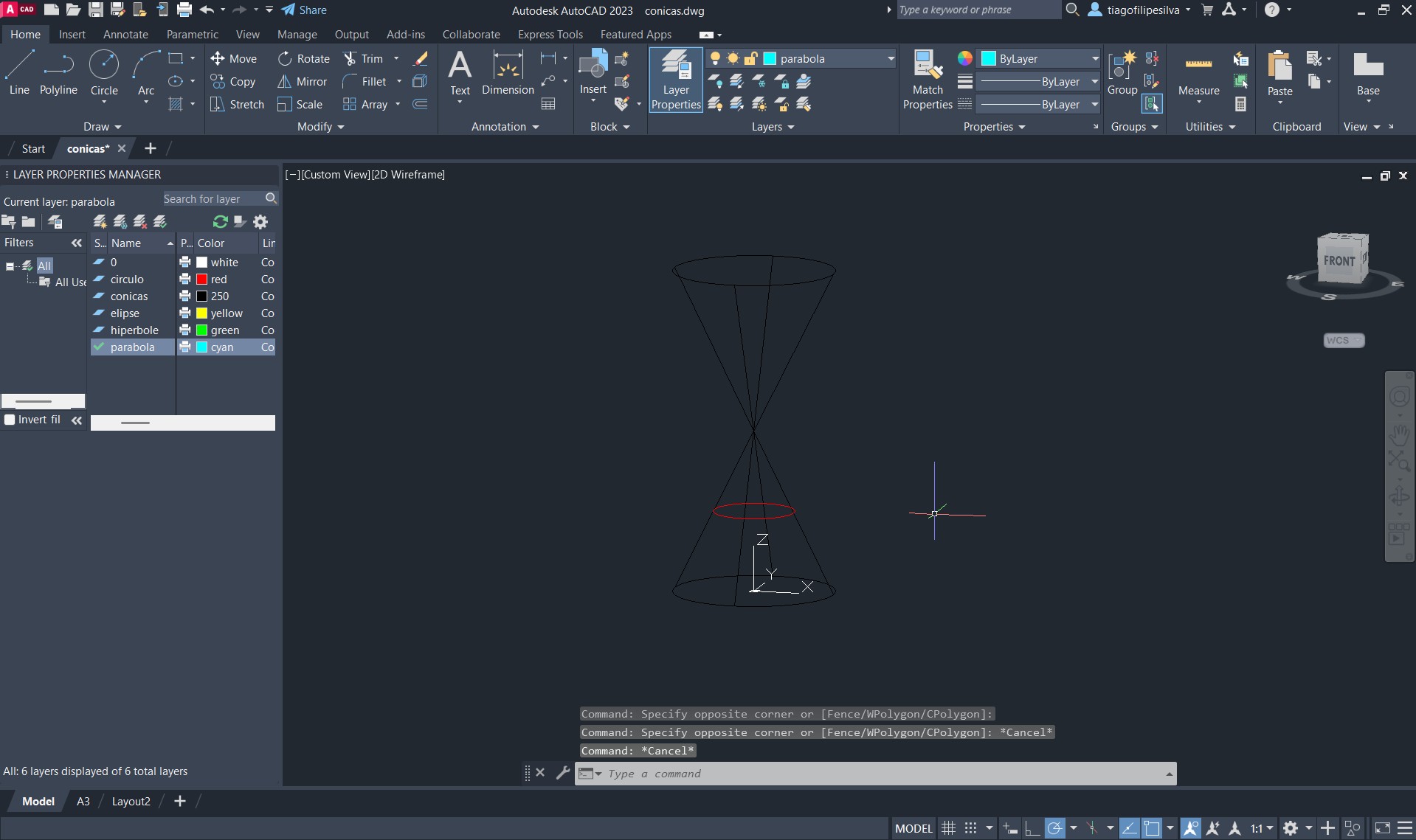 Início da realização do exercício de criação de figuras a partir da interseç;ão de planos com uma figura composta por dois cones no AutoCAD.