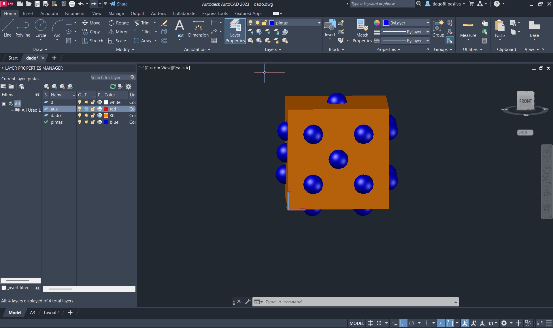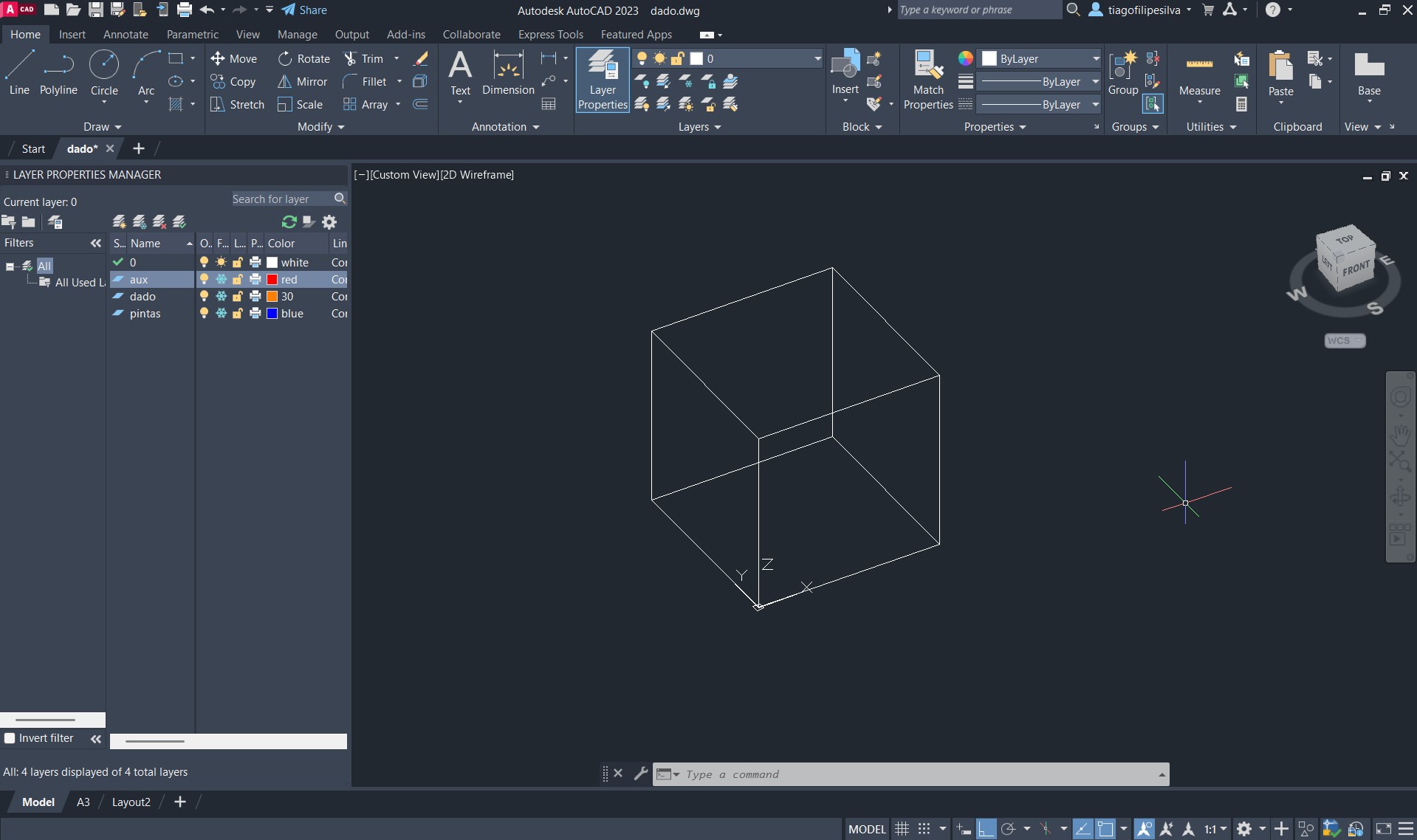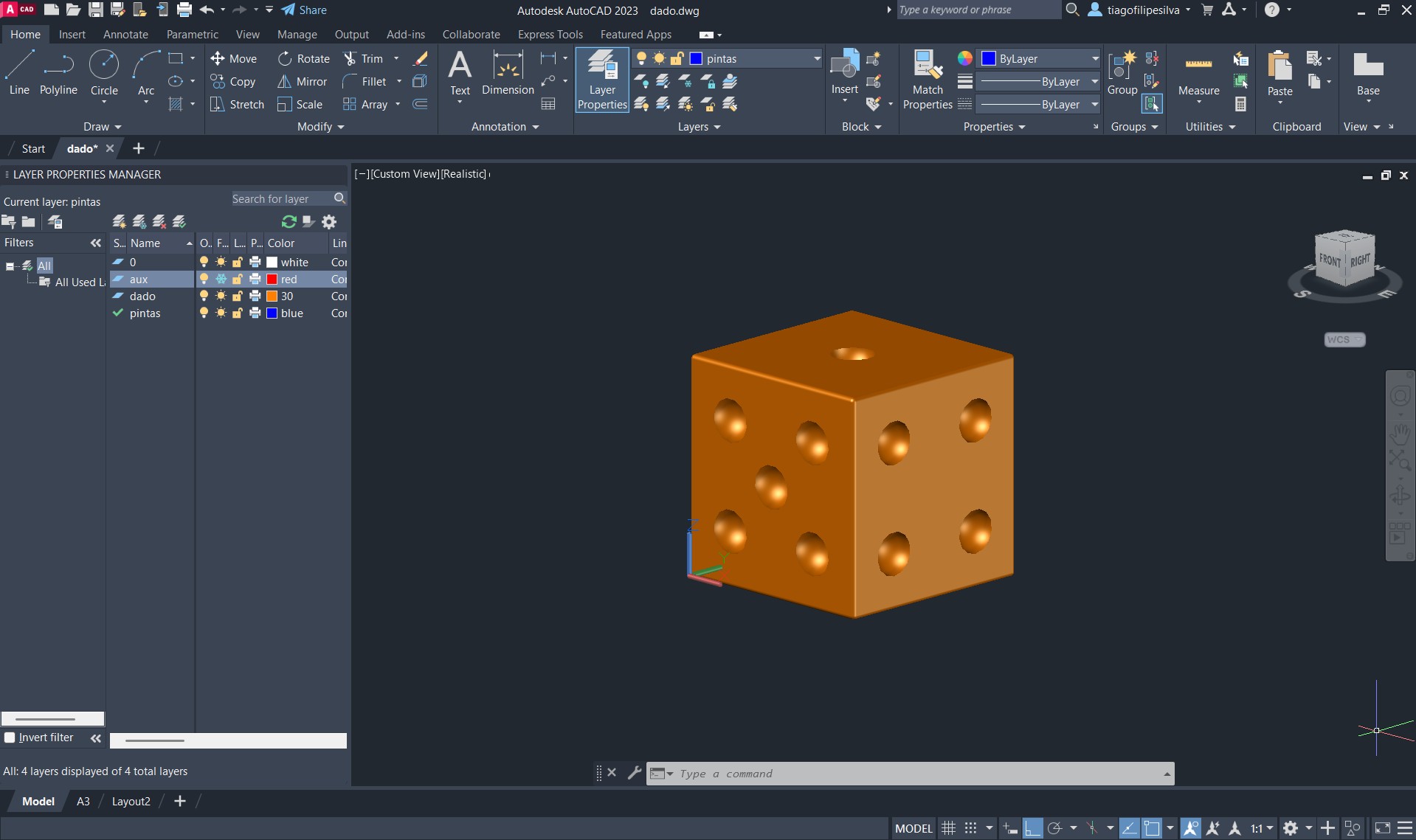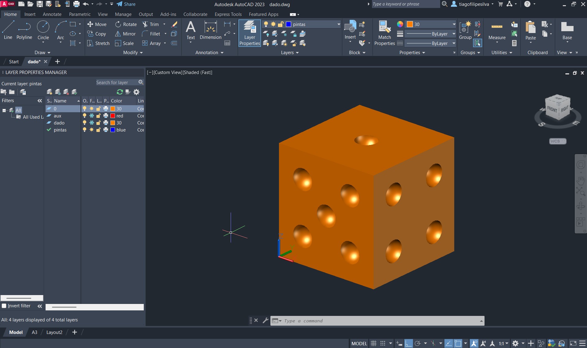 Início de um novo exercício de criação de um dado, num novo ficheiro AutoCAD.