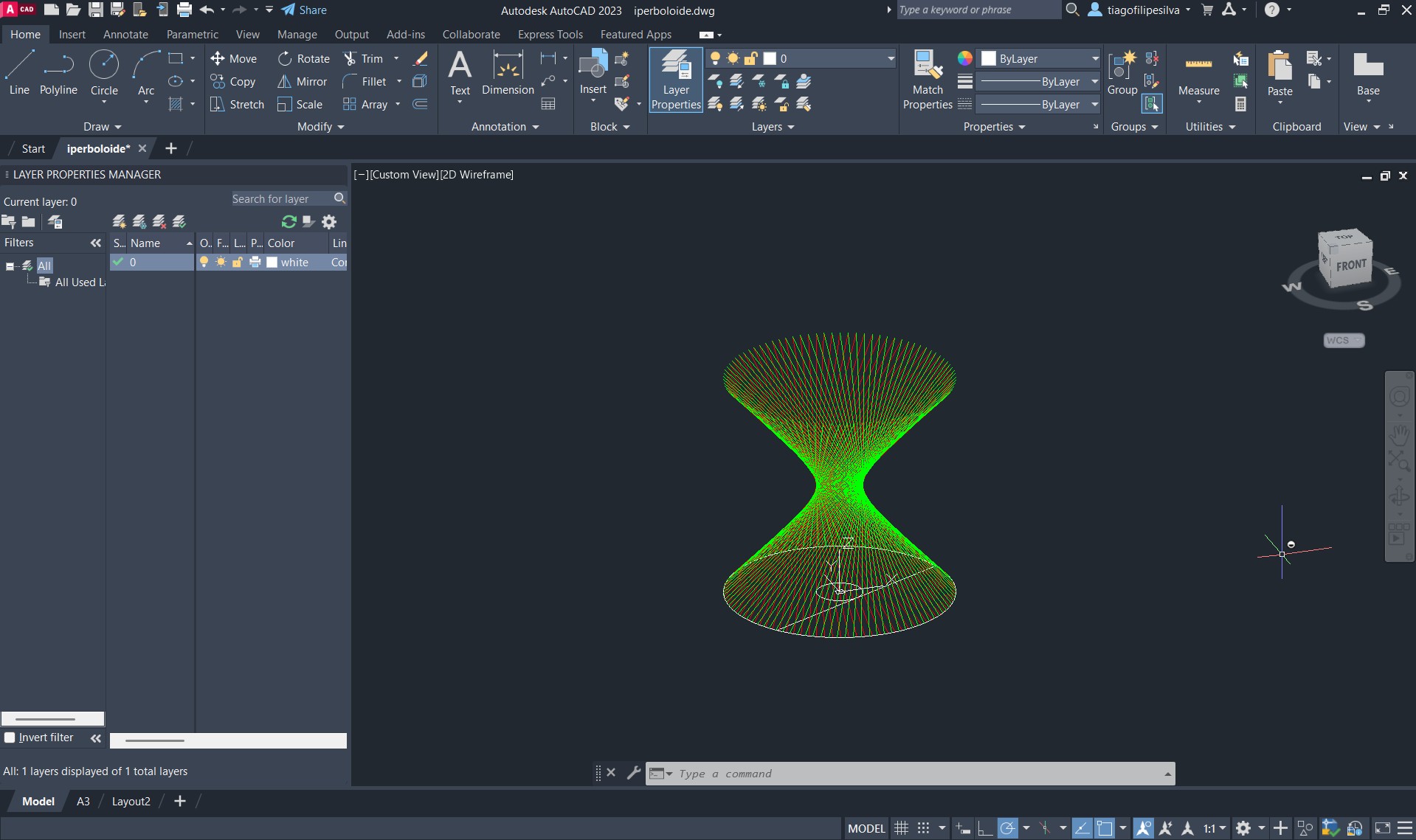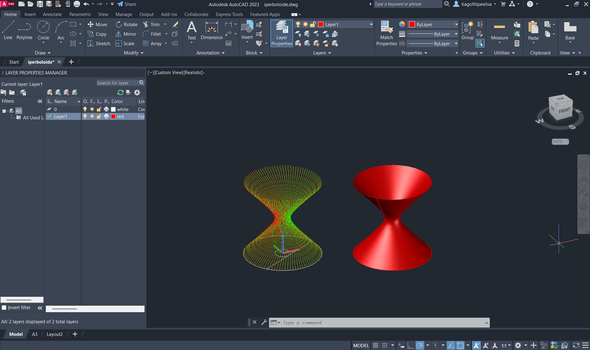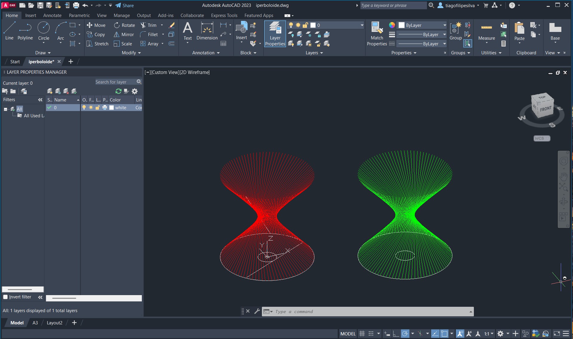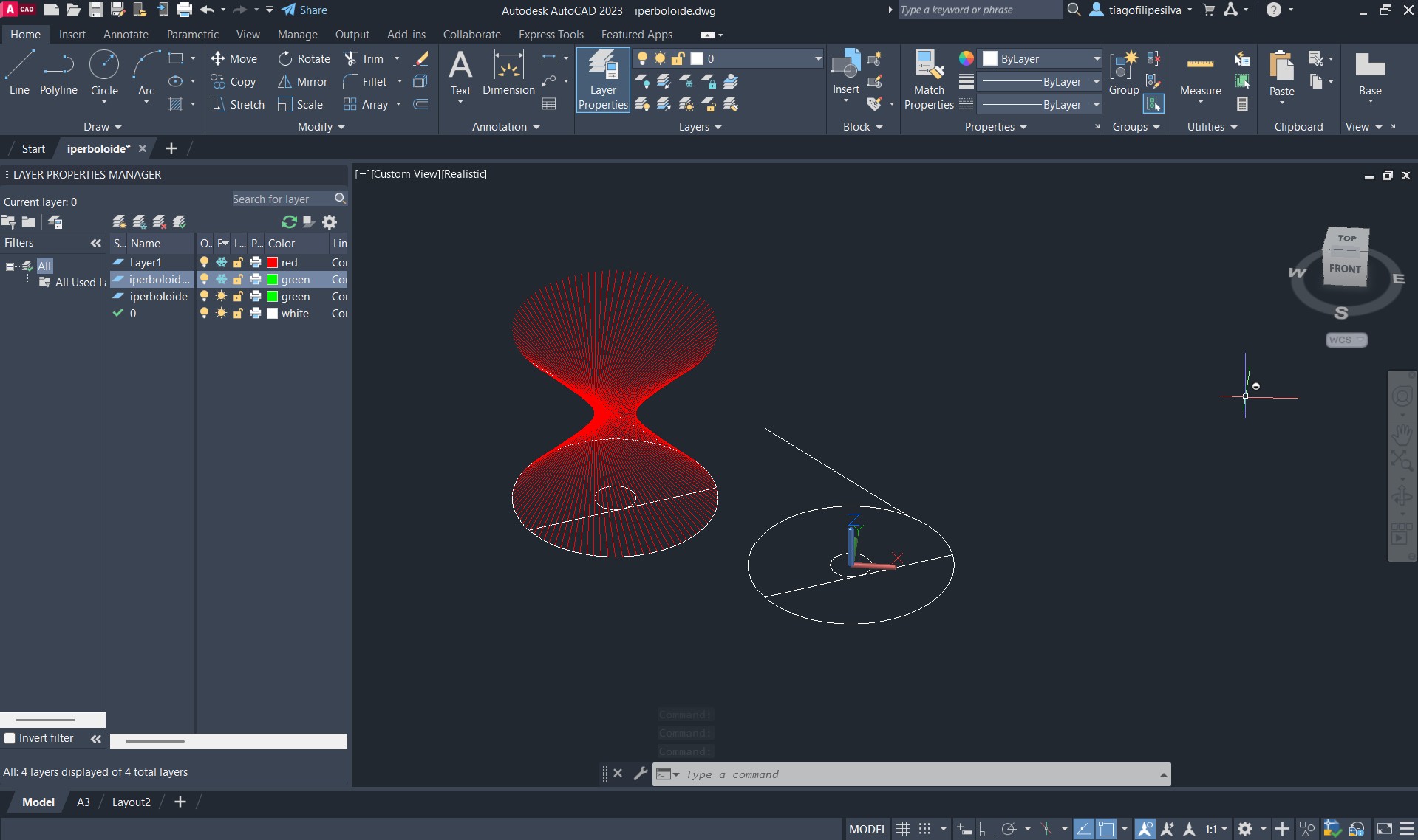 Criação de um segundo hiperboloide verde, a partir de uma das geratrizes, com recurso ao comando: ARRAYCLASSIC.