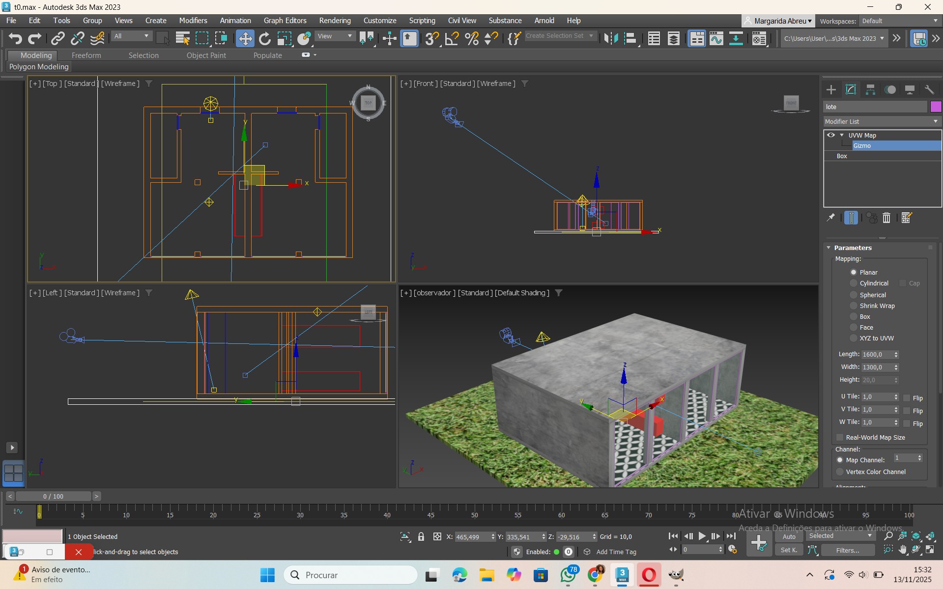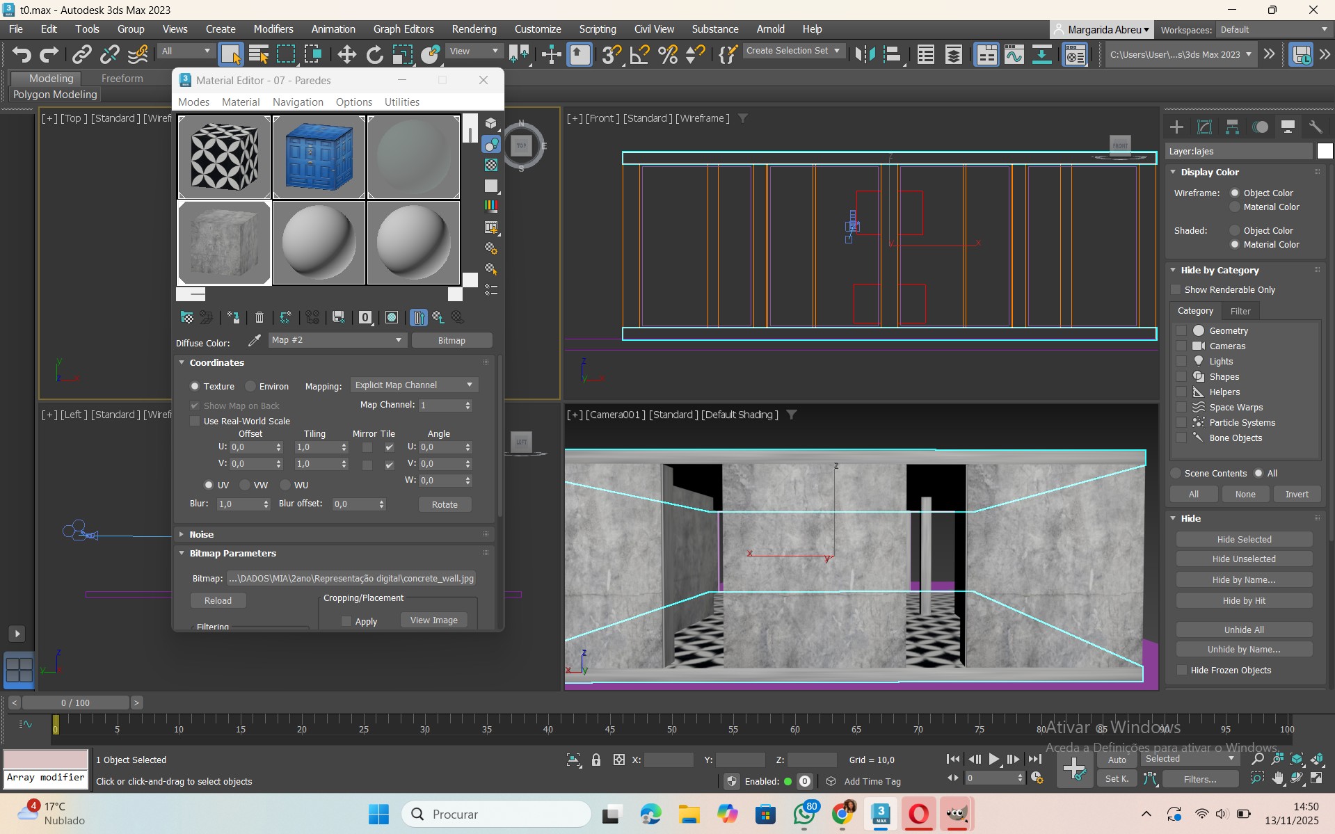 Criação do material betão, através da escolha de uma imagem de betão, e a sua colocação nas paredes e na laje da cobertura do T0. Experiência de uma imagem com o comando Rendering.