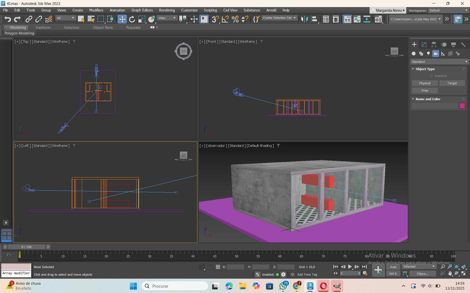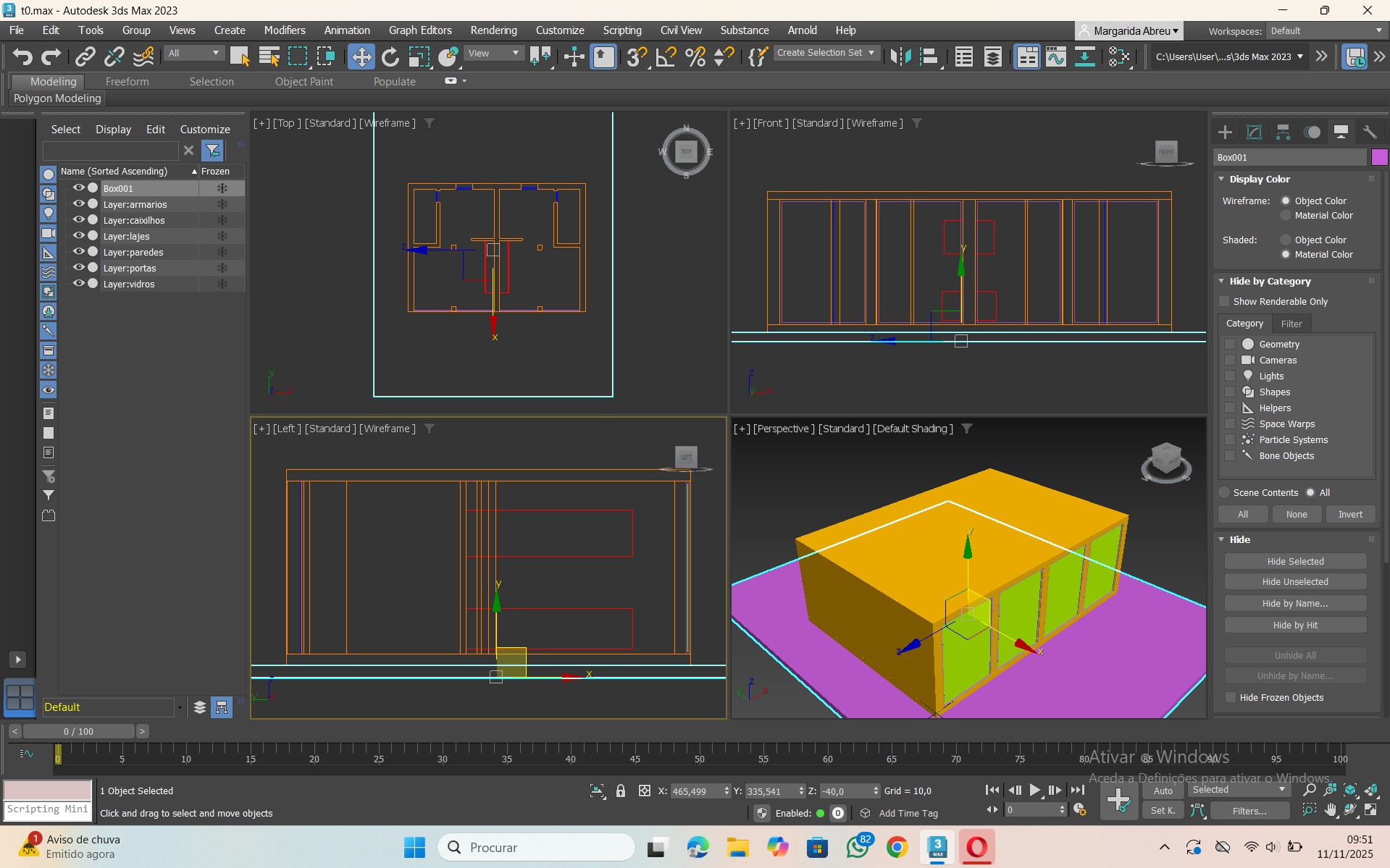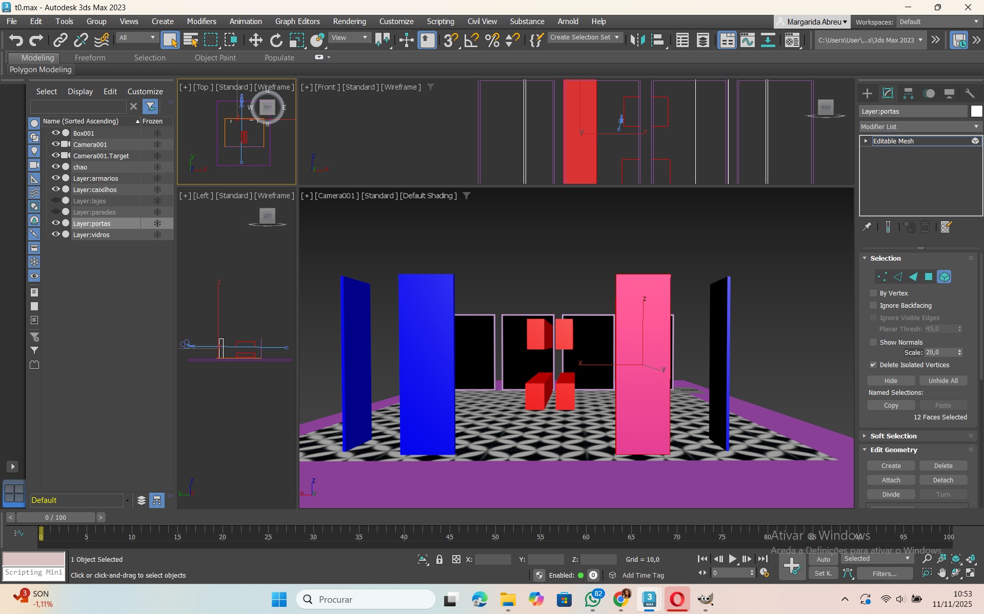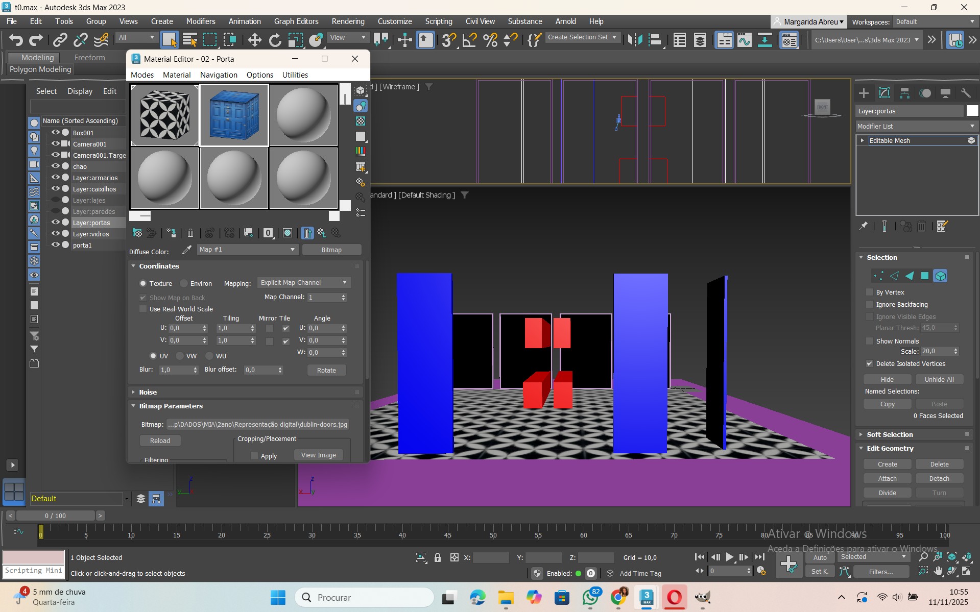 Criação do material vidro, através da escolha de uma cor azul-esverdeada com baixa opacidade. Colocação do mesmo nos vidros do T0.