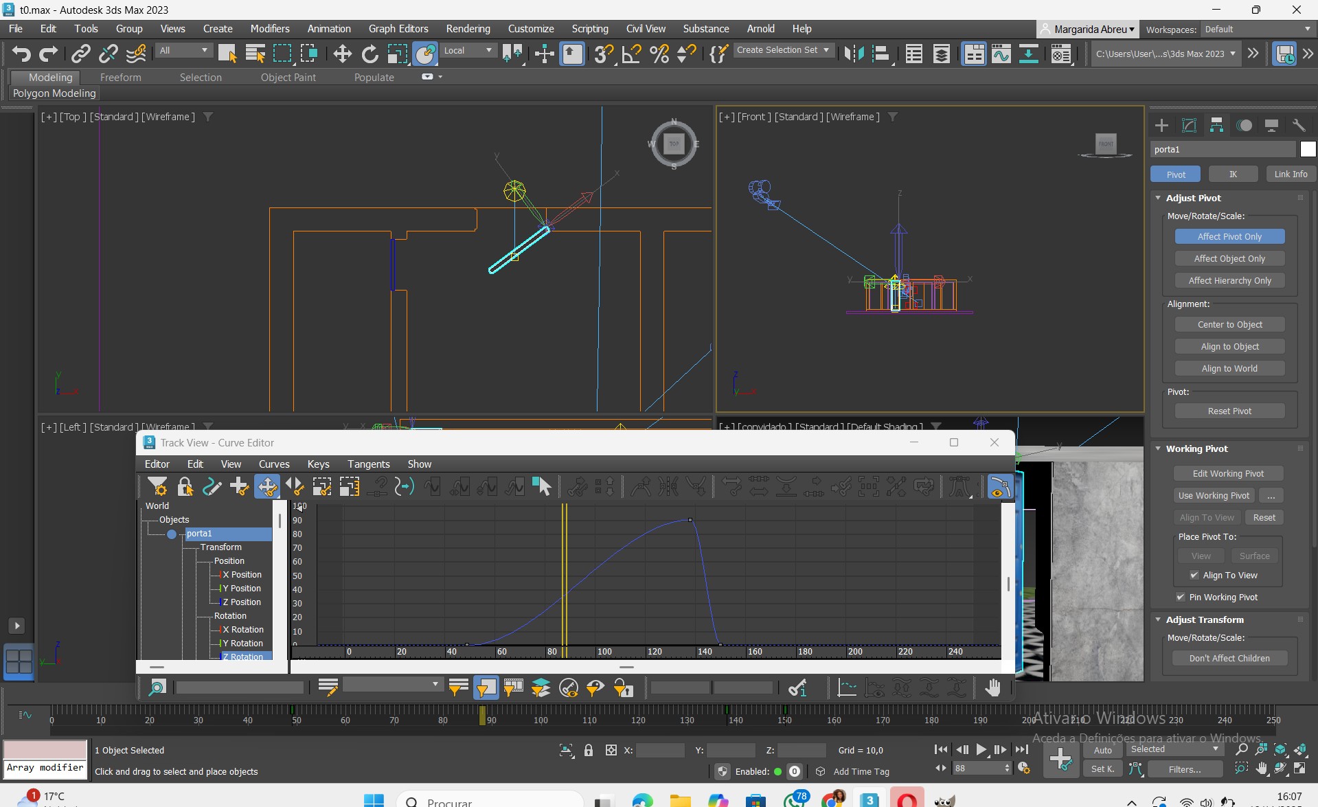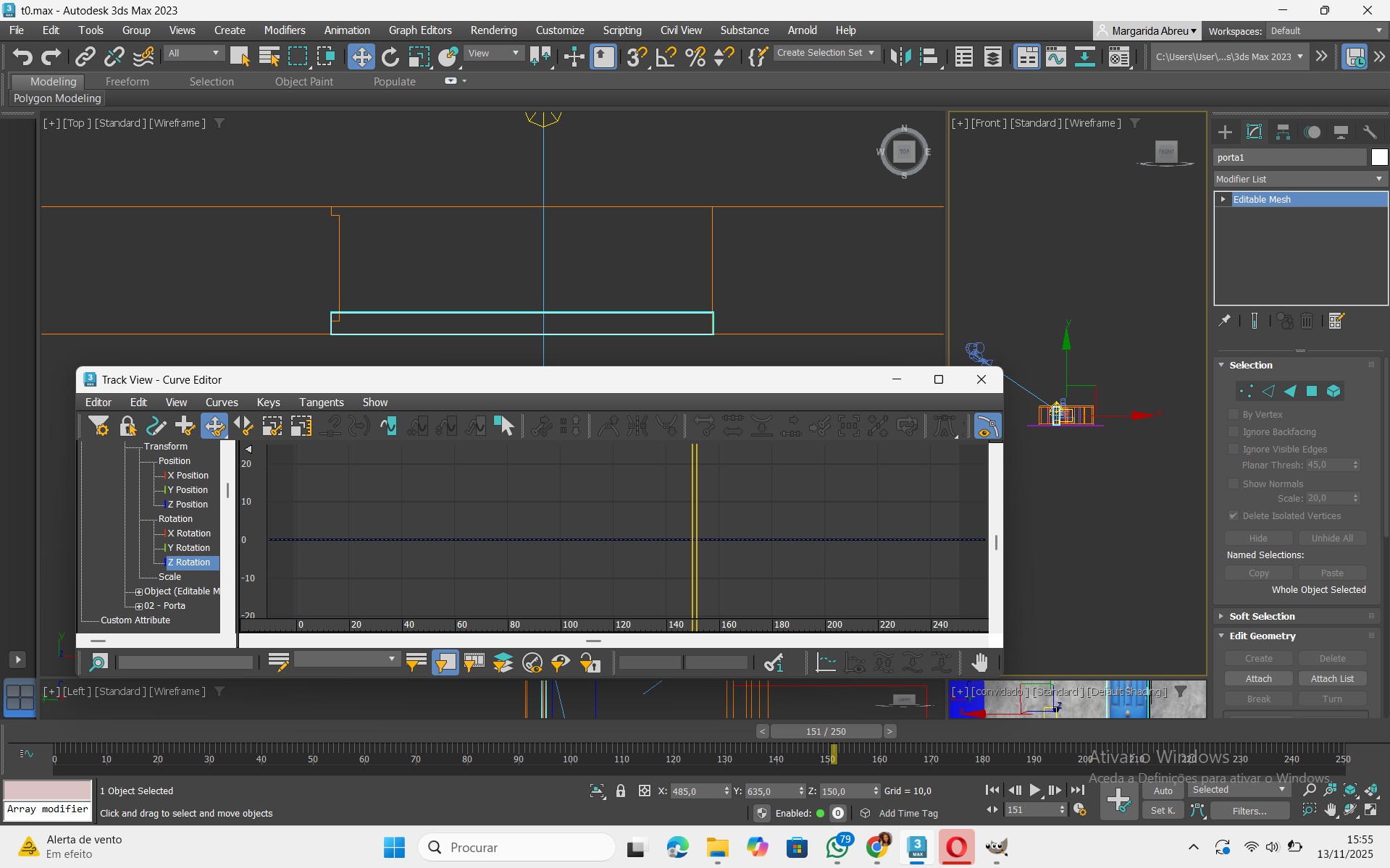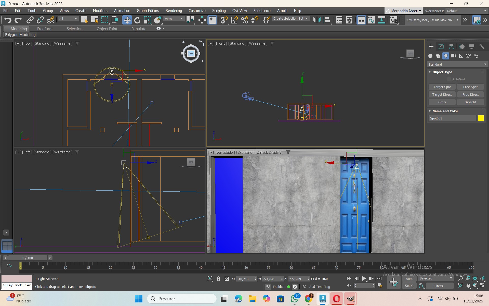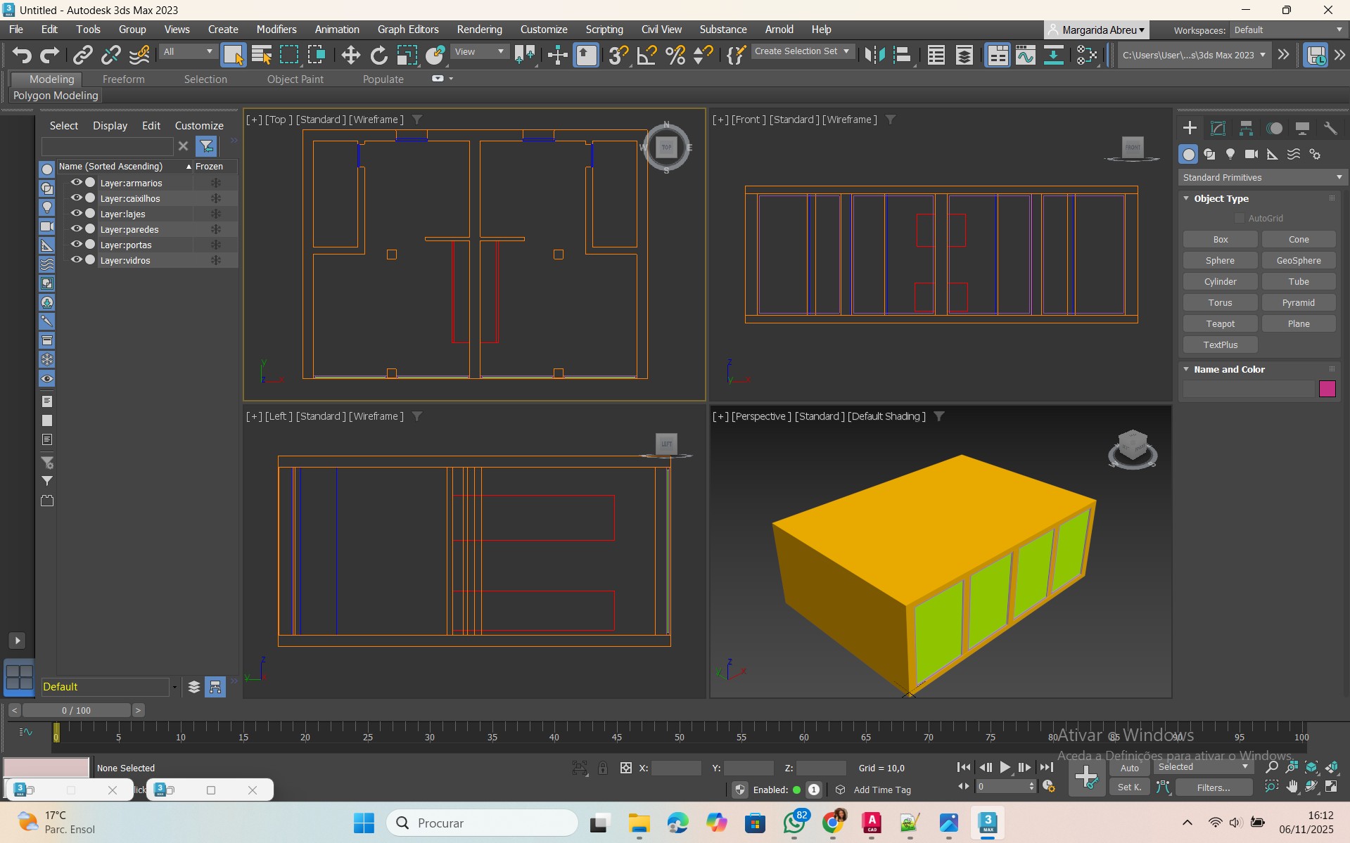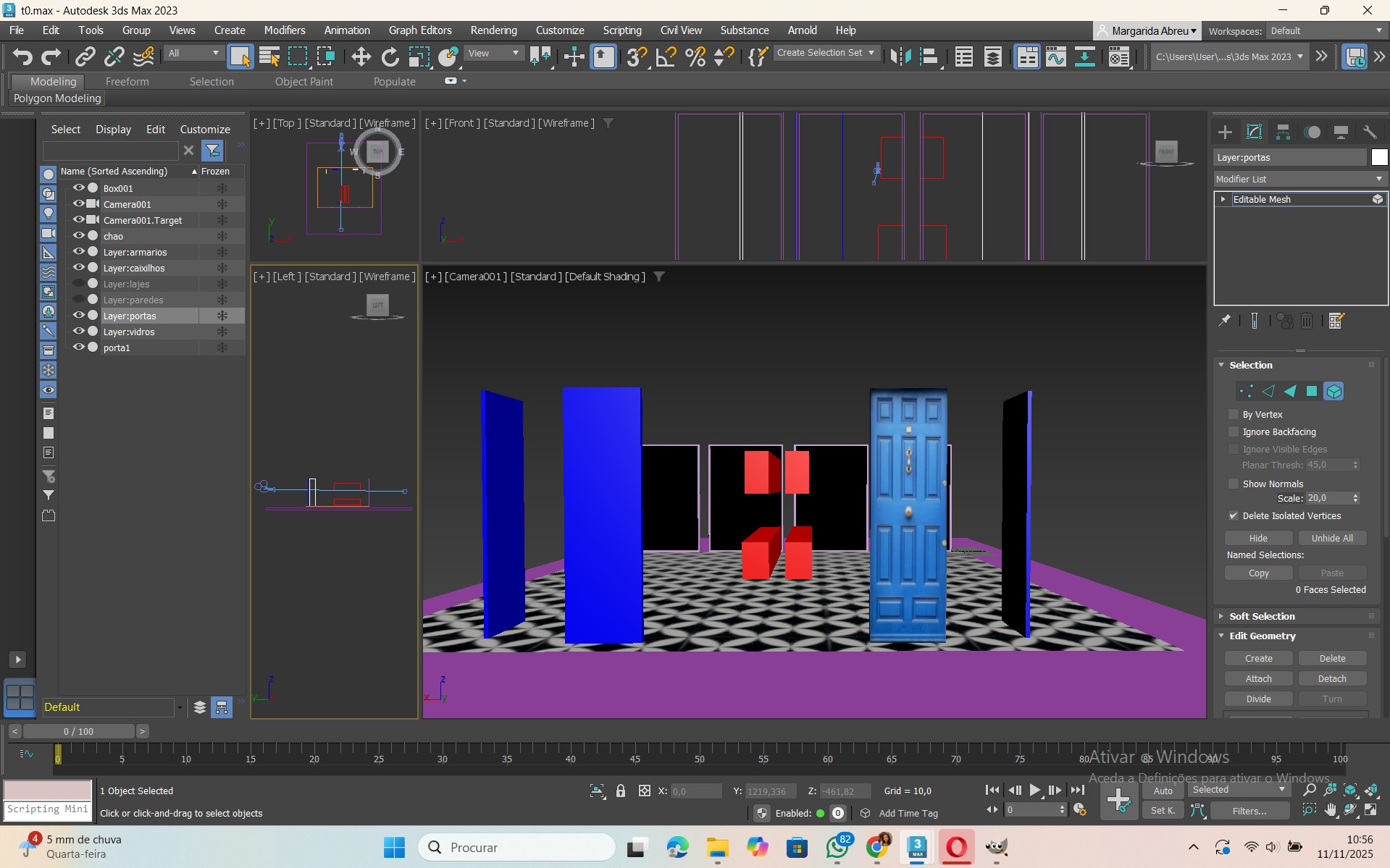 Criação do material vidro, através da escolha de uma cor azul-esverdeada com baixa opacidade. Colocação do mesmo nos vidros do T0.