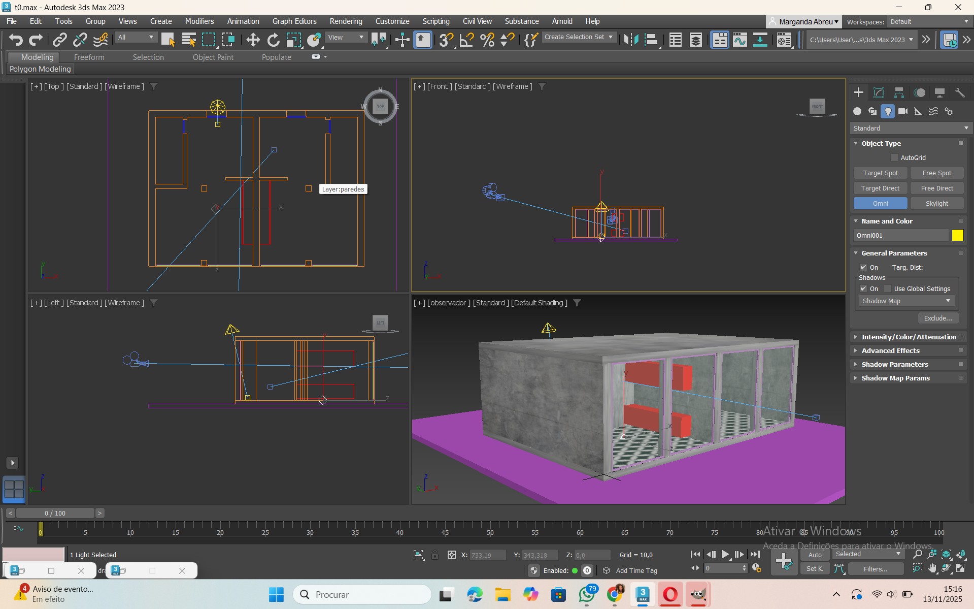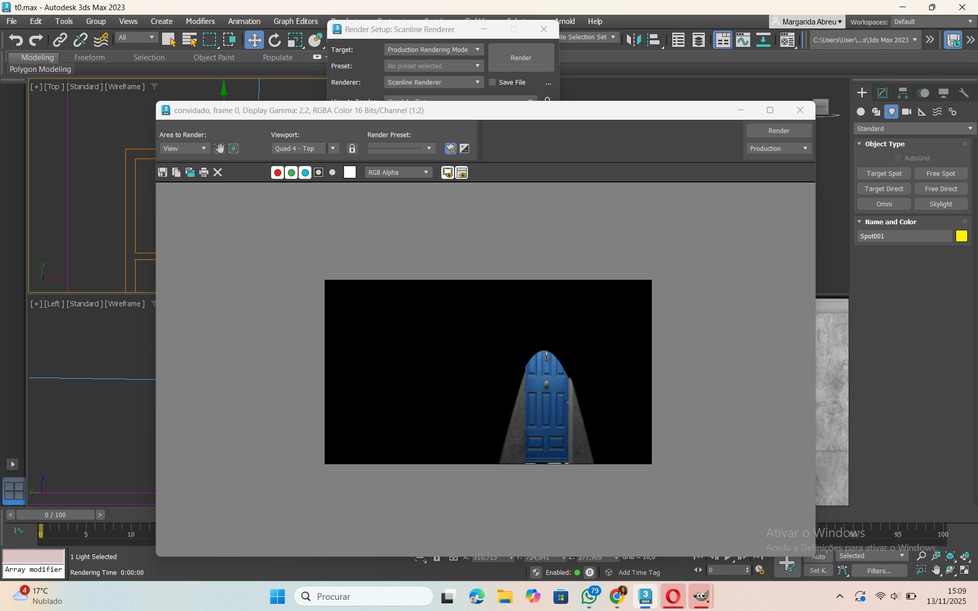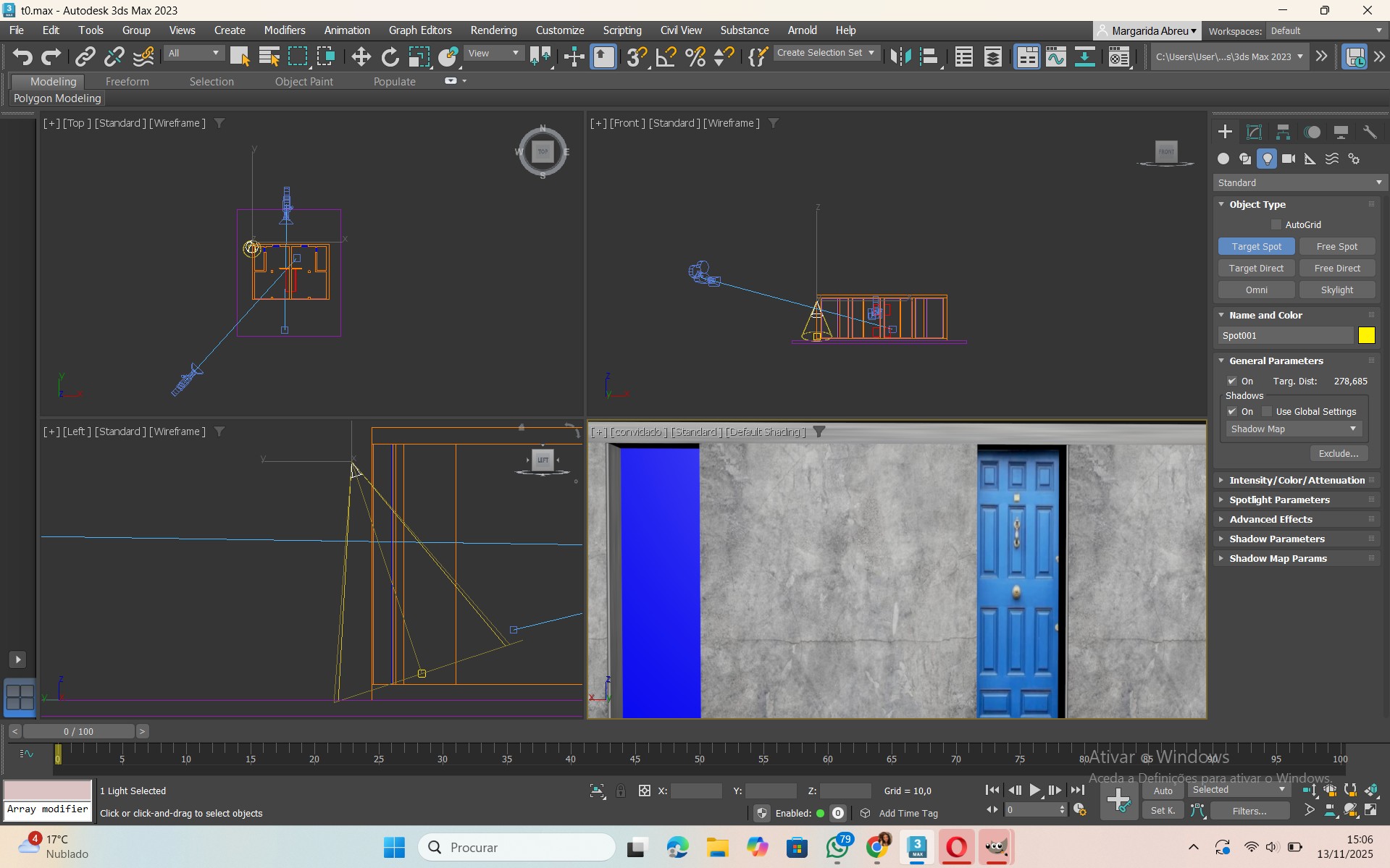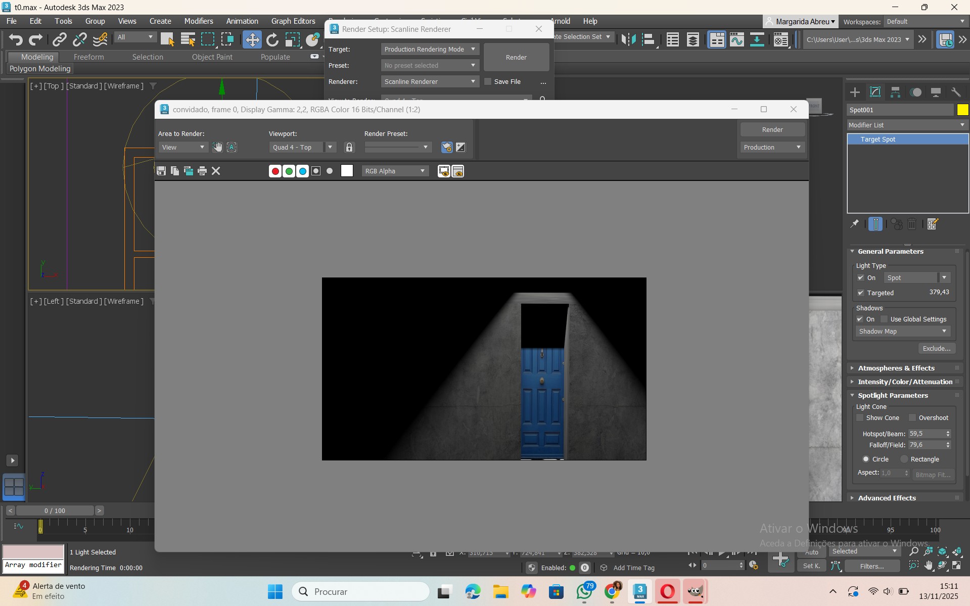 Colocação de um foco de luz no modelo. Experiência com o comando Rendering.