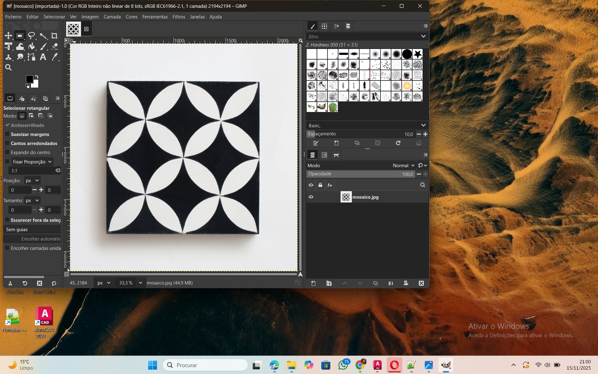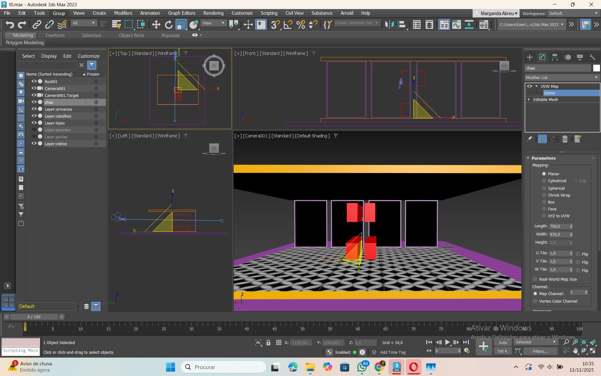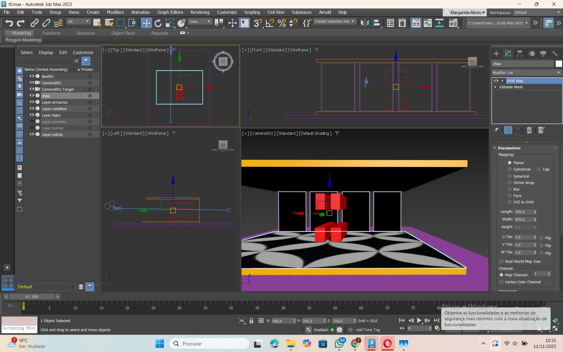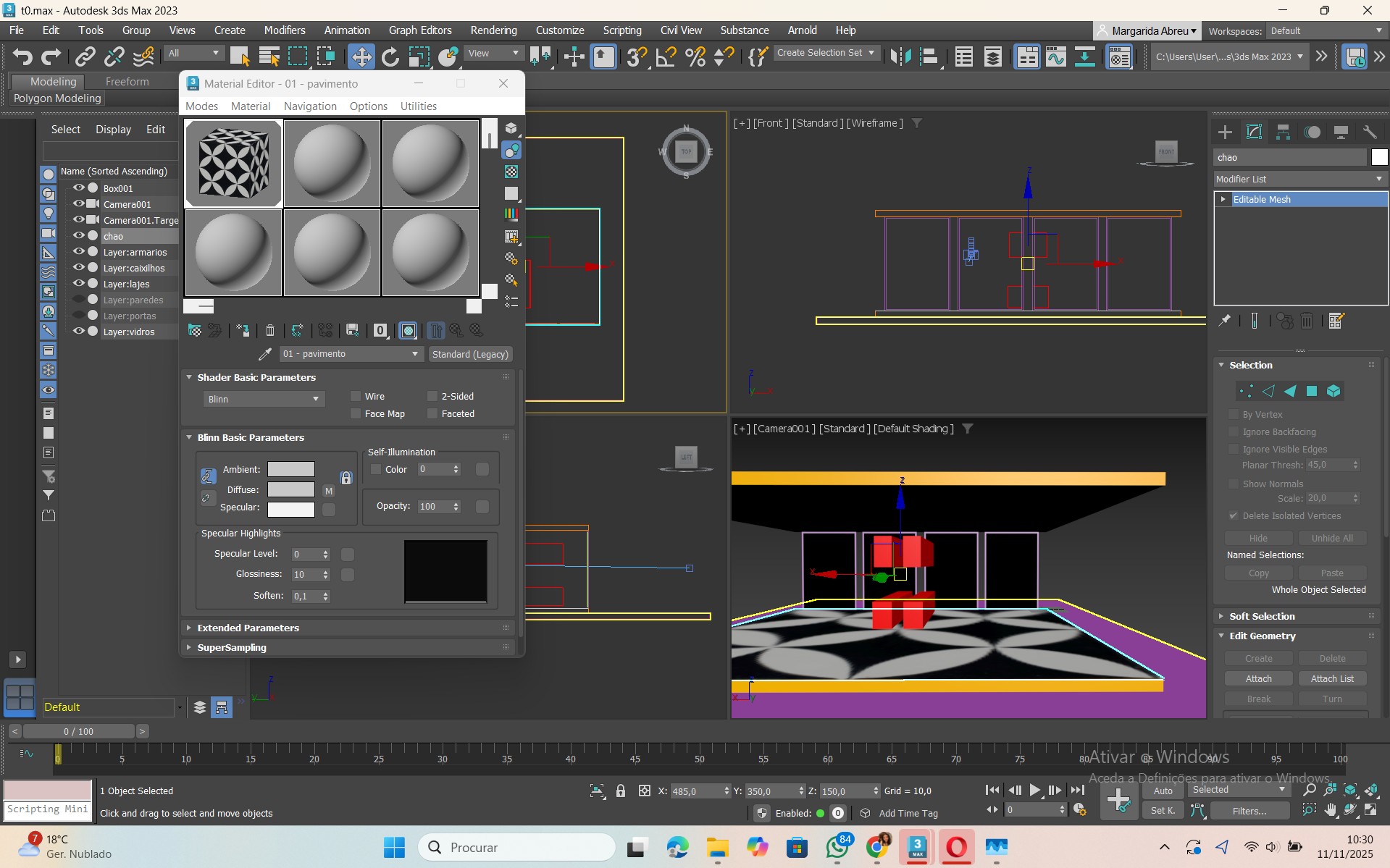 Criação de um material para o pavimento da laje do chão do T0, através da imagem de um mosaico xadrez preto e branco. Colocação do mesmo na layer "chao".
