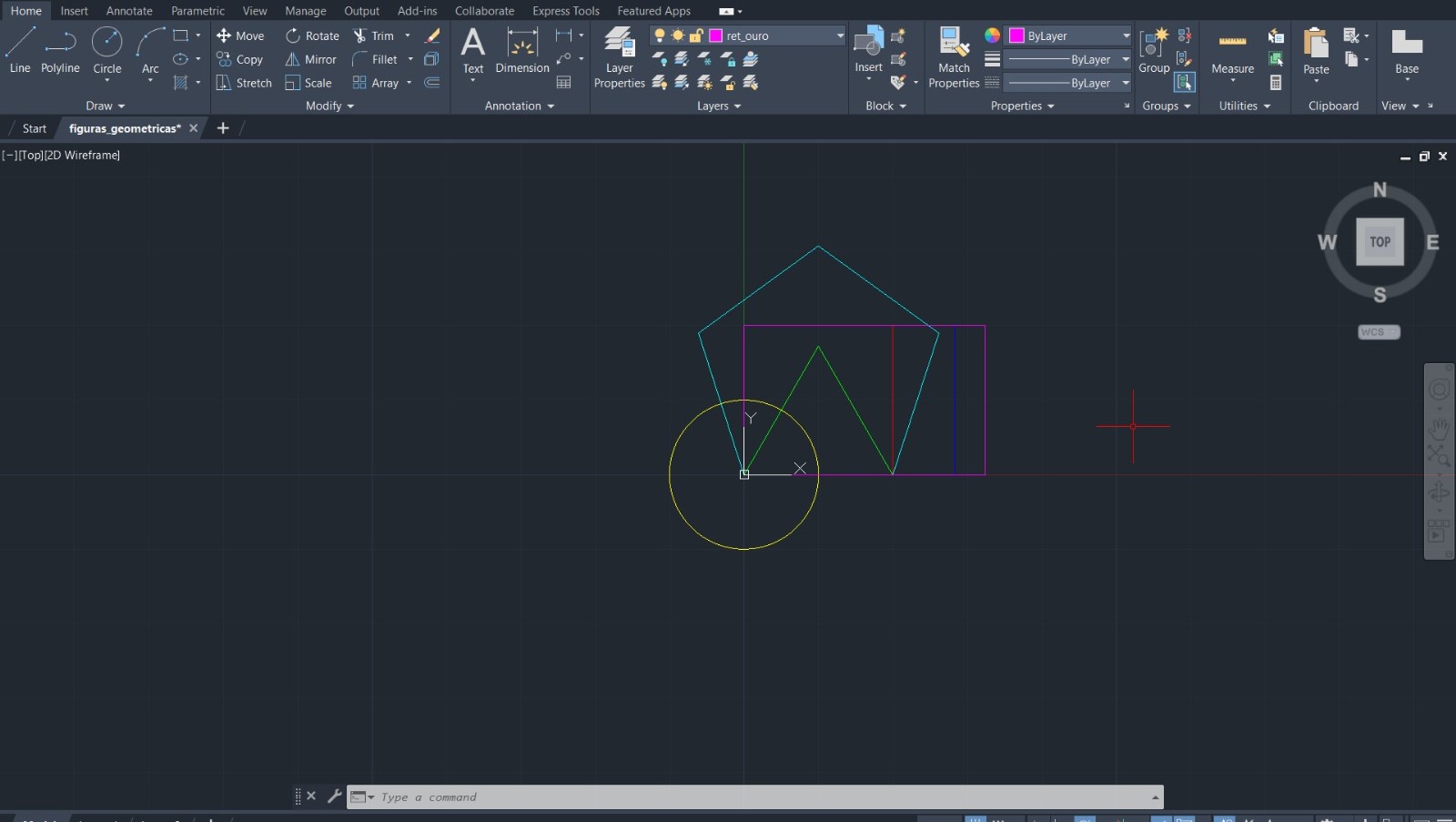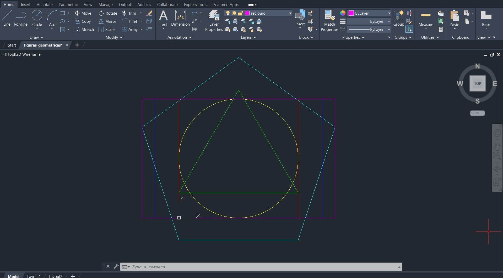 Criação de 6 polígonos em diferentes layers e com diferentes cores.Um quadrado (a vermelho), um círculo (a amarelo), um triângulo (a verde), un pentágono (a cyan), um retângulo R2 (a azul) e um retângulo com a regra de ouro (a magenta). Ficheiro posteriormente salvo no formato DWG.