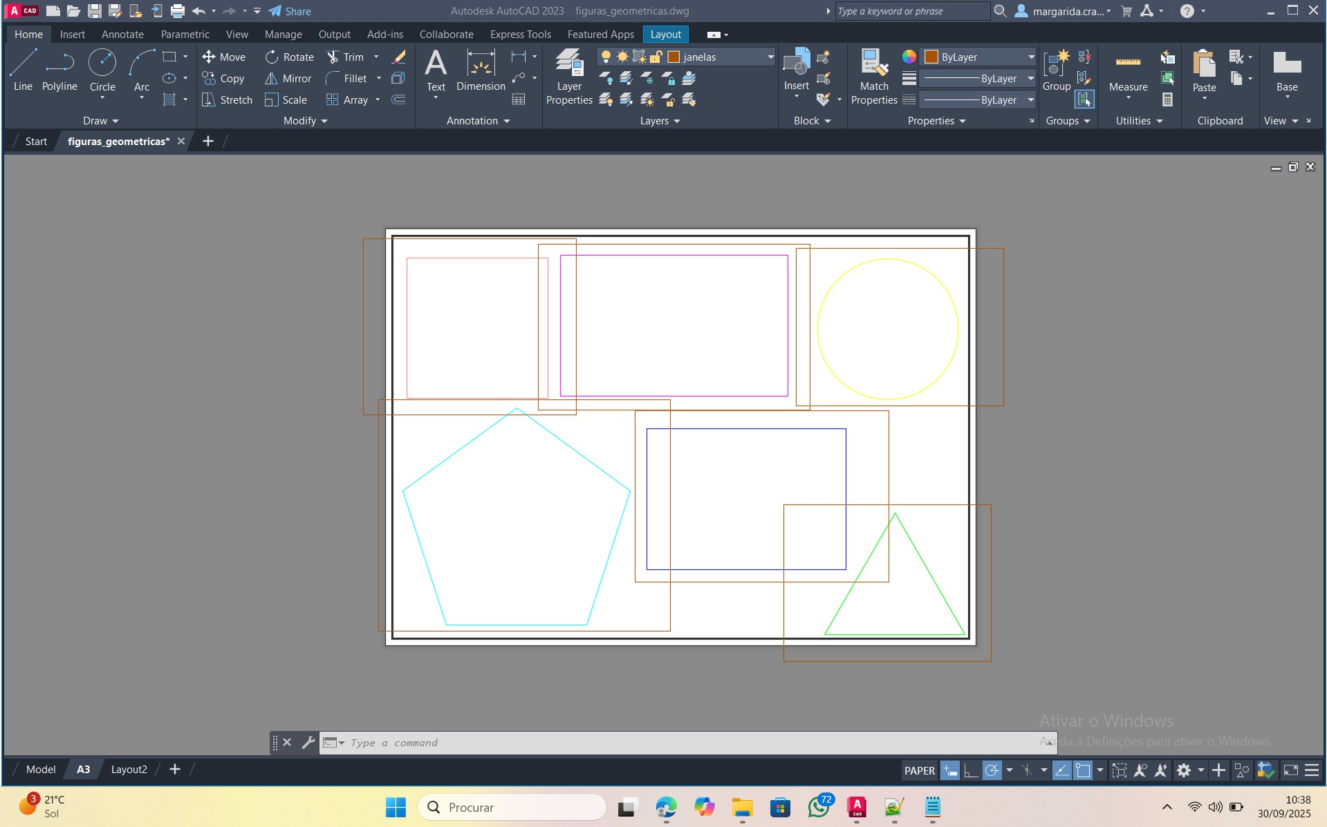 Criação de uma nova layer, denominada "janelas", para a colocação e organização das figuras geométricas no layout A3, anteriormente criado.