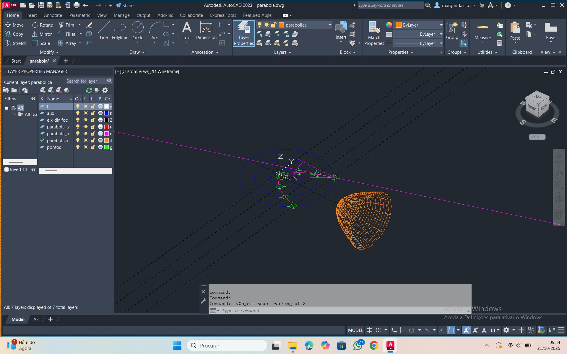 Construção de um paraboloide a partir da segunda parábola com o auxílio dos comandos: -VPOINT, TRIM, SURFTAB1, SURFTAB2, e REVSCULP.