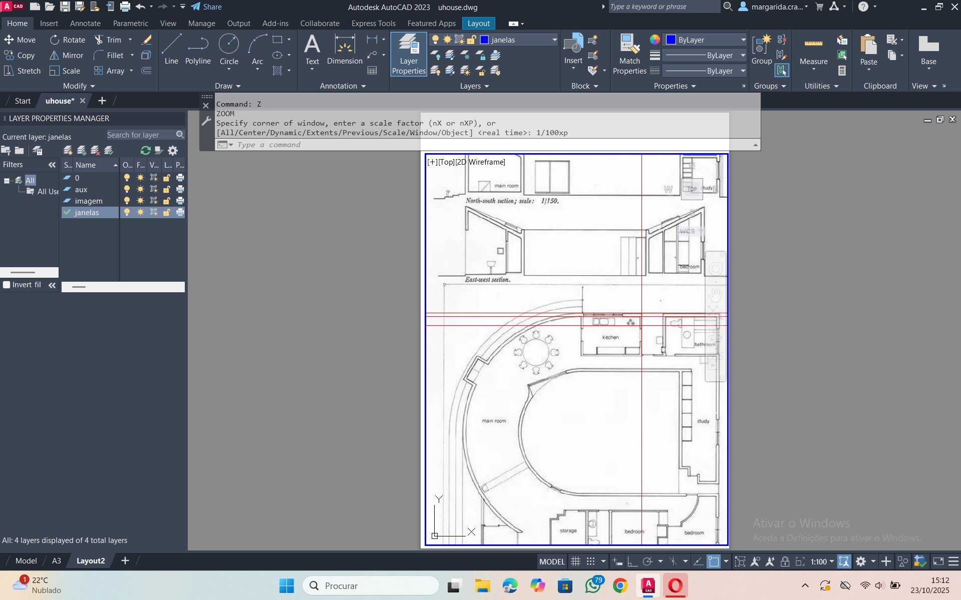 Criação de um layout A4 e colocação dos desenhos na escala 1:100, através dos comandos: PAGESETUP, MVIEW e ZOOM.