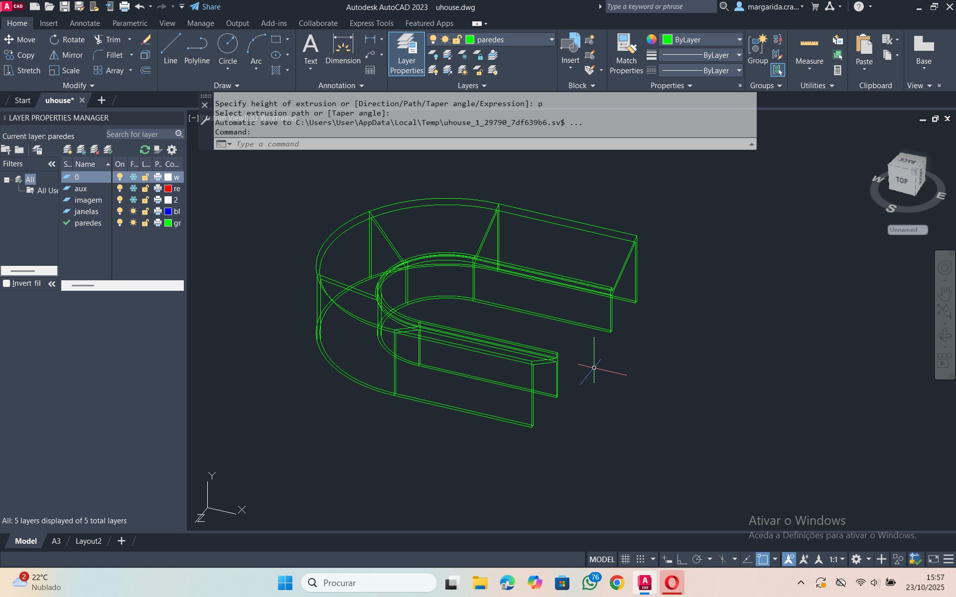 Através da forma da base e de um perfil, criação do formato da casa e fechamento, com a utilização dos comandos: -VPOINT, MOVE, ROTATE, UCS e EXTRUDE.