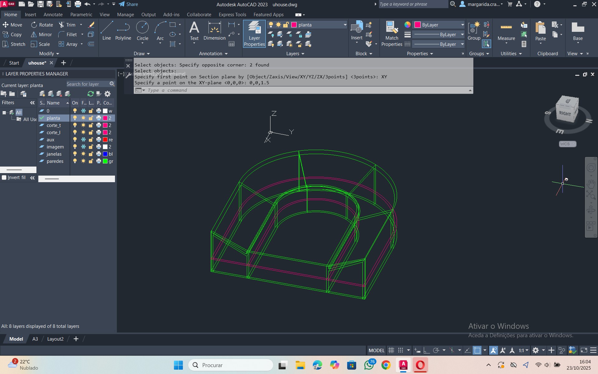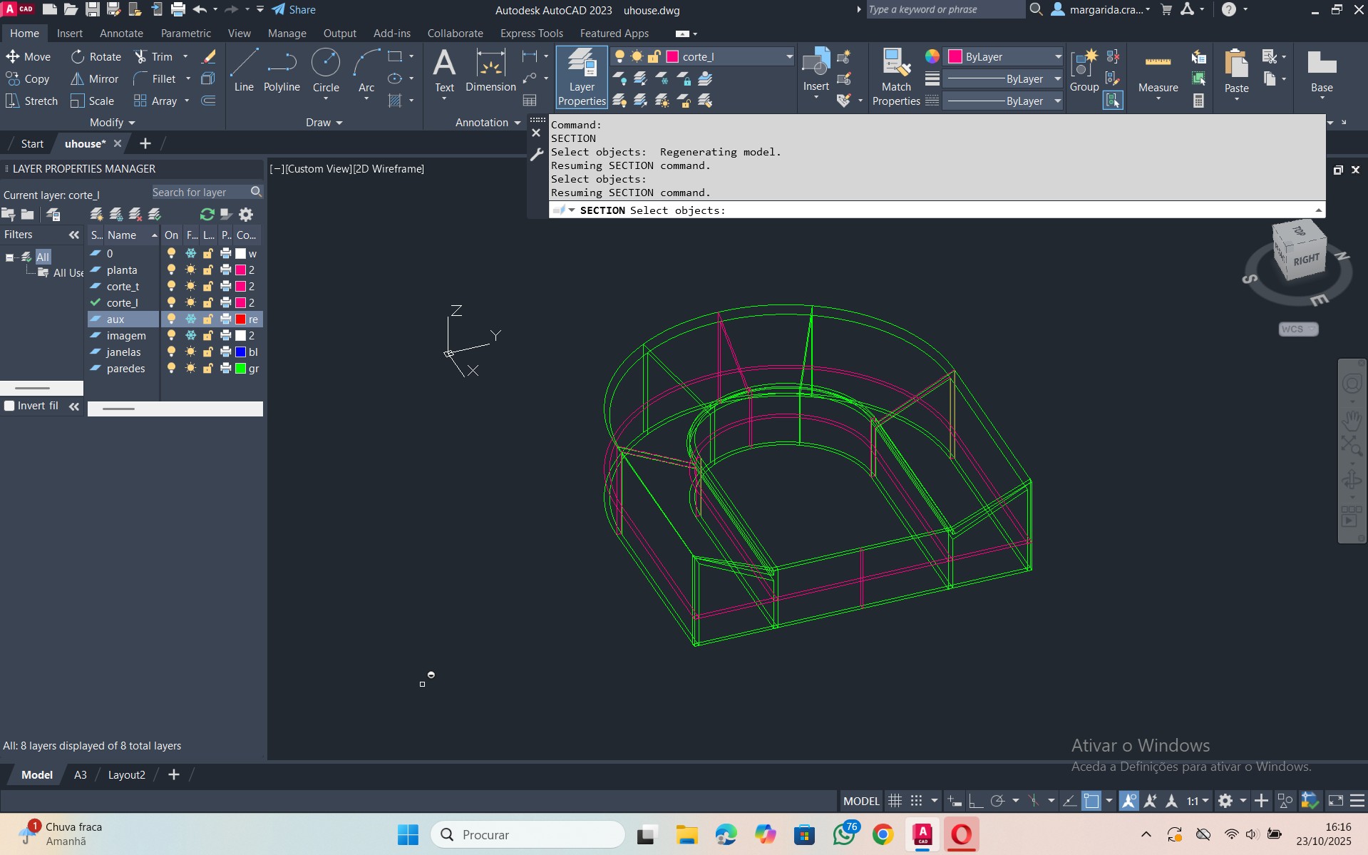 Criação de três secções na figura, uma planta, um corte transversal e um corte longitudinal, através dos comandos: XLINE, UCS, SECTION