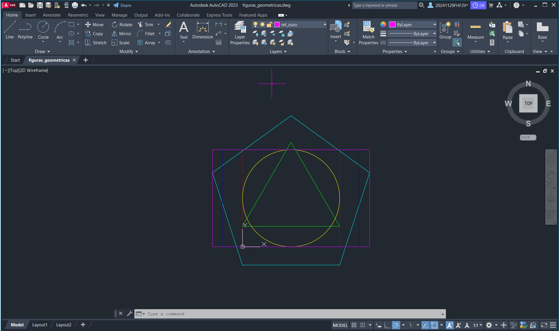 Criação de 6 polígonos em diferentes layers e com diferentes cores.Um quadrado (a vermelho), um círculo (a amarelo), um triângulo (a verde), um pentágono (a cyan), um retângulo R2 (a azul) e um retângulo com a regra de ouro (a magenta). Ficheiro posteriormente salvo no formato DWG. Reorganização das figuras geometricas, colocando os seus centros geometricos no ponto central do quadrado inicial.