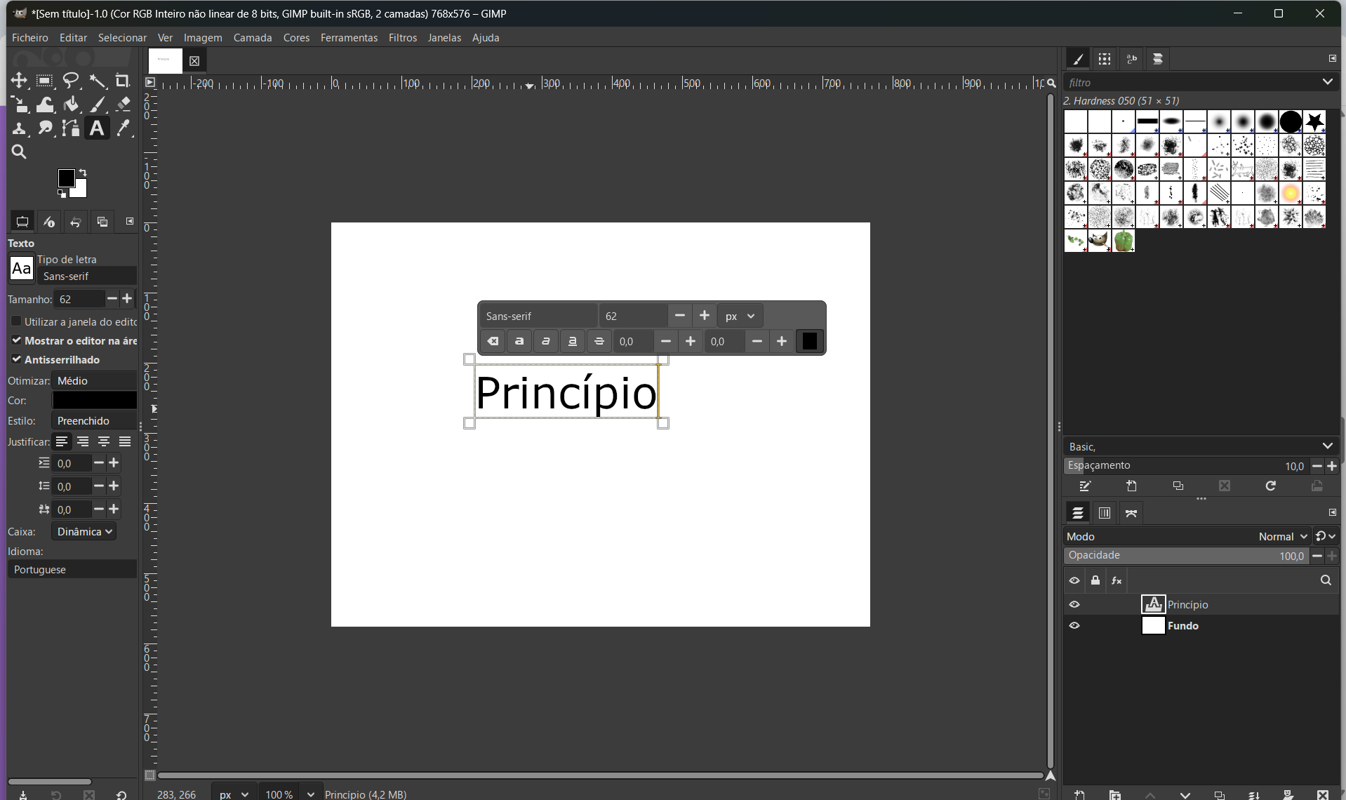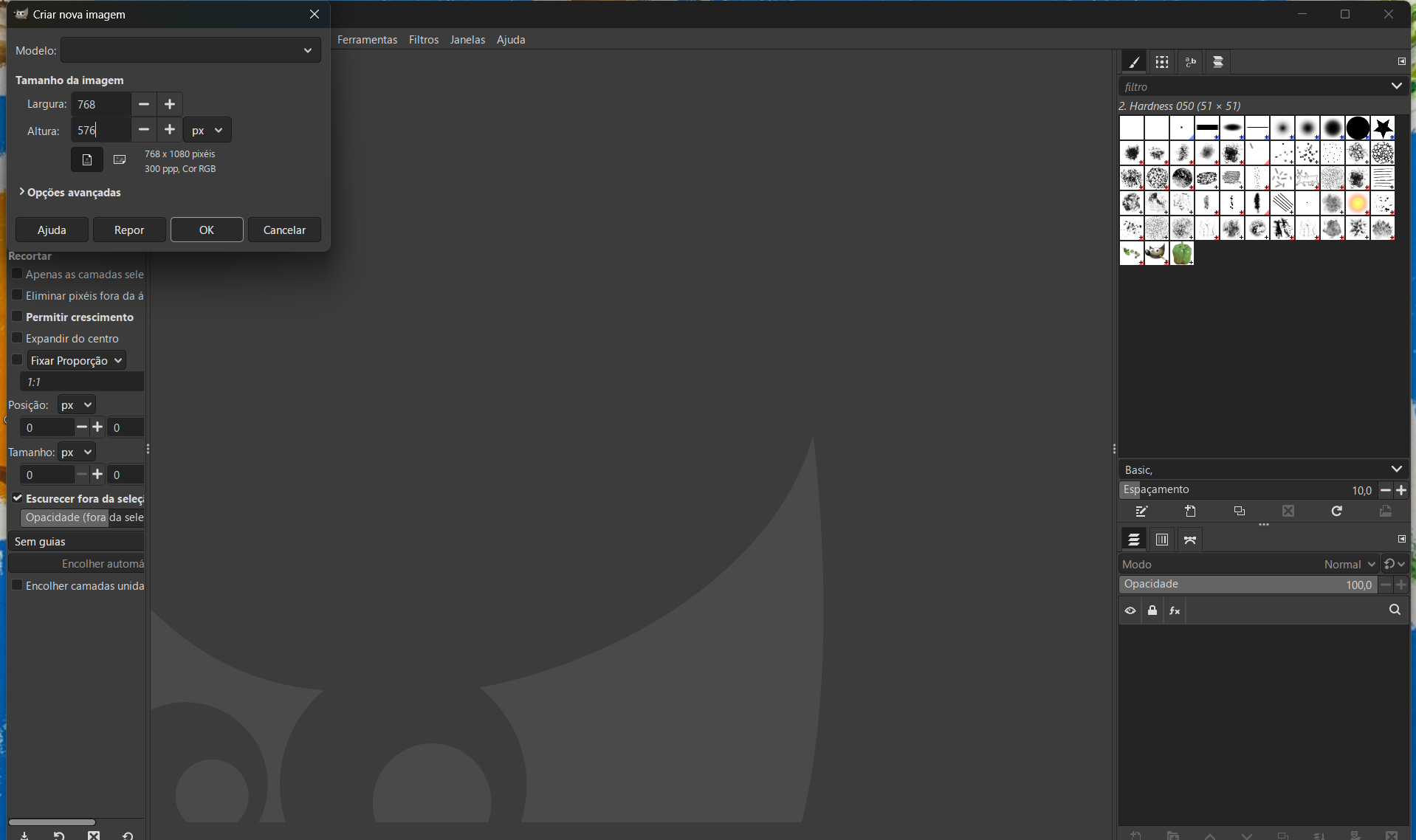 Abertura de um novo ficheiro no Gimp e formatação do mesmo para as medidas da animação (768x576).