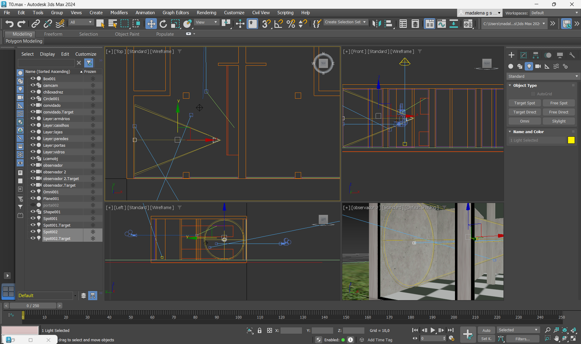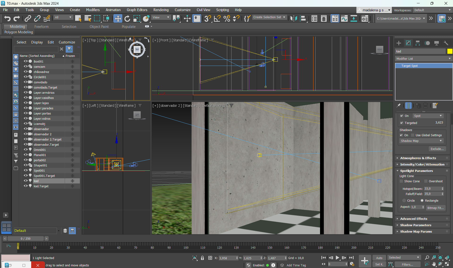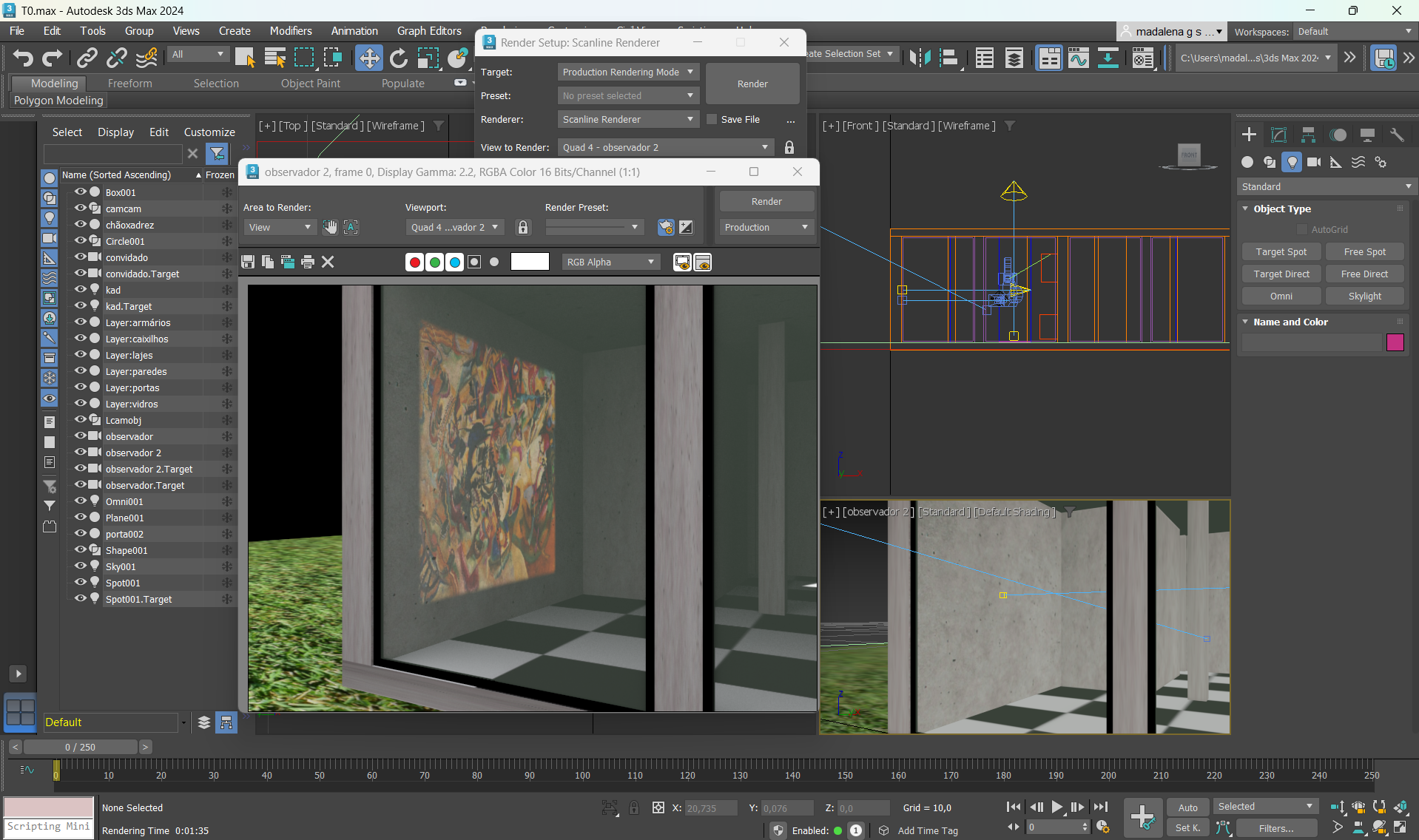 Reabertura do 3ds MAX. Criação e ajuste de uma nova luz Target Spot, para a projeção de uma pintura do Kandinsky na parede.