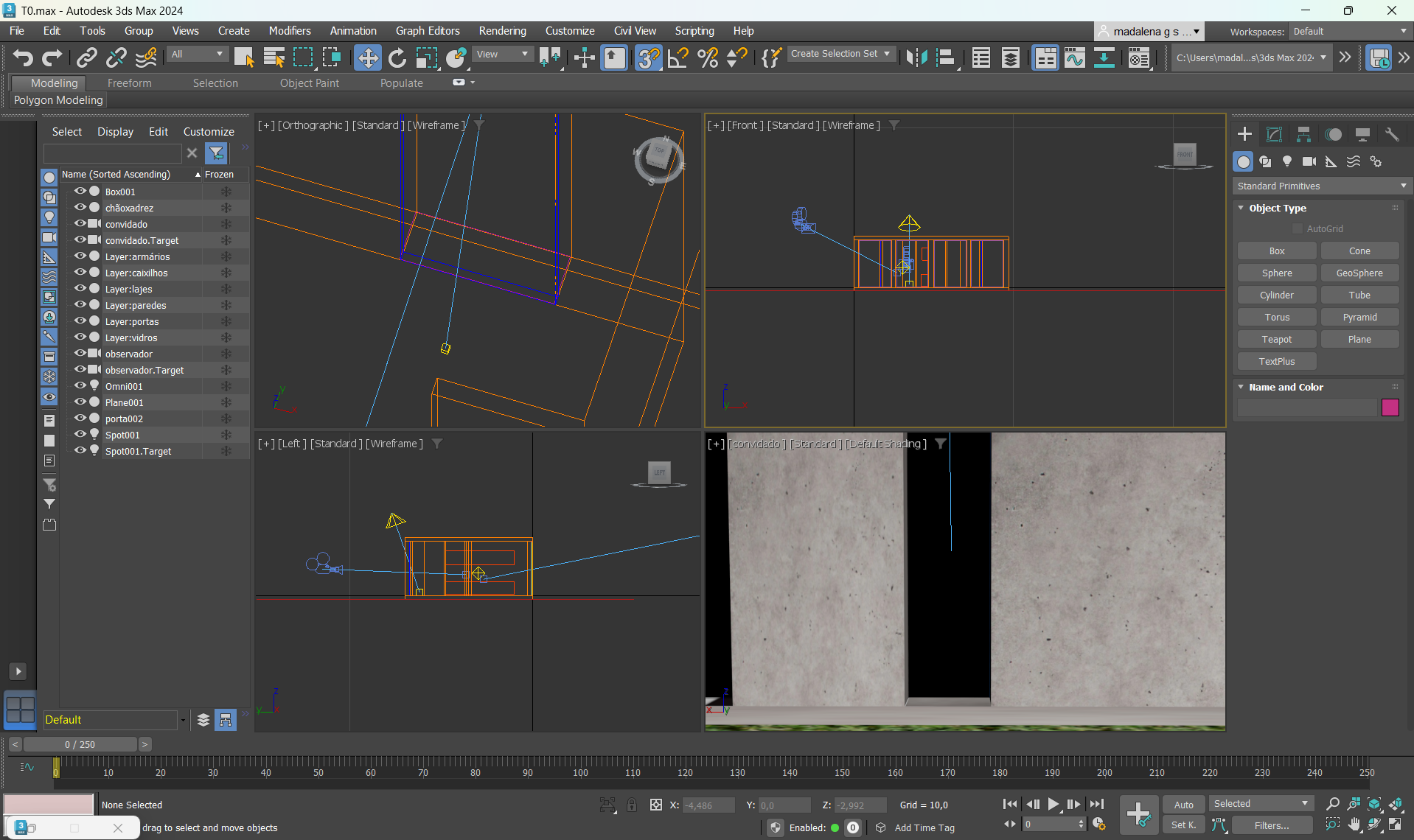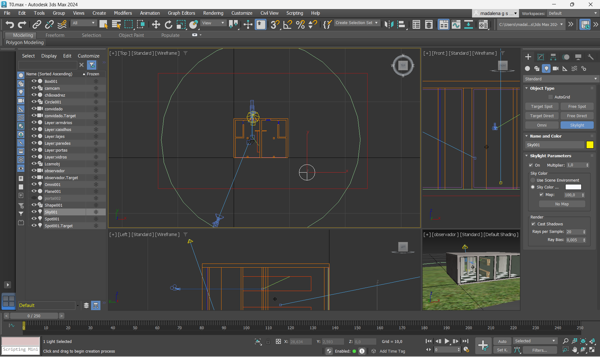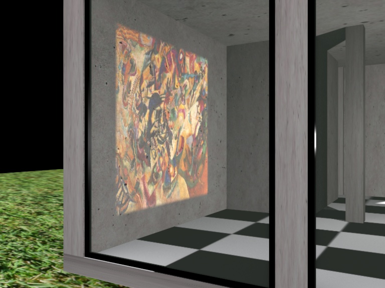 Reabertura do 3ds MAX. Criação e ajuste de uma nova luz Target Spot, para a projeção de uma pintura do Kandinsky na parede.