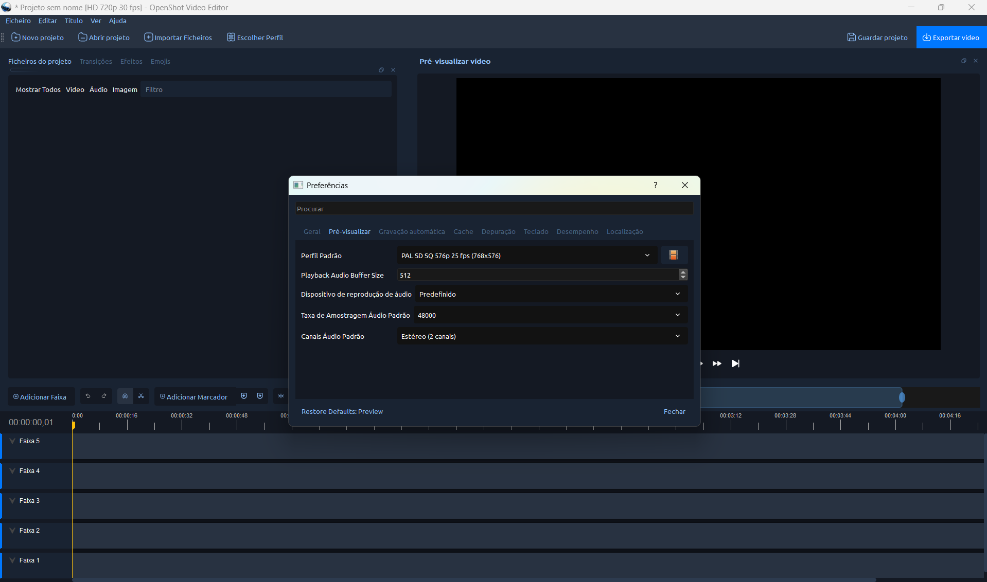 Reabertura do OpenShot e criação do vídeo com as legendas. Exportação do mesmo no formato (768x576) e em mp4.