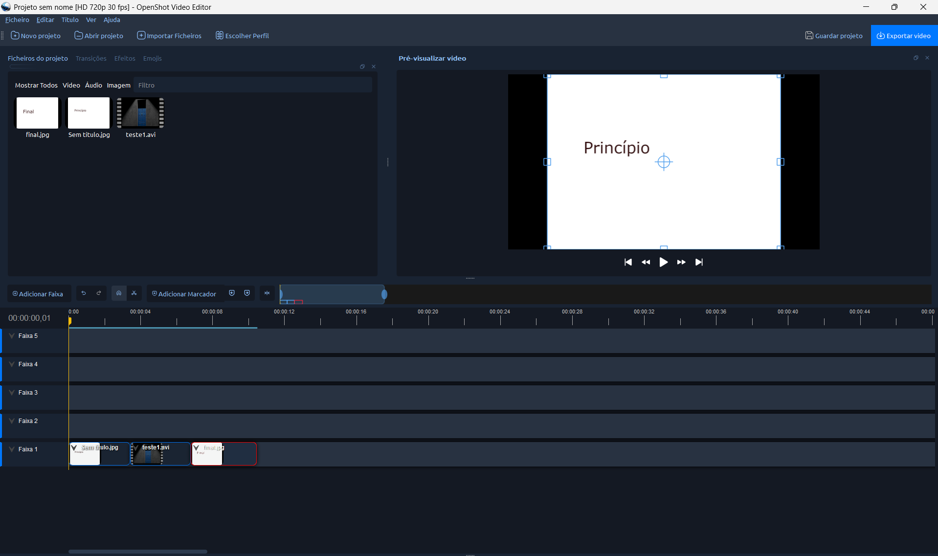 Inserção de legendas "Princípio" e "Final", para inserir no vídeo final.