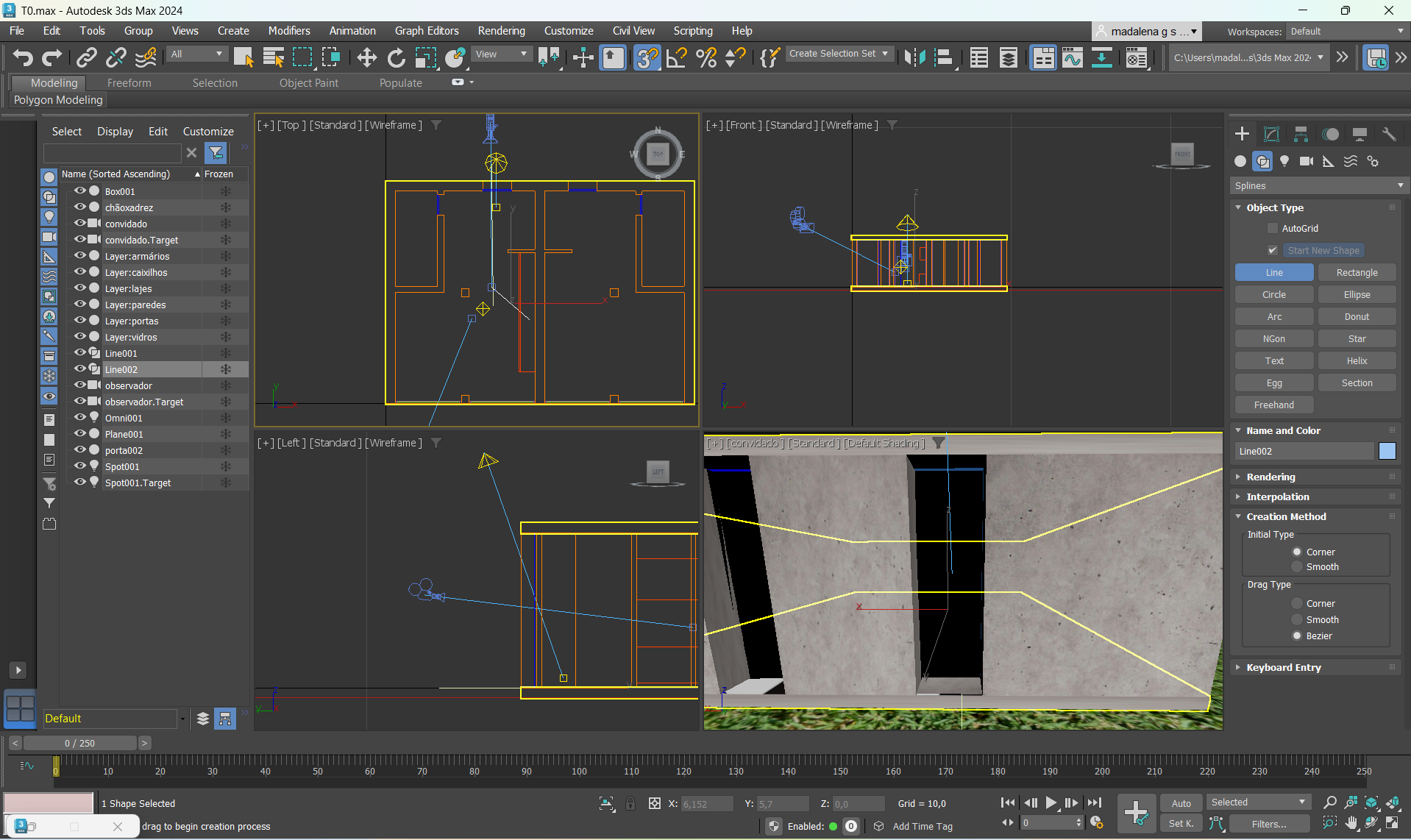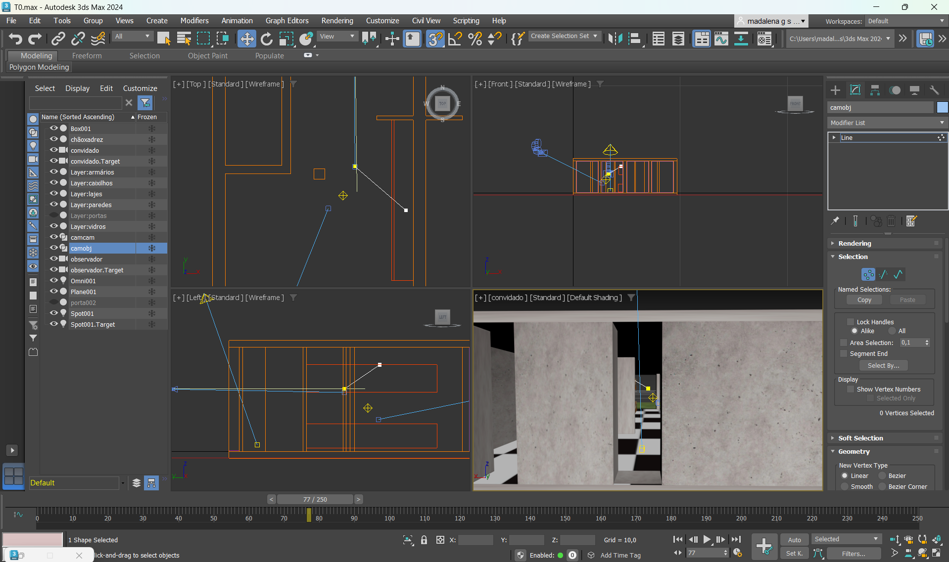 Criação de duas linhas que vão definir o percurso da animação da câmera "convidado". Mudança das suas coordenadas em z, que influenciam o olhar da câmera.