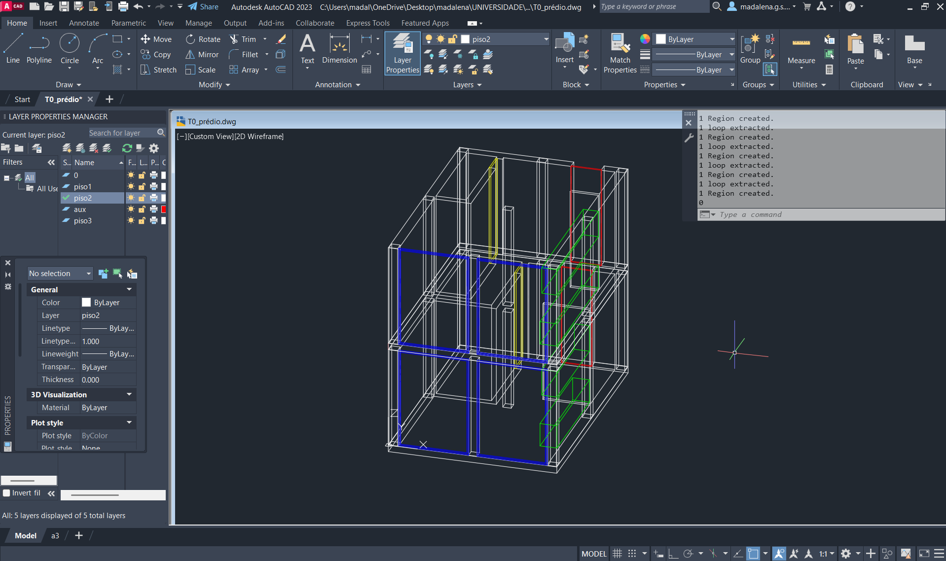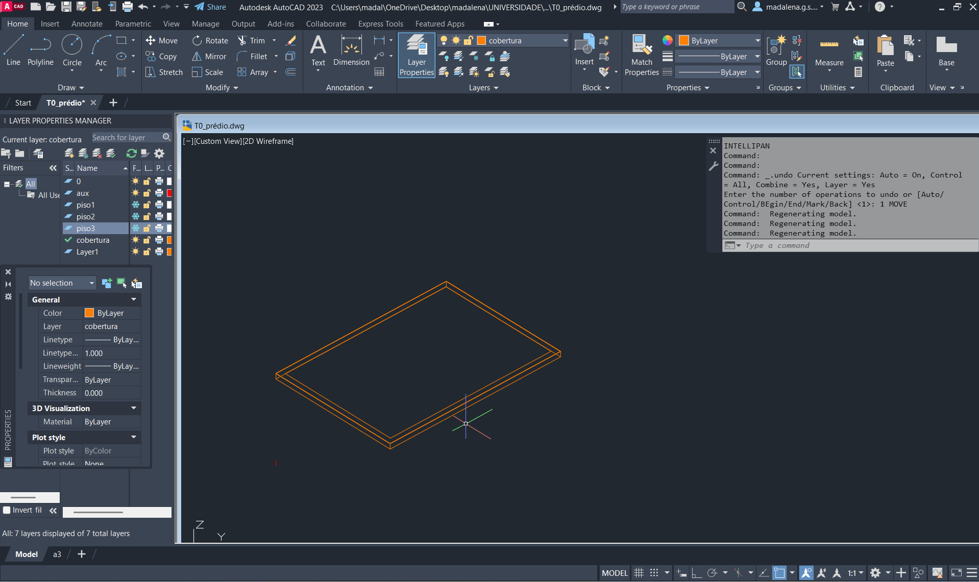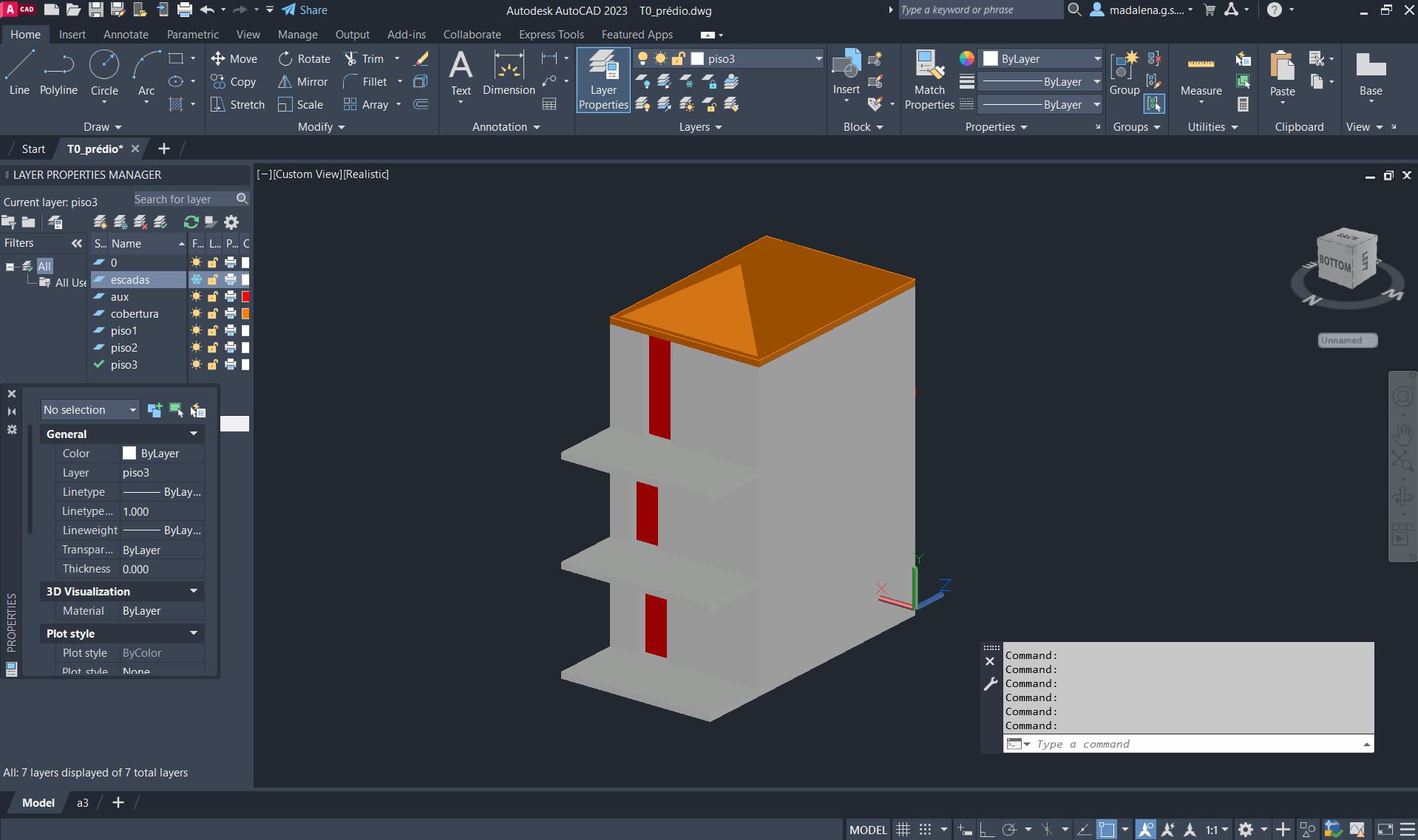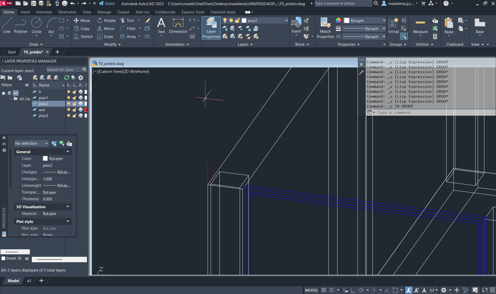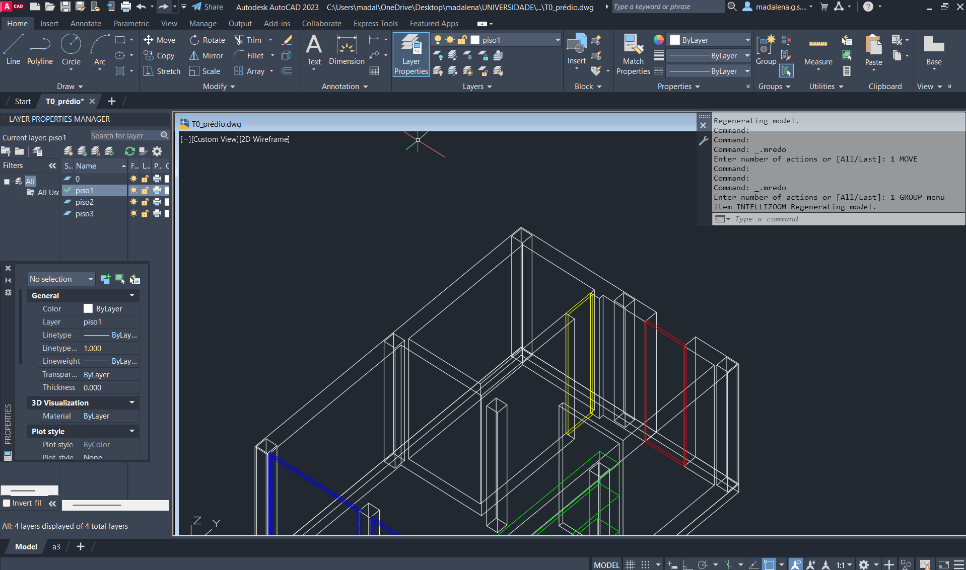 Criação de um novo ficheiro AutoCAD, para a execução de um prédio de três pisos (cada um numa layer diferente), através do comando anteriormente descarregado e utilizado: T0.
