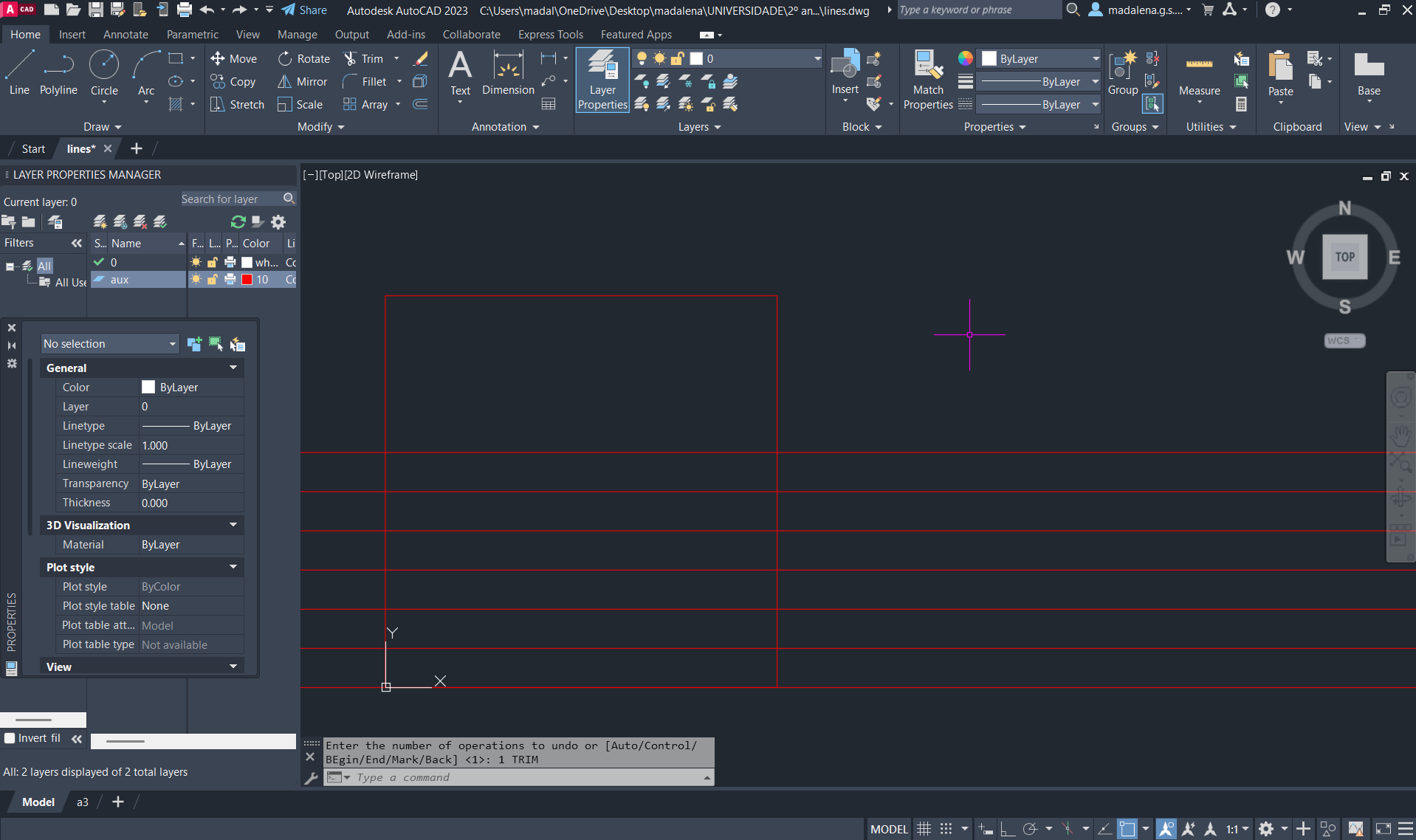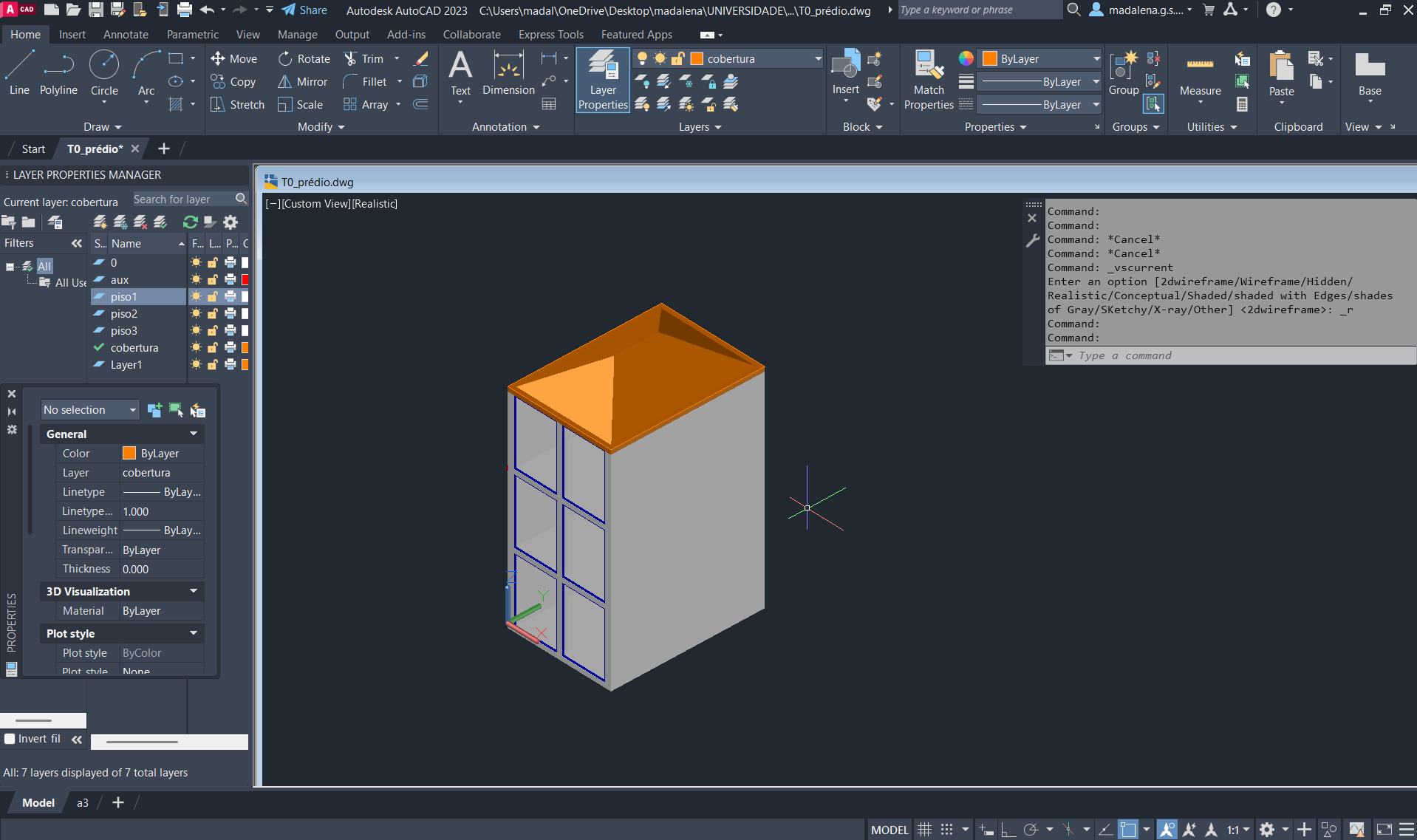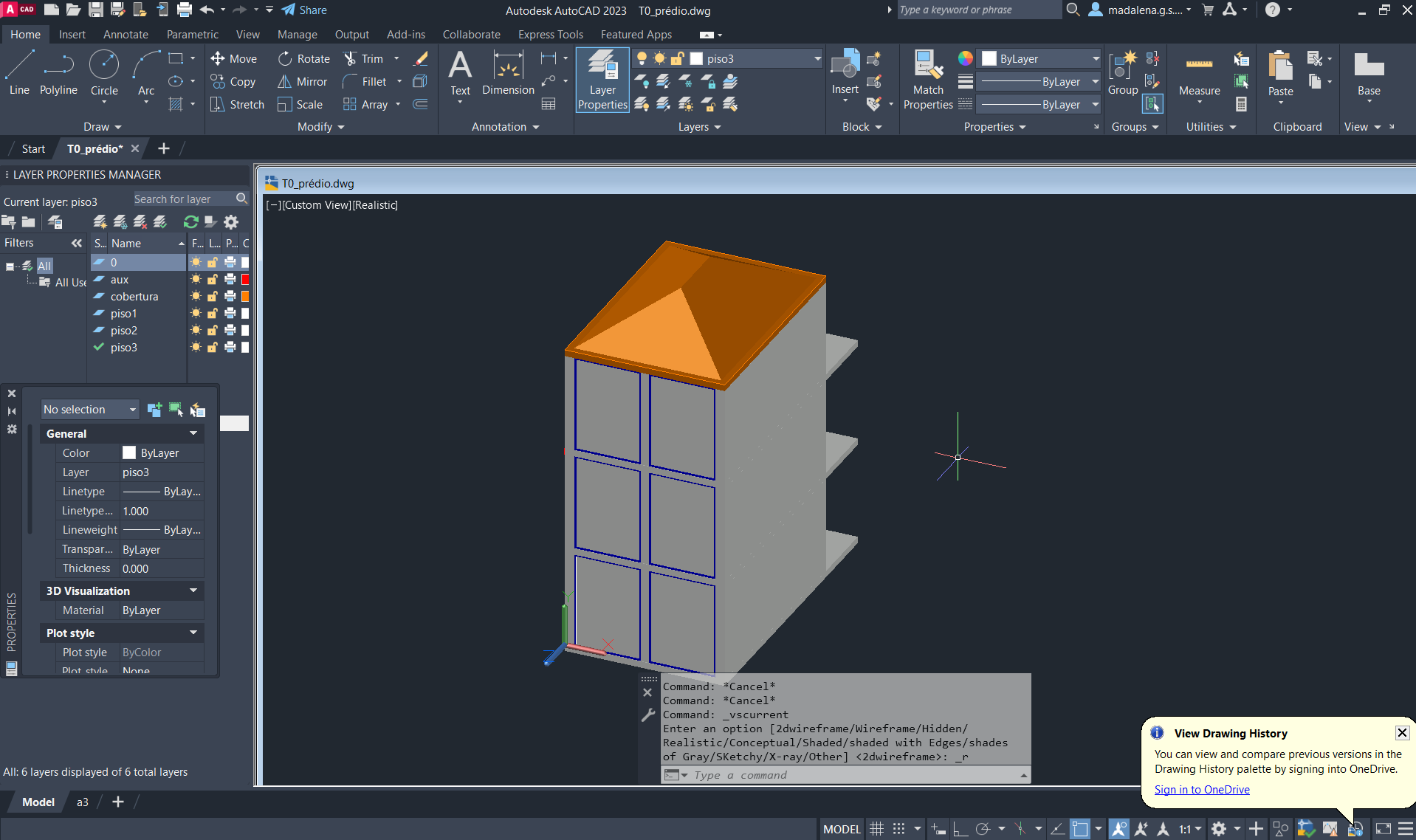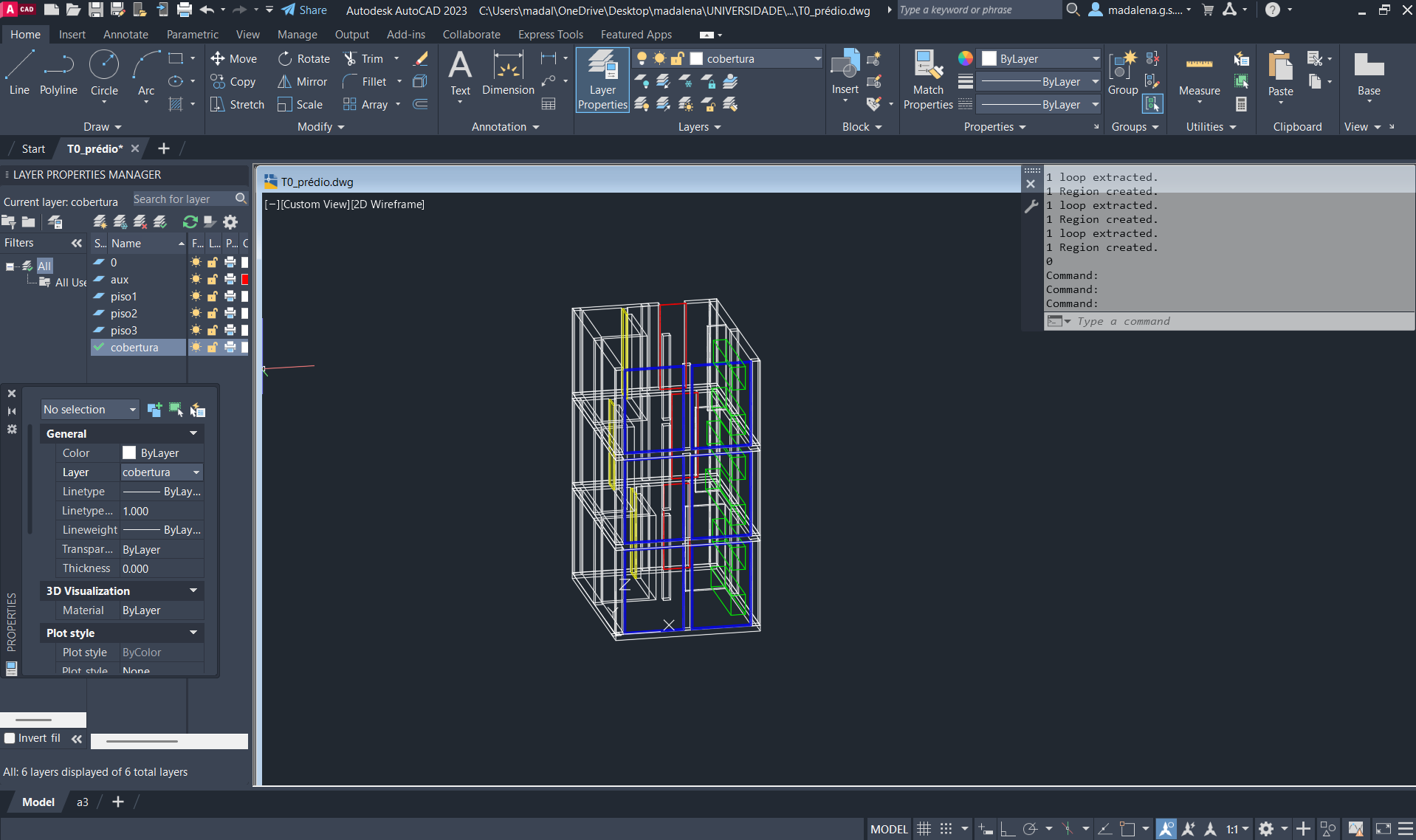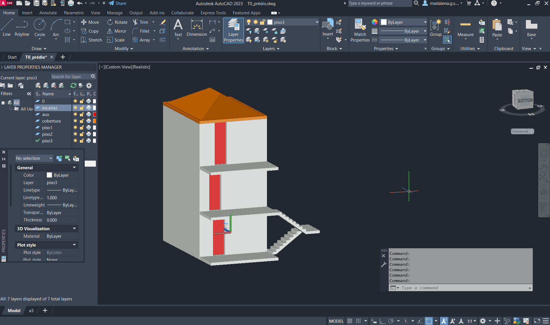 Criação de um novo ficheiro AutoCAD, para a execução de um prédio de três pisos (cada um numa layer diferente), através do comando anteriormente descarregado e utilizado: T0.