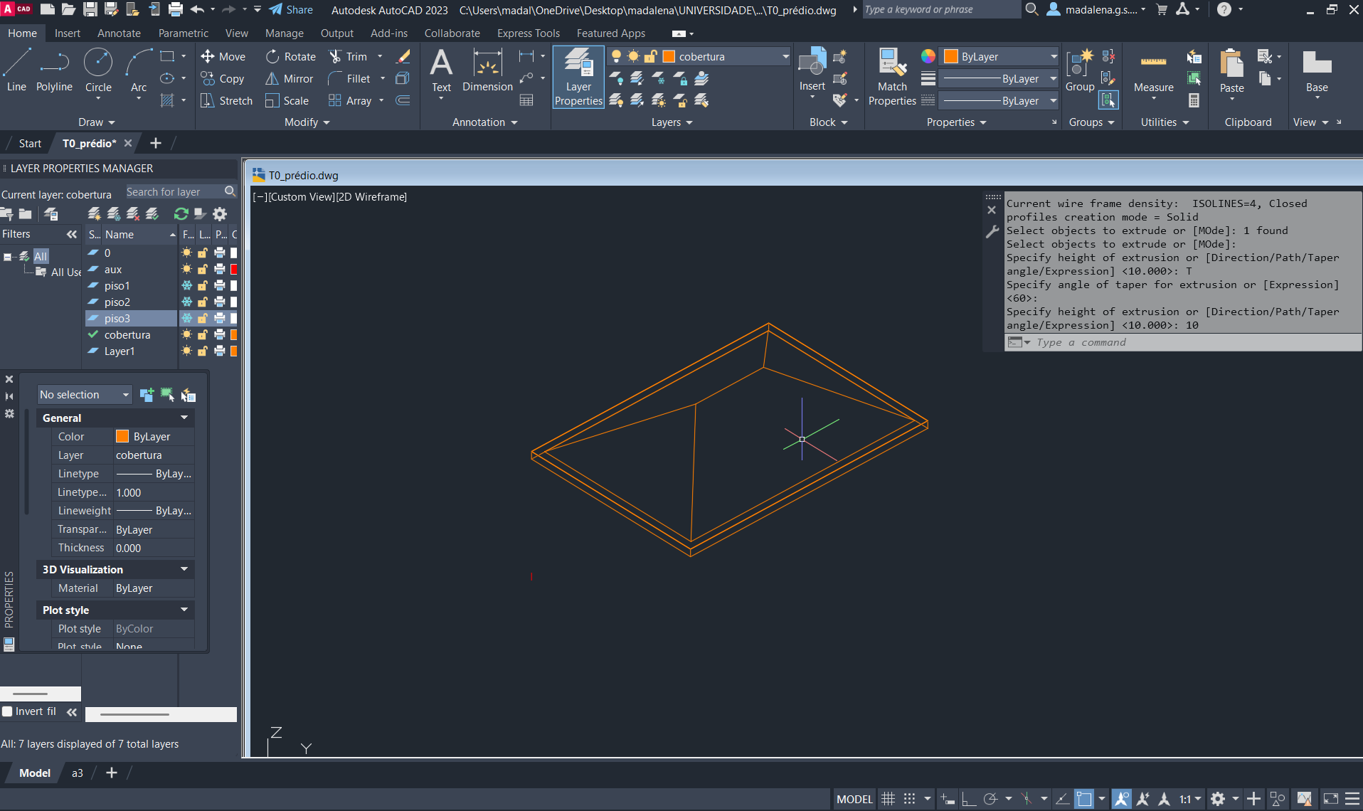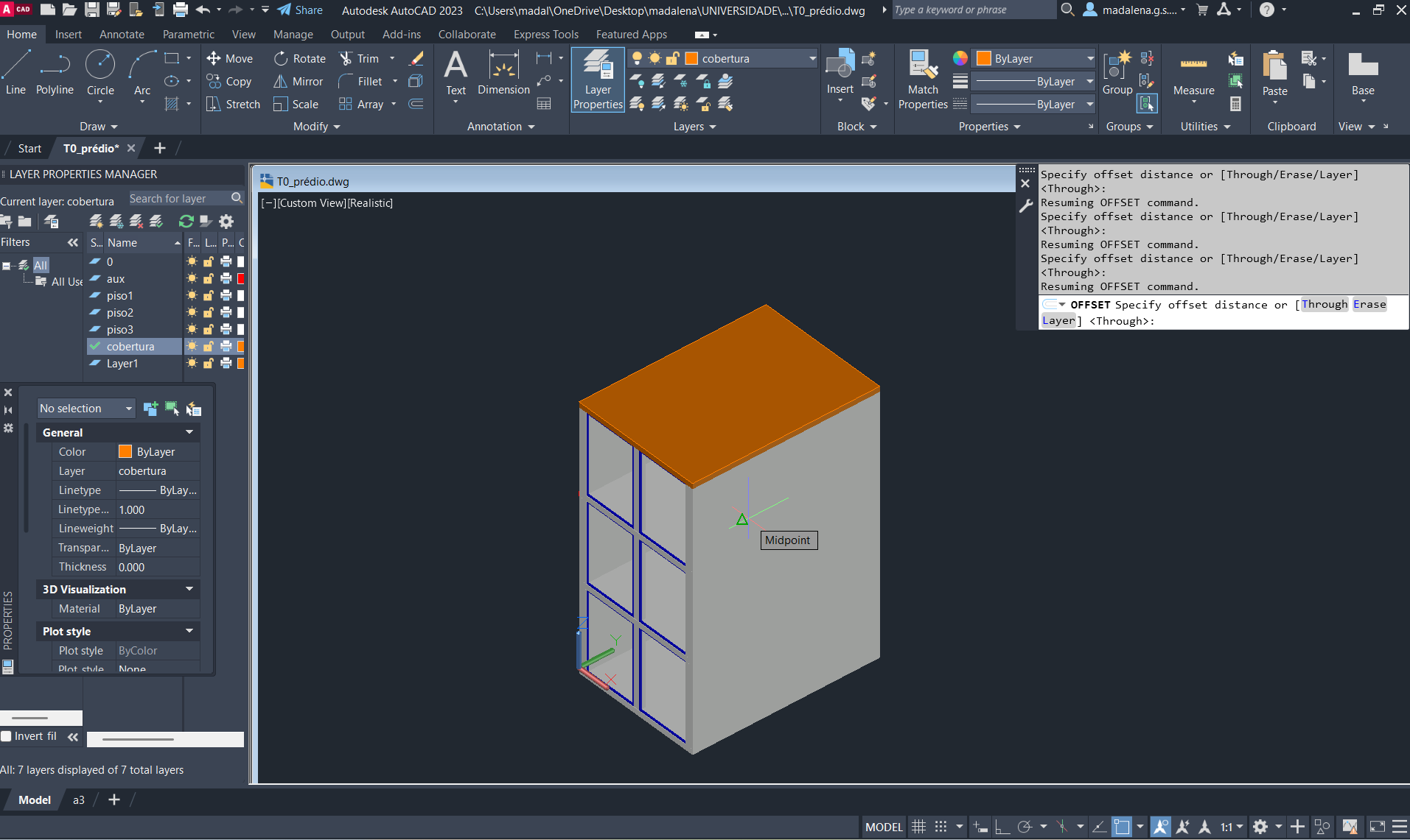 Colocação de uma cobertura inclinada no prédio, com ajuda dos comandos: RECTANGLE, EXTRUDE e OFFSET.
