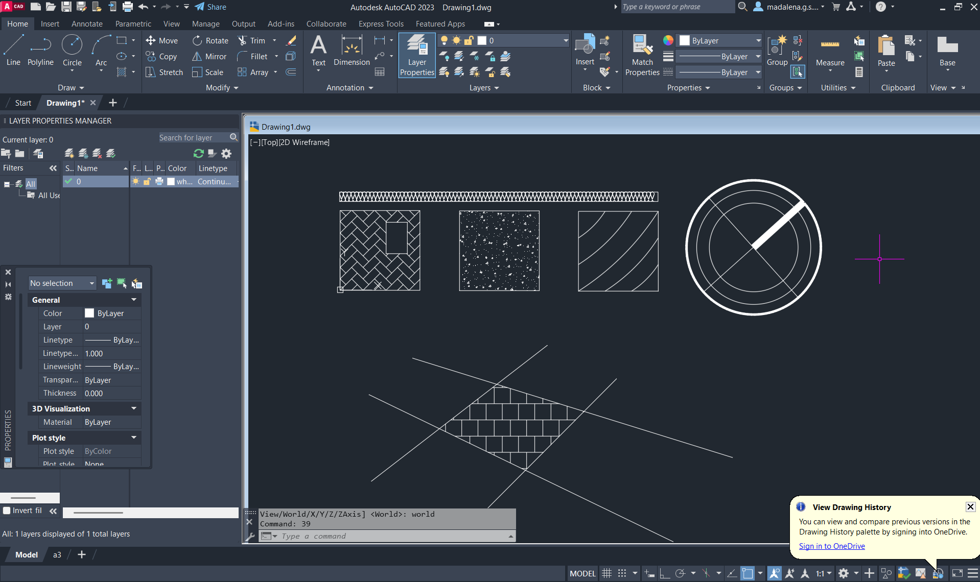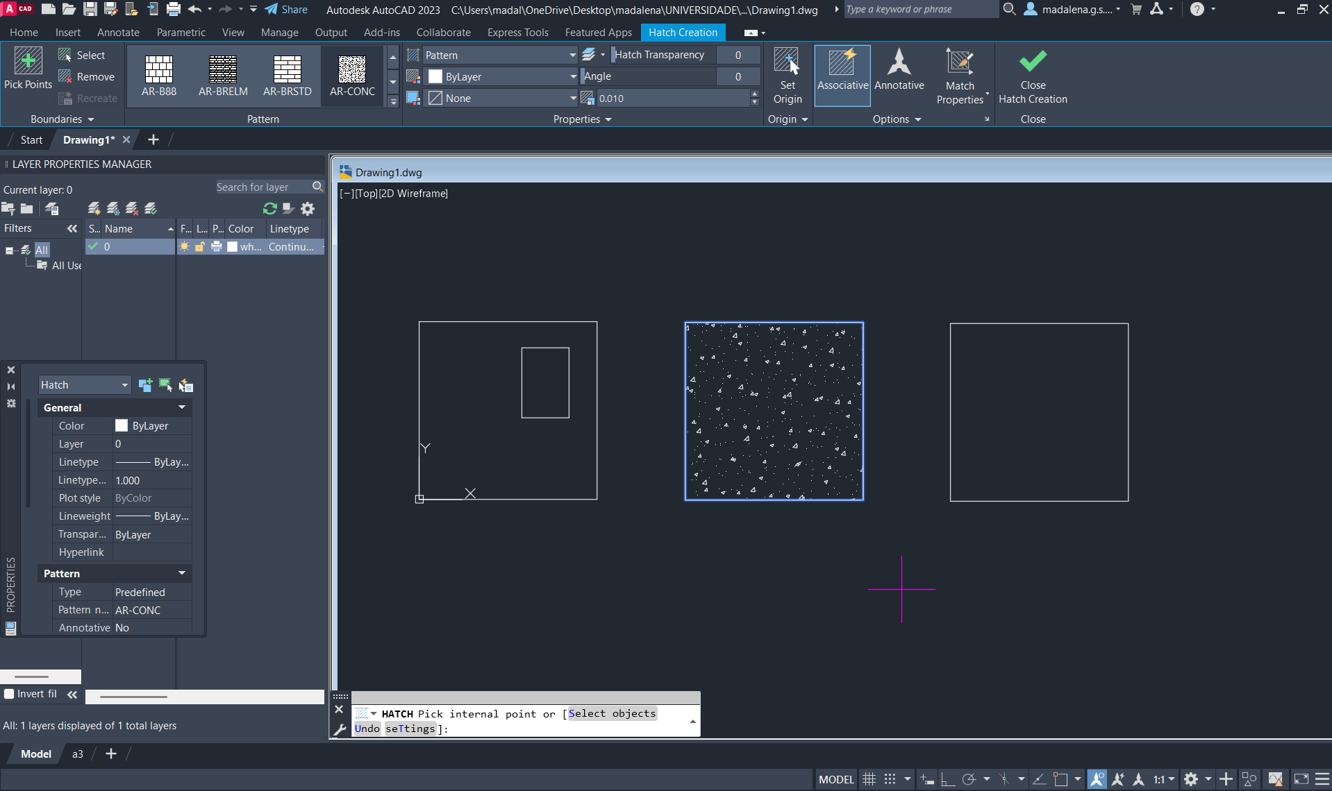 Criação de um retângulo no primeiro, e colocação de um preenchimento no segundo, através dos comandos: RECTANGLE e HATCH.