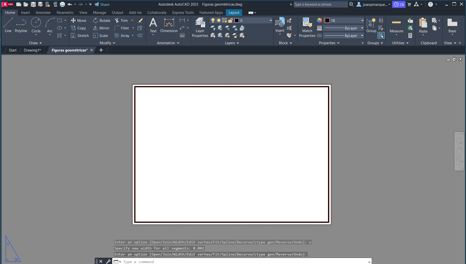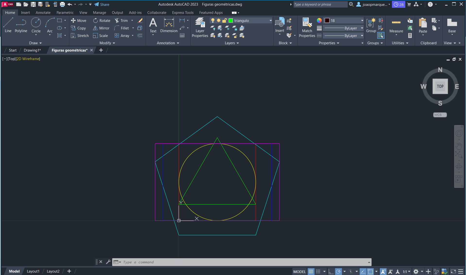 Criação de 6 polígonos em diferentes layers e com diferentes cores.Um quadrado (a vermelho), um círculo (a amarelo), um triângulo (a verde), um pentágono (a cyan), um retângulo R2 (a azul) e um retângulo com a regra de ouro (a magenta). Ficheiro posteriormente salvo no formato DWG. Reorganização das figuras geometricas, colocando os seus centros geometricos no ponto central do quadrado inicial.