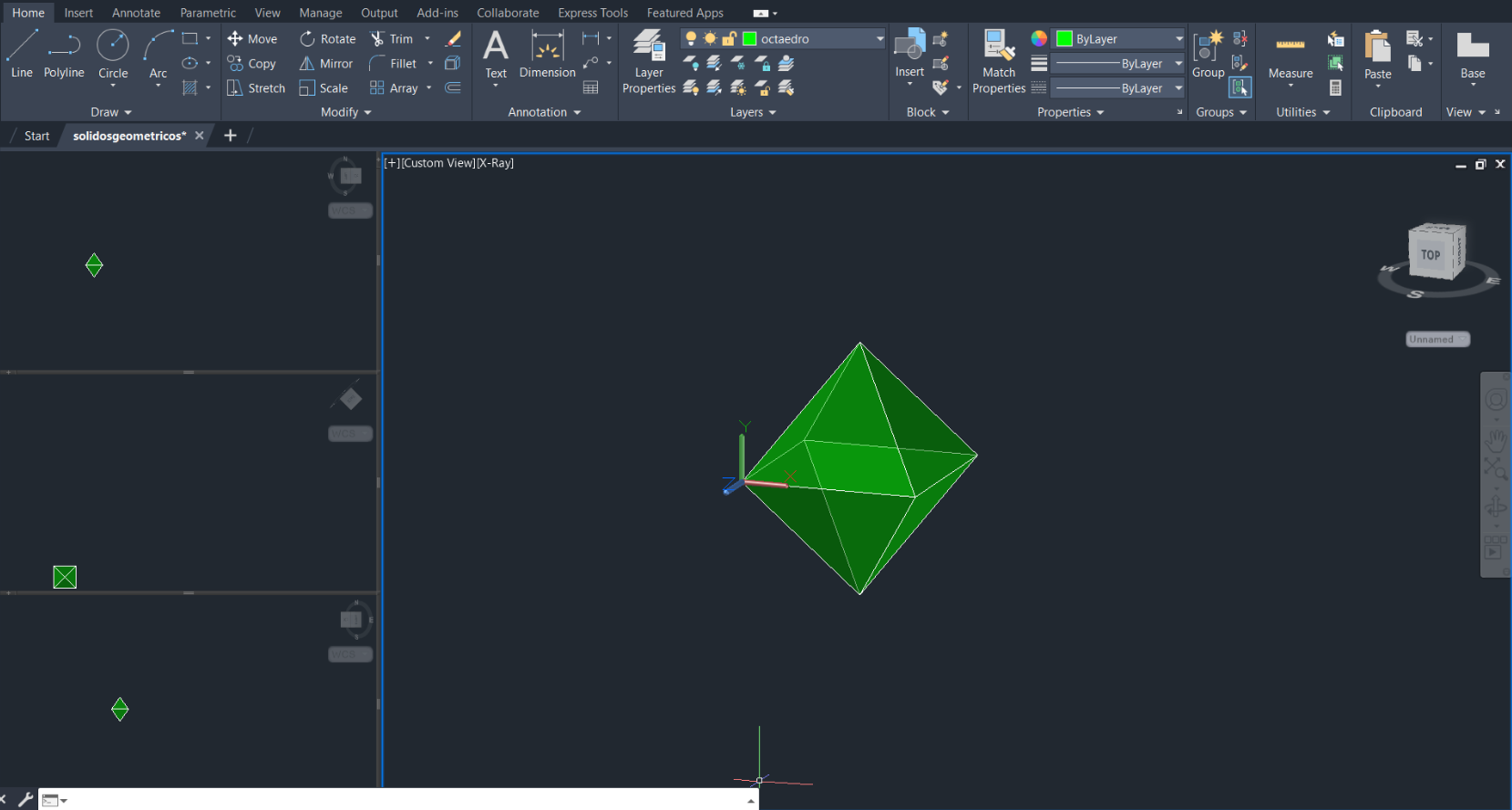- o octaedro a partir dos comandos LINE, UCS, CIRCLE, 3DPOLY, ARRAYCLASSIC MIRROR e SURFSCULPT.